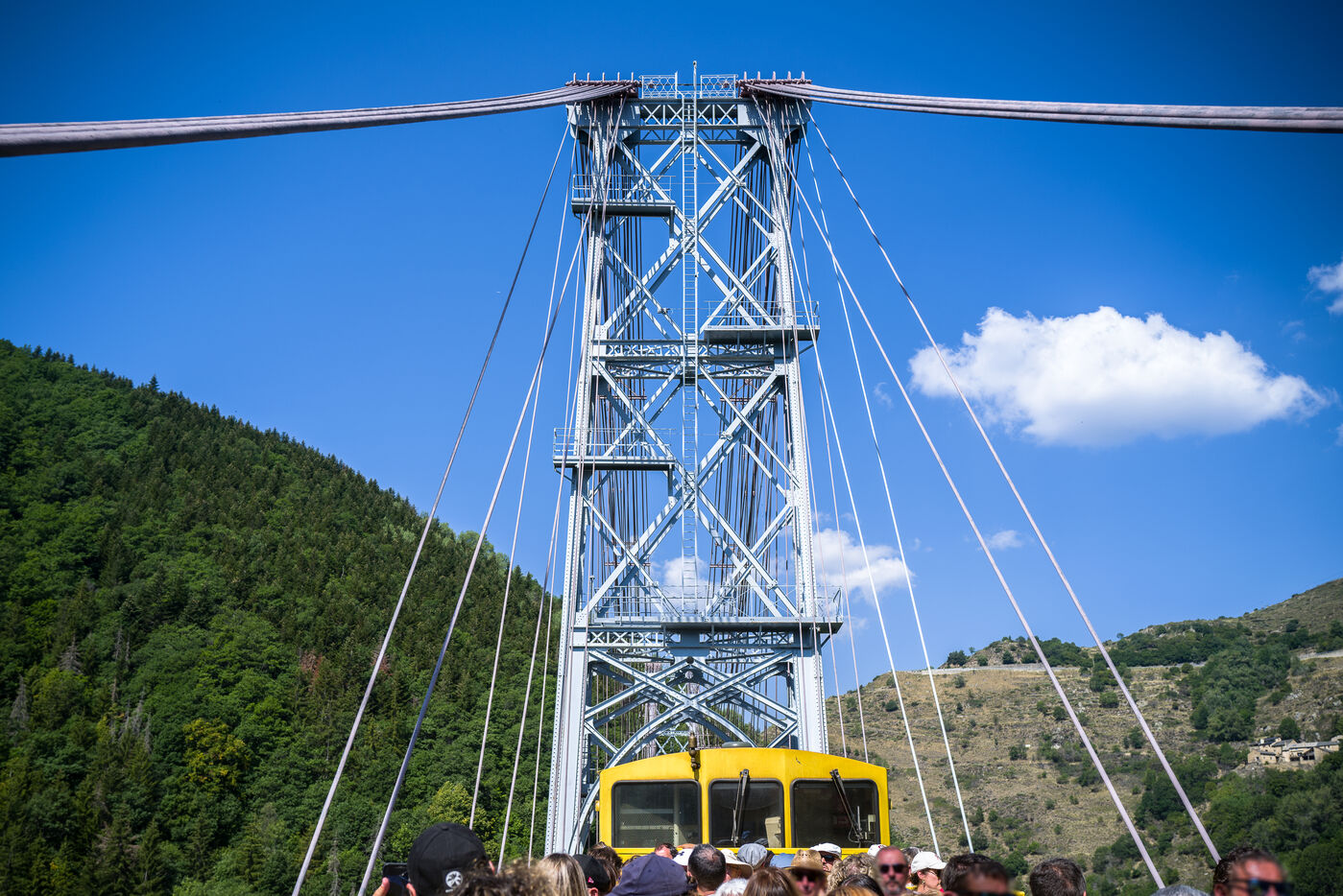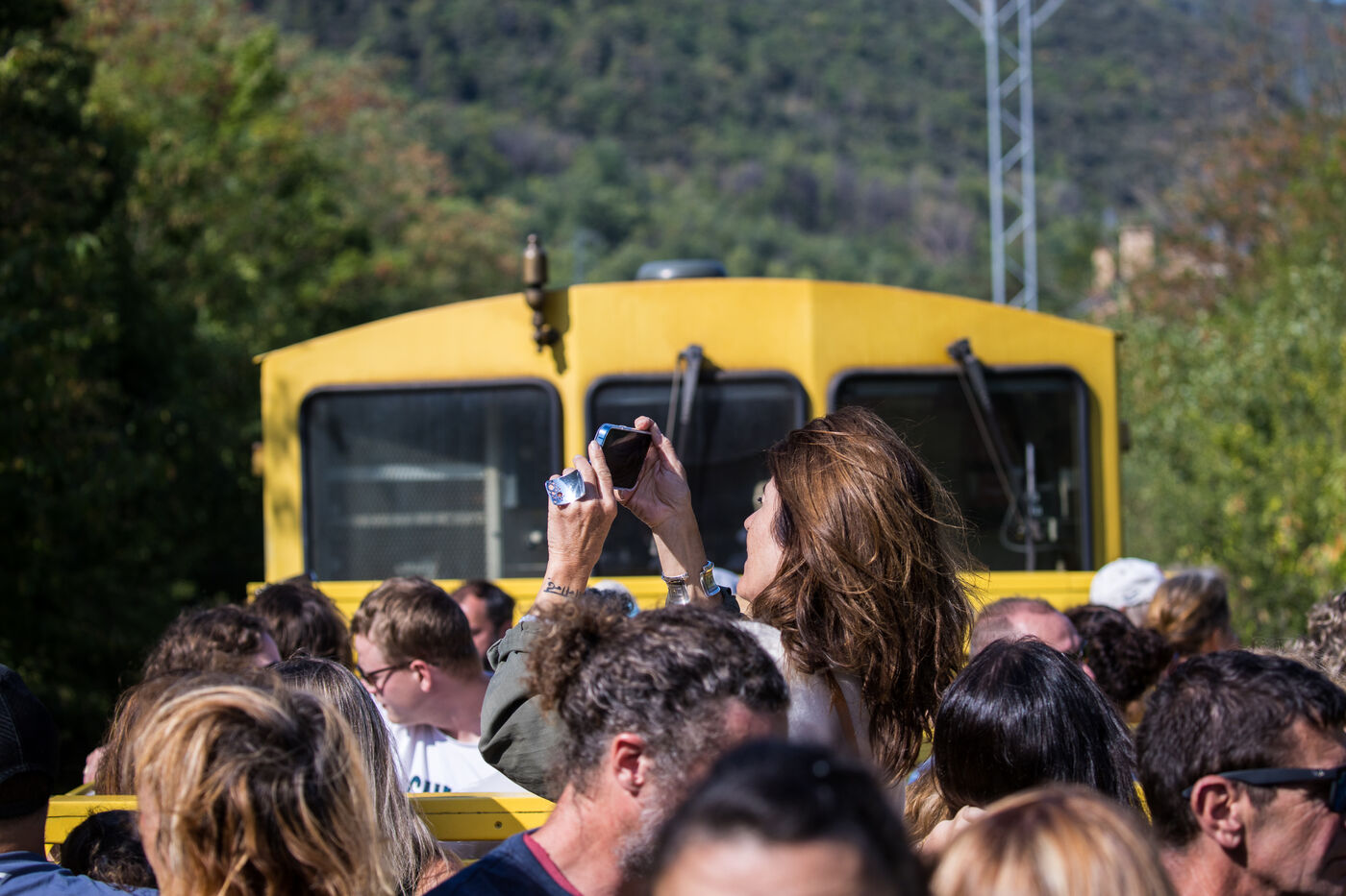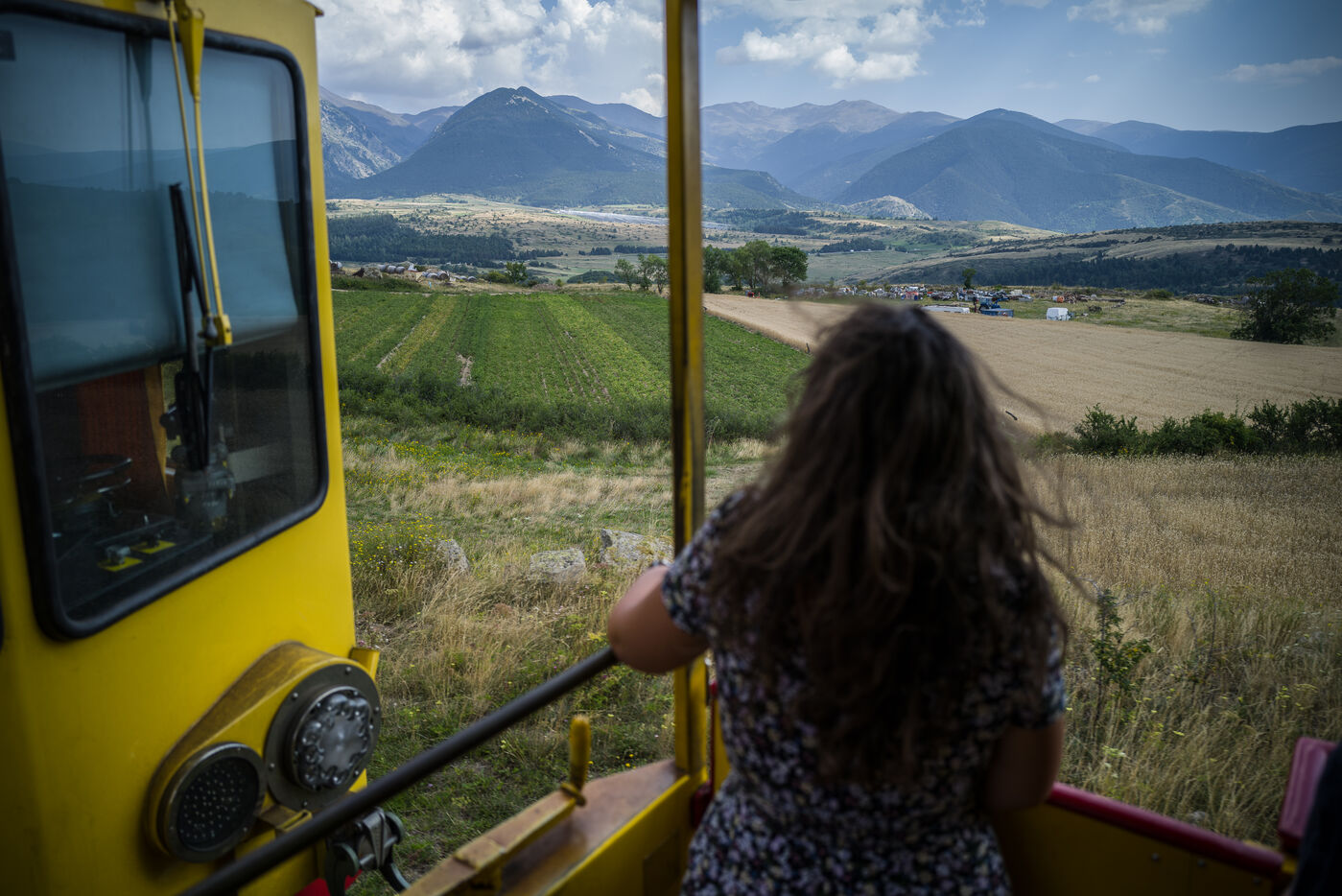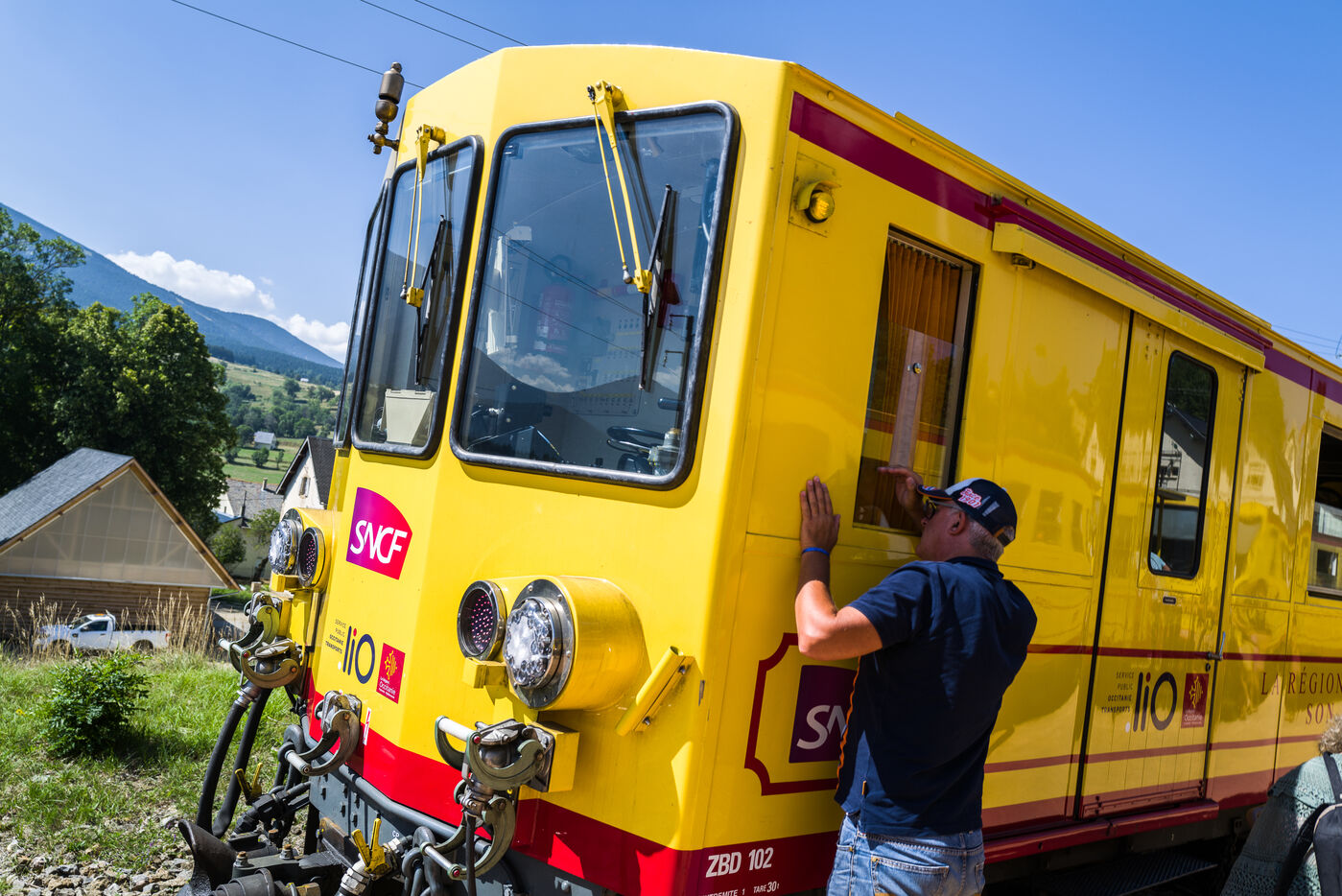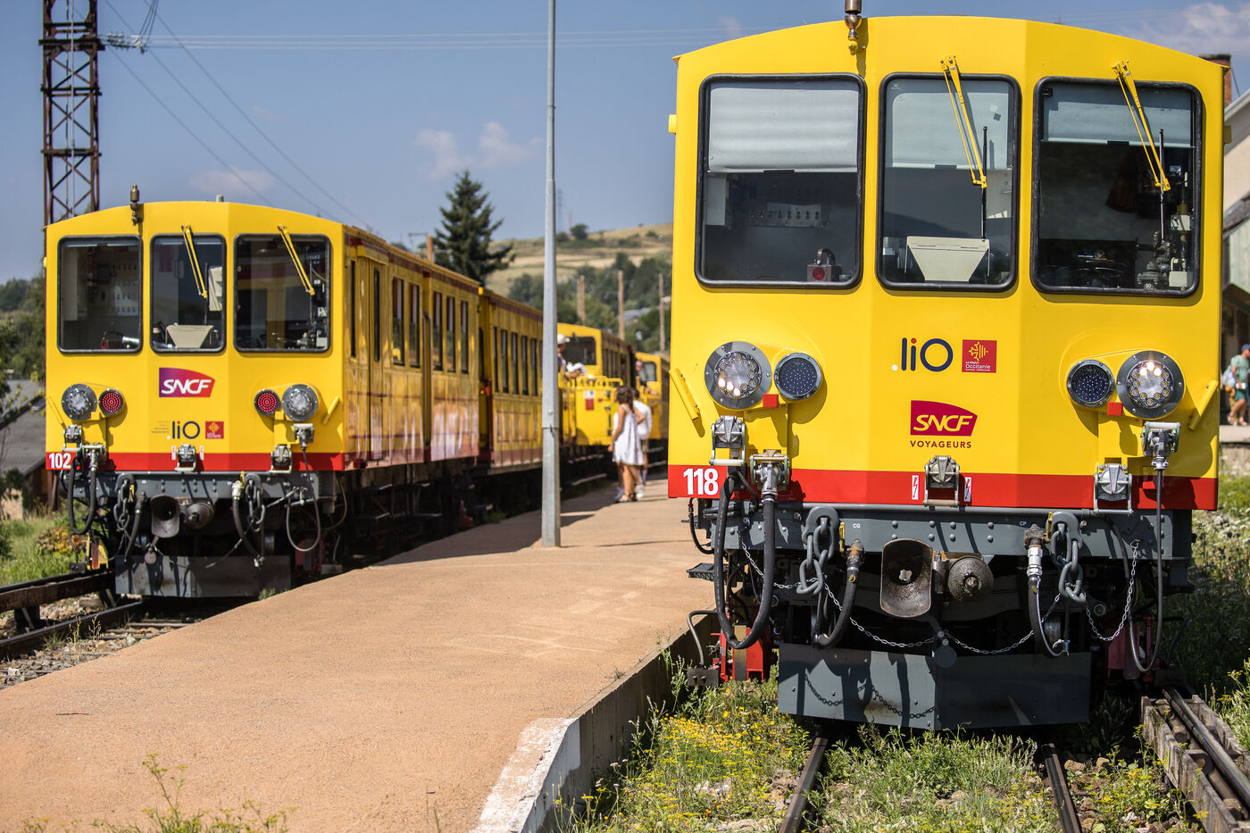 Tourists in the Yellow Train, also known as the Cerdagne line, this 62.5 km railway line in the Pyrénées-Orientales department connects Villefranche-Vernet-les-Bains station to Latour-de-Carol-Enveitg station via Font-Romeu.
