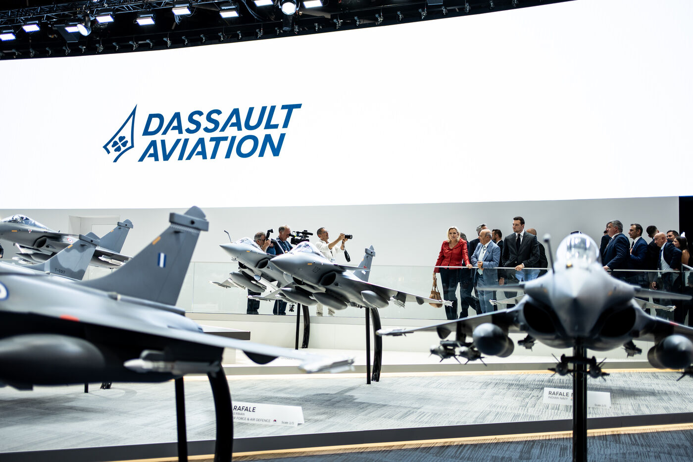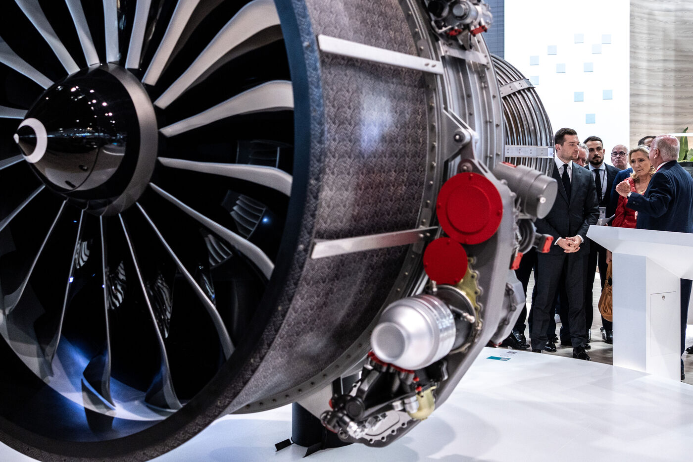 Marine le Pen et Jordan Bardella lors d'une visite à la 55e édition du Salon international de l'aéronautique et de l'espace à l'aéroport de Paris-Le Bourget, au Bourget, dans la banlieue de Paris.
