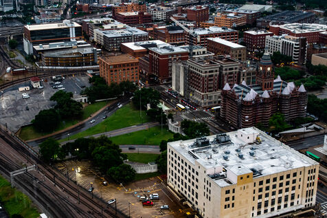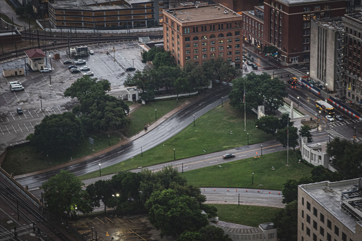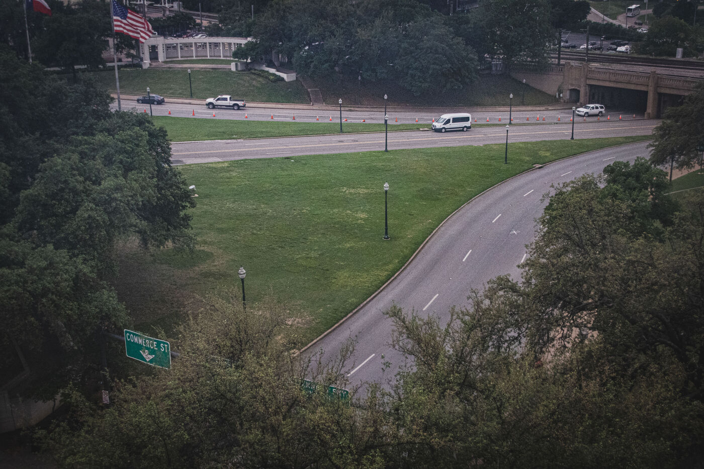 Through this series of photographs taken on April 30, 2019, the atmosphere of this memory-laden site is captured with precision. From the heights of Reunion Tower, the view embraces the city and the place where everything unfolded. The Texas School Book Depository, now transformed into a museum, recalls the presumed position of the shooter, Lee Harvey Oswald. A few meters away, a simple white cross on the asphalt marks the exact spot where Kennedy was fatally shot, while an American flag fluttering on a fence seems to stand guard over this past, frozen in history.