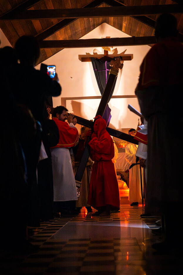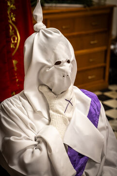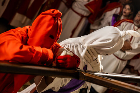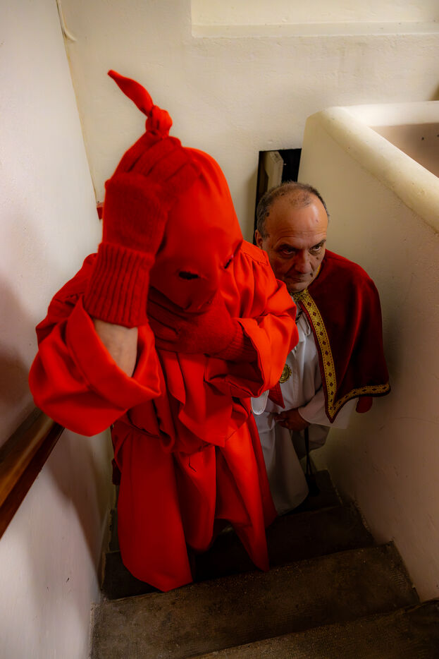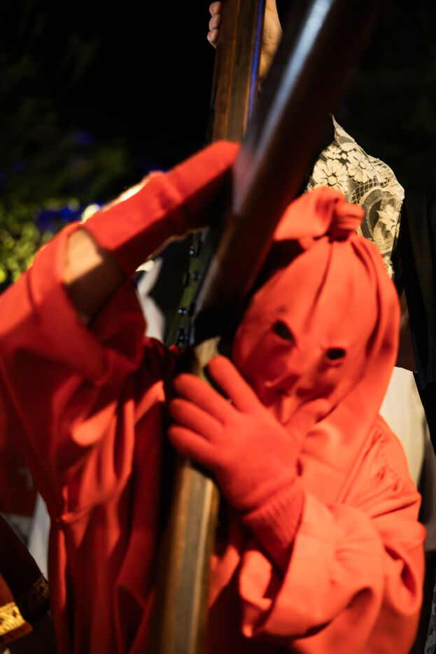 The anonymous red penitent carries the cross and chains. He falls, rises again, supported by the white penitent. Together, they embody the weight of guilt, the effort of redemption, and silent faith. Beside them, the brothers in red capes form a dense procession, paced by chants, silence, and the gravity in their eyes.