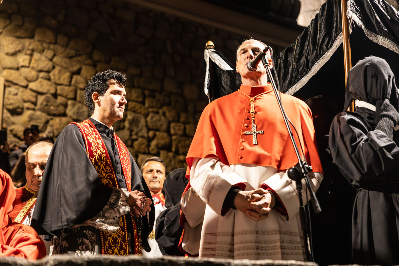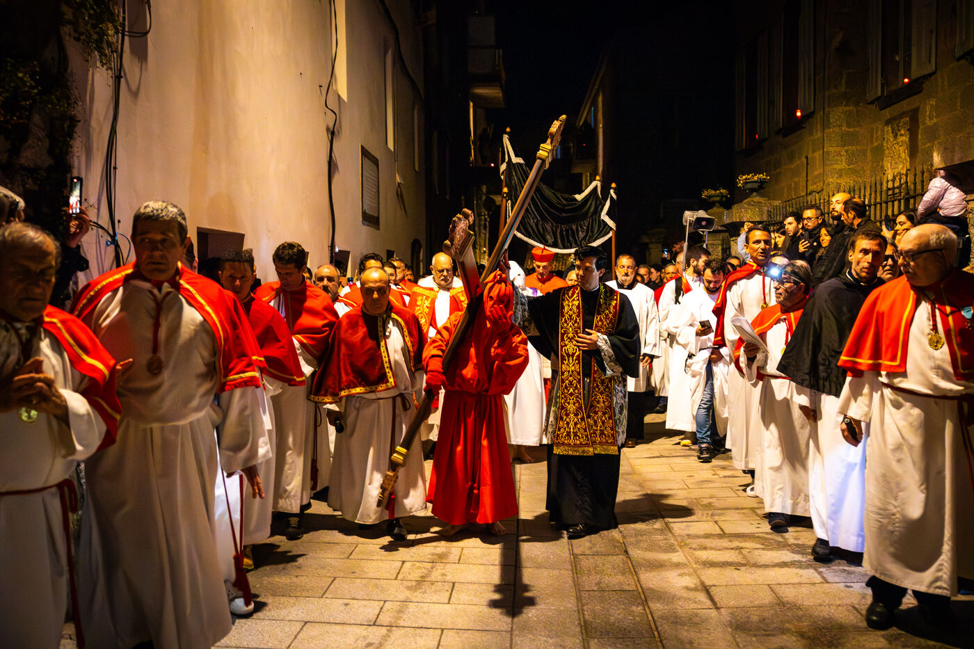 Le pénitent rouge, anonyme, porte la croix et les chaînes. Il chute, se relève, soutenu par le pénitent blanc. Ensemble, ils incarnent le poids de la faute, l’effort de la rédemption et la foi silencieuse. À leurs côtés, les confrères en cape rouge forment une procession dense, rythmée par les chants, le silence, et la gravité des regards.