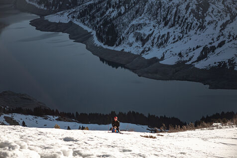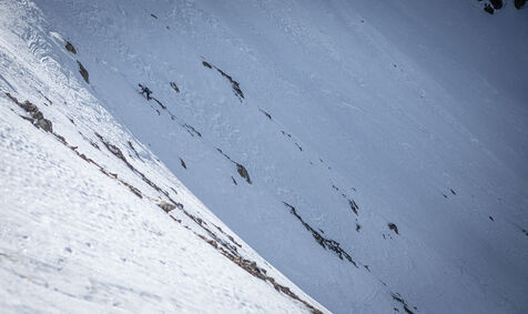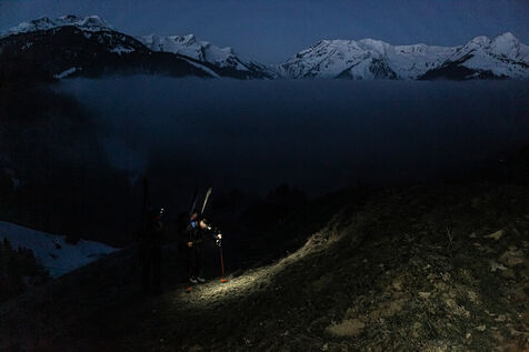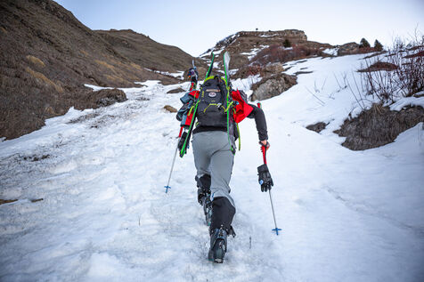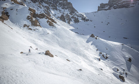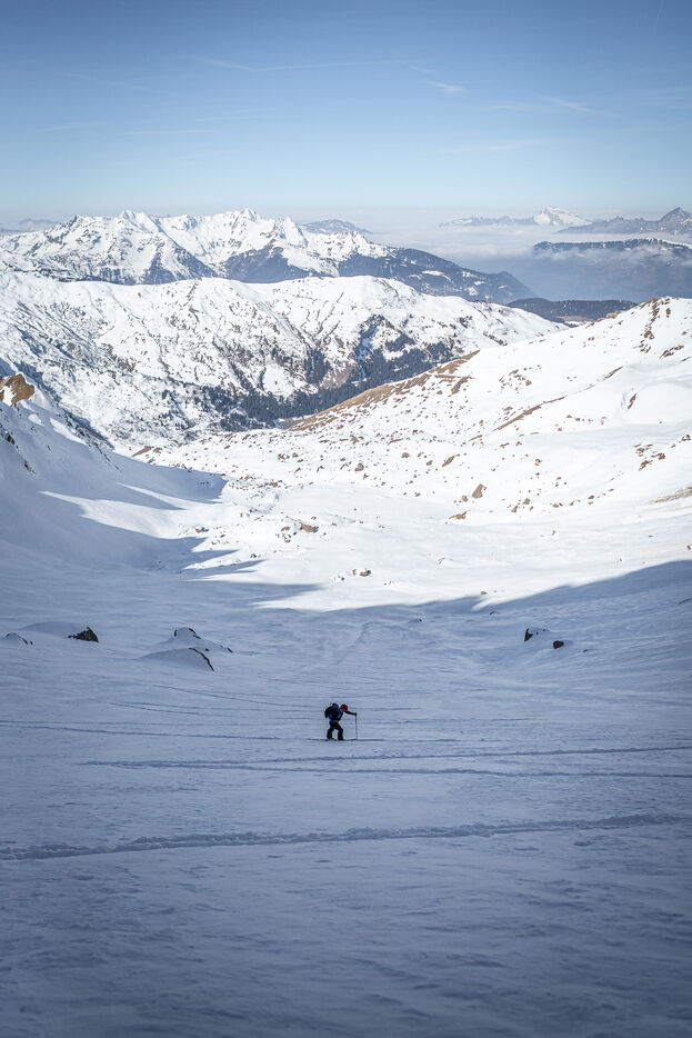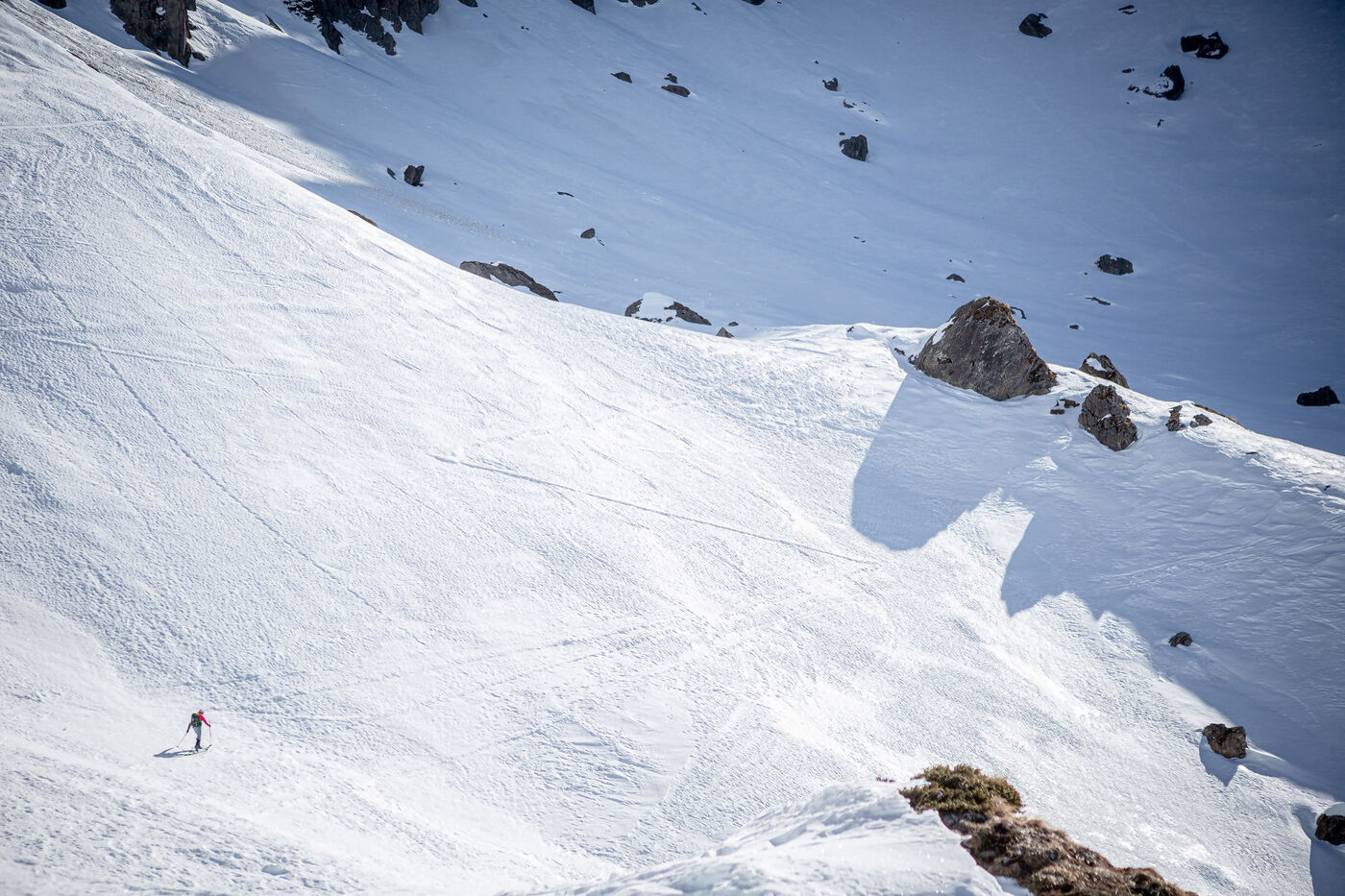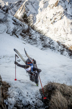 Une journée de randonnée à ski alpinisme dans le massif de la Pierra Menta. Les conditions nivologiques très sèches de cette année modifient grandement le cheminement et obligent à porter souvent les skis.