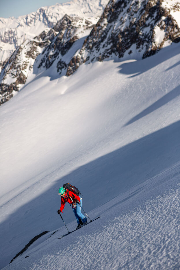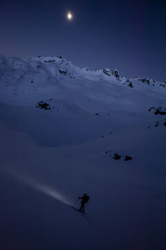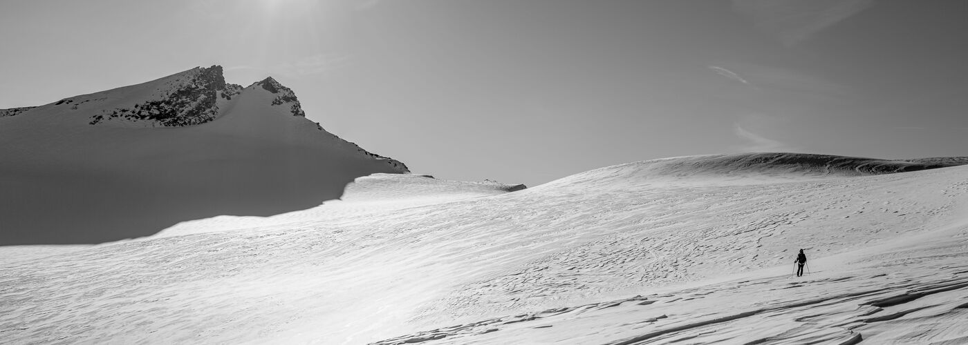 Gravir le Ruitor, mètre après mètre, seuls et silencieux, d'une nuit noire et glaciale, accompagnés par le réveil du soleil. Ascension à skis par le glacier du Grand.