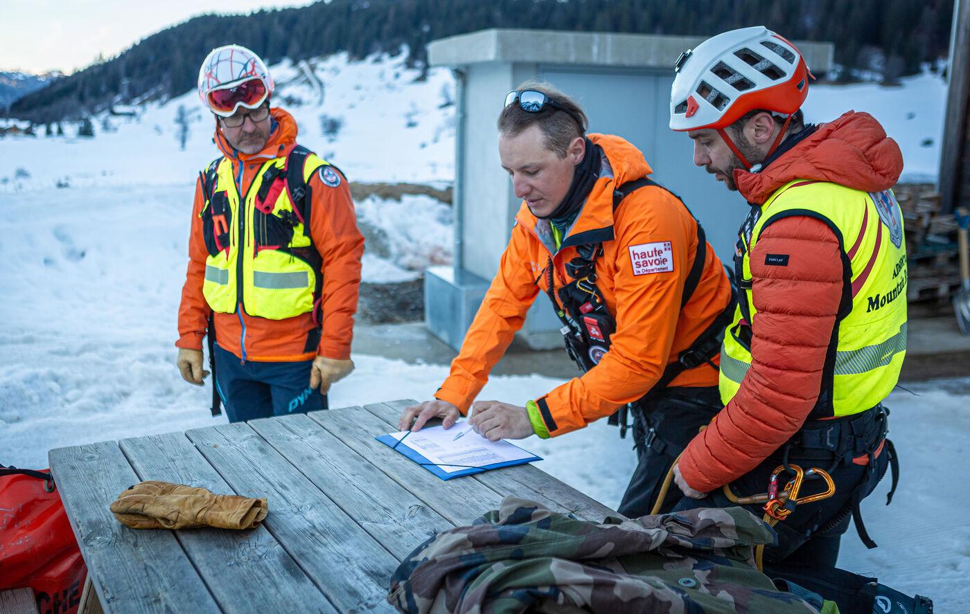 Mountain rescue teams of Haute-Savoie (ADSSM74) train in search of avalanche victims and rope manipulation for their winter interventions under the supervision of the PGHM and GMSP74.