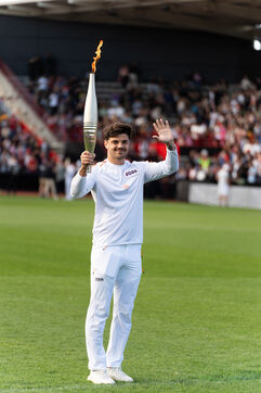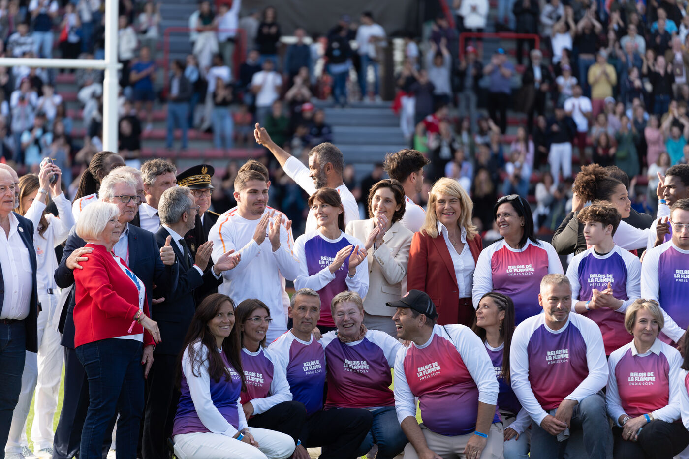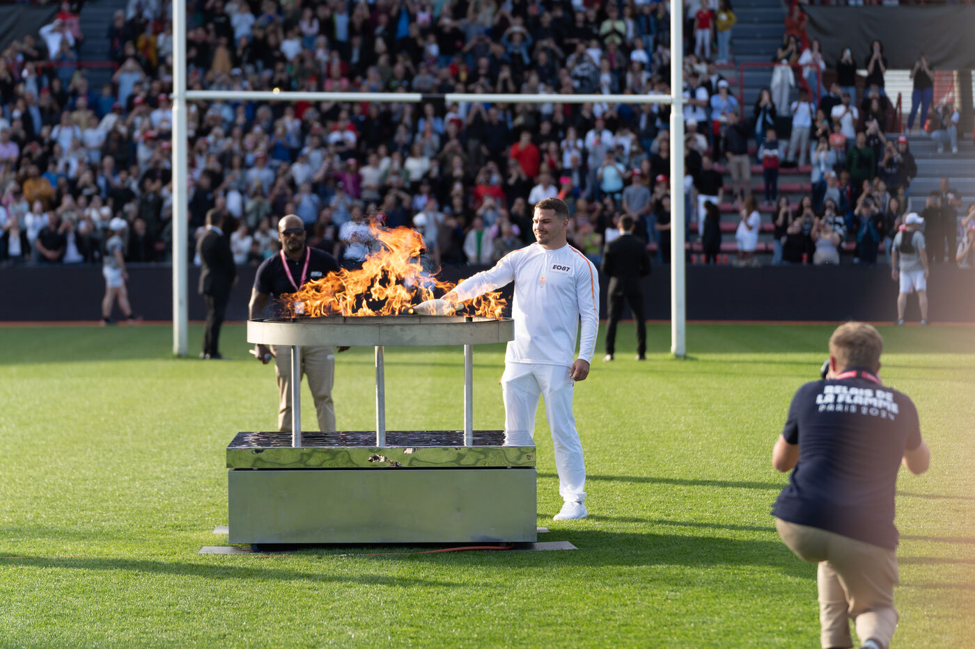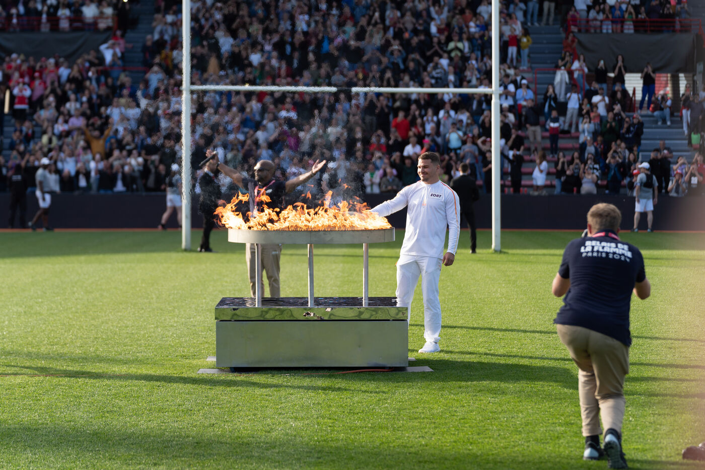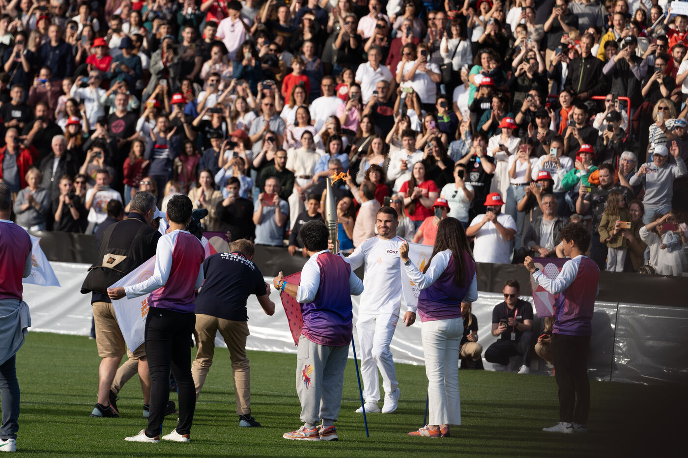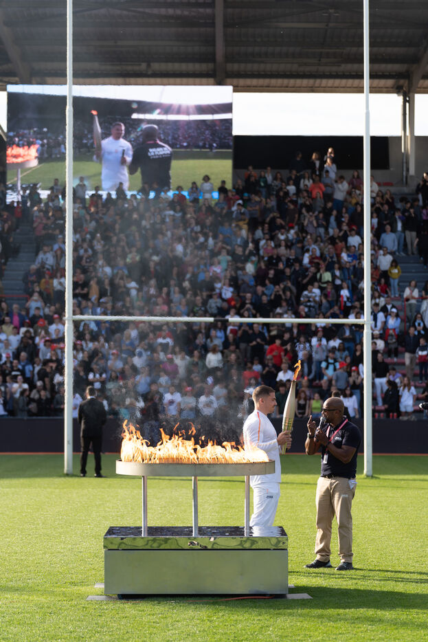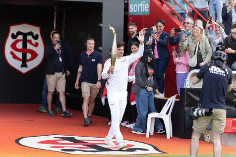 The Olympic flame passed by Toulouse on its way to Paris. Celebrities such as the local rappers Big Flo and Oly, the rugbymen Vincent Clerc, Emile et Romain N'Tamac as well as ordinary people carried the flame from Place Satin-Cyprien all the way to the Stade Toulousain, where Antoine Dupont (rugby player France national team and in the Stade Toulousain) lit the olympic bowl in the presence of the Minister of Sports and Olympic Games Amélie Oudéa-Castéra, the Minister Delegate of the Minister of Interior and of the Minister of Ecologic Transition Dominique Faure.