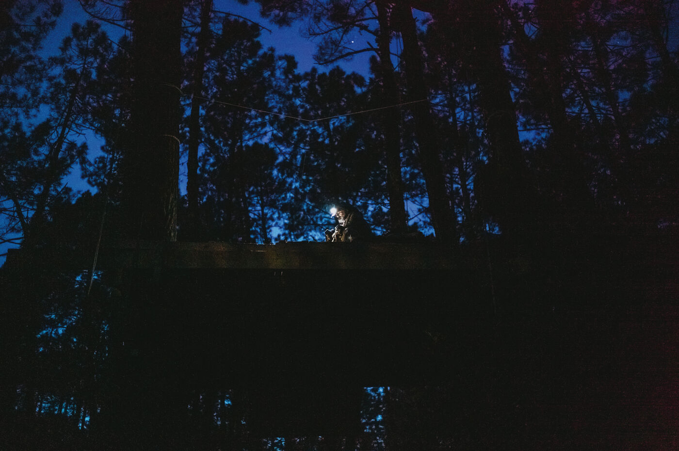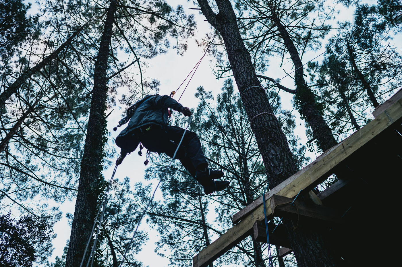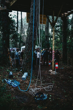 France, Soorts-Hossegor, January 8, 2025, Environmental activists took to the trees in the forest between Hossegor and Seignosse (Landes) to protest against the project selected by RTE (Reseau de Transport d Electricite) for its interconnection of a Very High Voltage (VHV) line beetween France and Spain. Four cables will be buried over 400km between northern Gironde and Bilbao. In the Landes region, local residents are very concerned about the consequences for their health and the environment. The action here is coordinated by the environmental movement Extinction Rebellion (XR). Photograph by Guillaume FAUVEAU / HANS LUCAS.