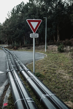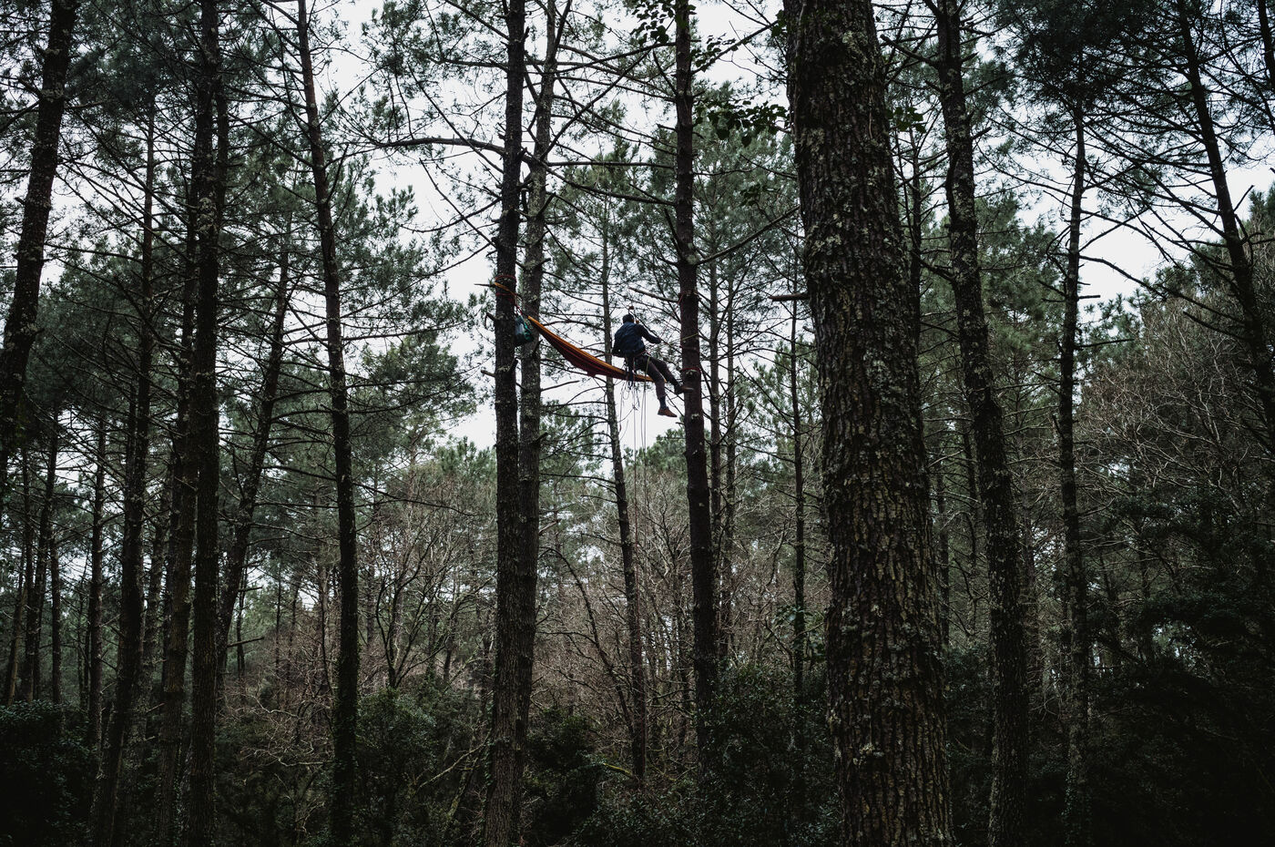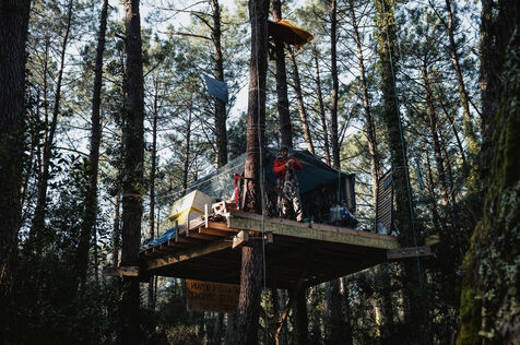 France, Soorts-Hossegor, January 14, 2025, Environmental activists took to the trees in the forest between Hossegor and Seignosse (Landes) to protest against the project selected by RTE (Reseau de Transport d Electricite) for its interconnection of a Very High Voltage (VHV) line beetween France and Spain. Four cables will be buried over 400km between northern Gironde and Bilbao. In the Landes region, local residents are very concerned about the consequences for their health and the environment.