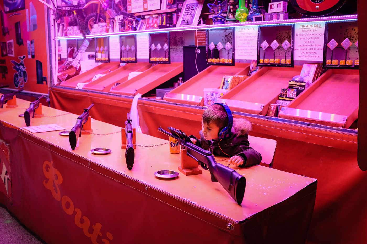 Une ambiance si particulière que la fête foraine la nuit. Les couleurs des néons, le bruit des manèges, des jeux, de la musique, les appels du pied au micro pour venir tirer une peluche ou tenter sa chance aux jeux. Puis les odeurs de confiserie qui se mêlent à celle des snacks . . .