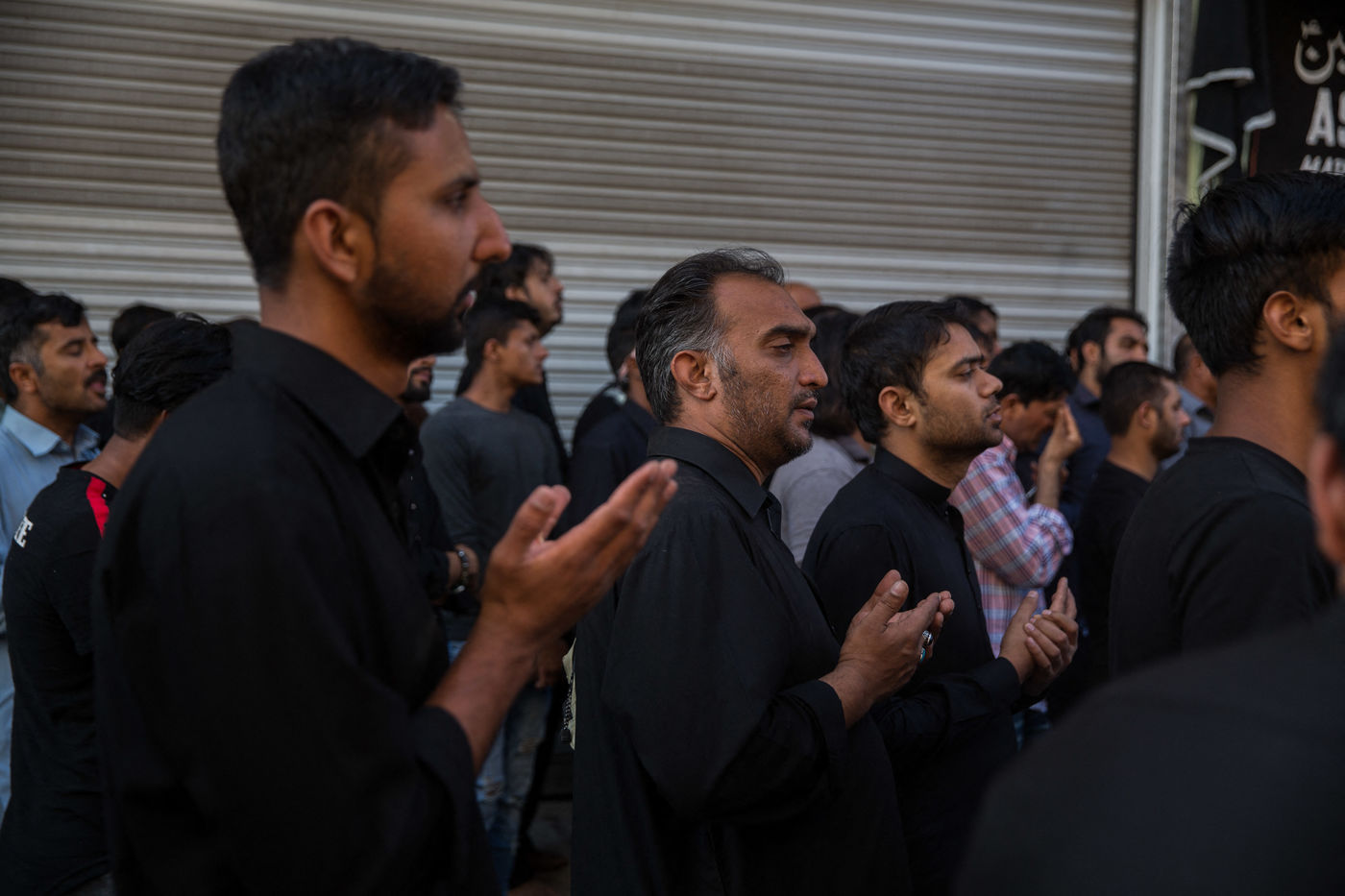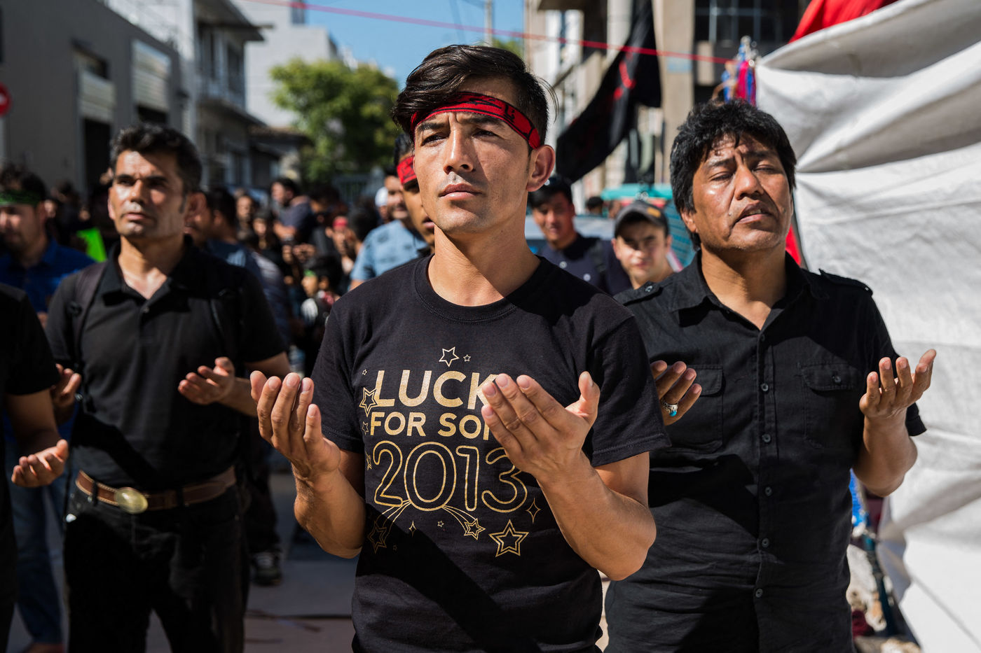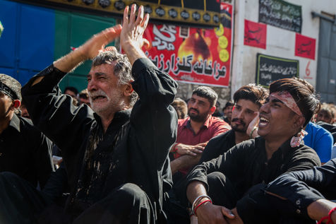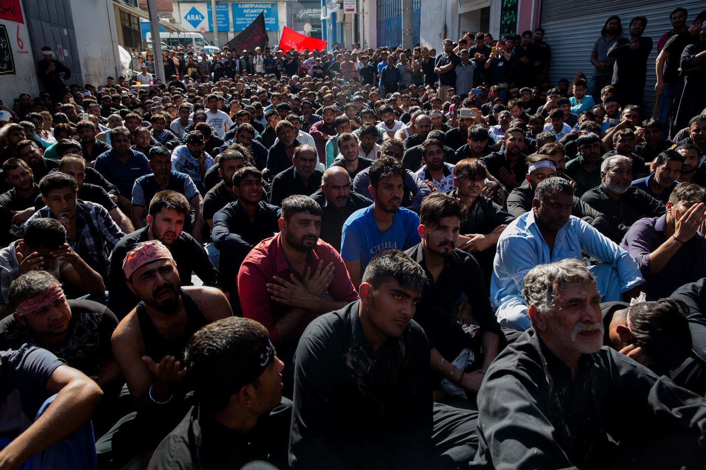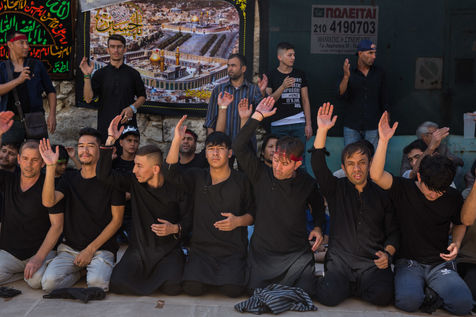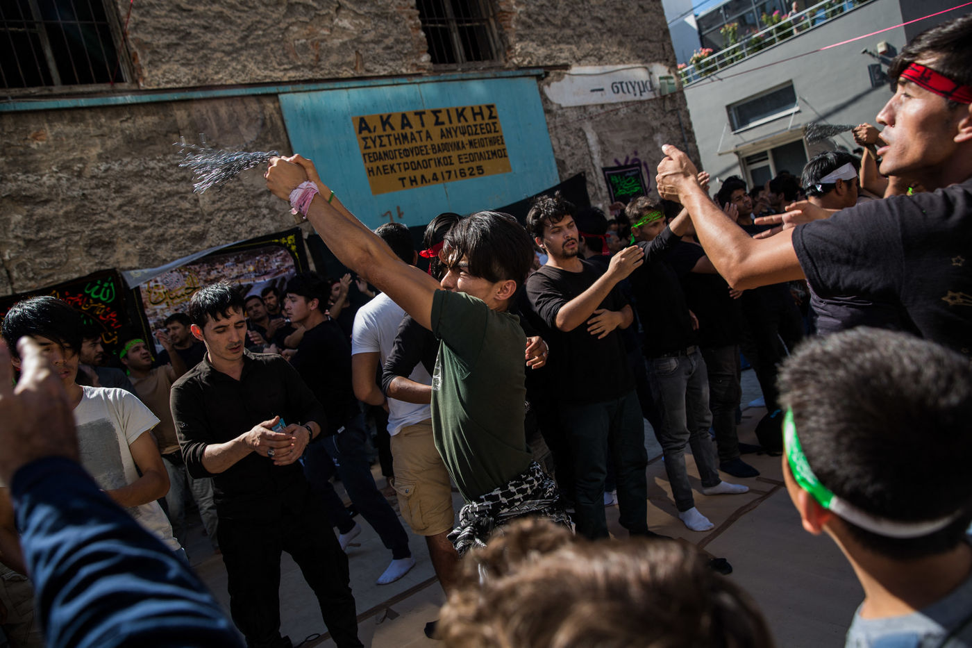 La communauté musulmane chiite se réunit pour célébrer l'Achoura, dans le district du Pirée, près d'Athènes, en Grèce, le jeudi 20 septembre 2018. Le jour de l'Achoura est célébré par les musulmans chiites. Le 10 octobre 680, Hussein, petit-fils du Prophète, est massacré par les troupes du calife de Damas. Athènes est la seule capitale européenne a autorisé cette célébration. Durant les processions, les gens se frappent leurs poitrines en signe de chagrin et de deuil. Des hommes chiites s'auto flagellent pour commémorer le martyre de Hussein, un petit-fils du prophète Mahomet..