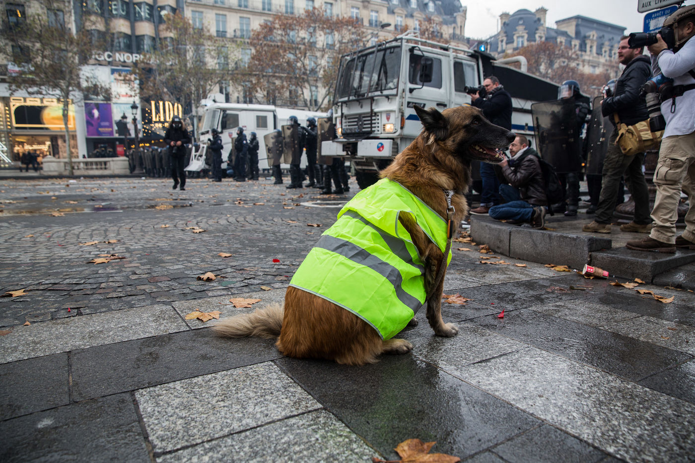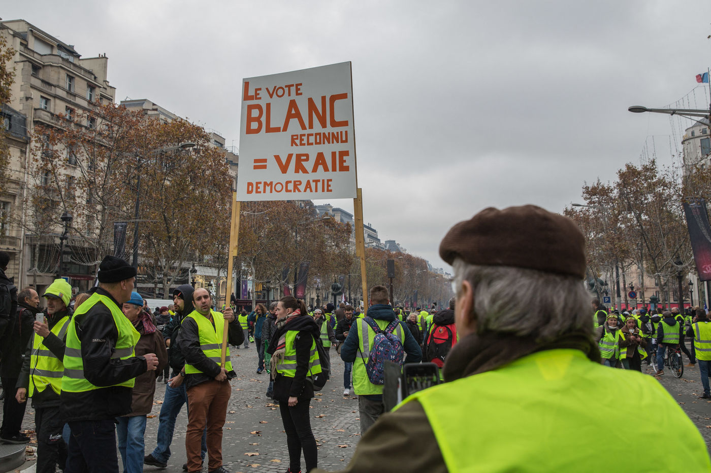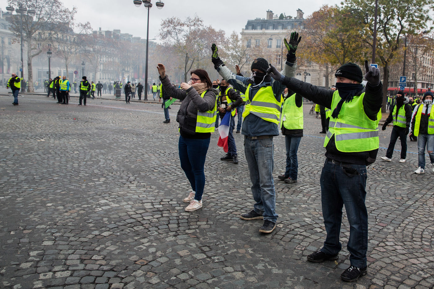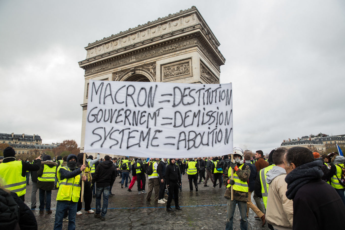 Many french people called Gilets Jaunes (Yellon Vest) demonstrate in Paris on CHamps Elysees on Saturday, 24 November 2018. Gilets Jaunes complain for a better buying power, less taxes and better way of living.
