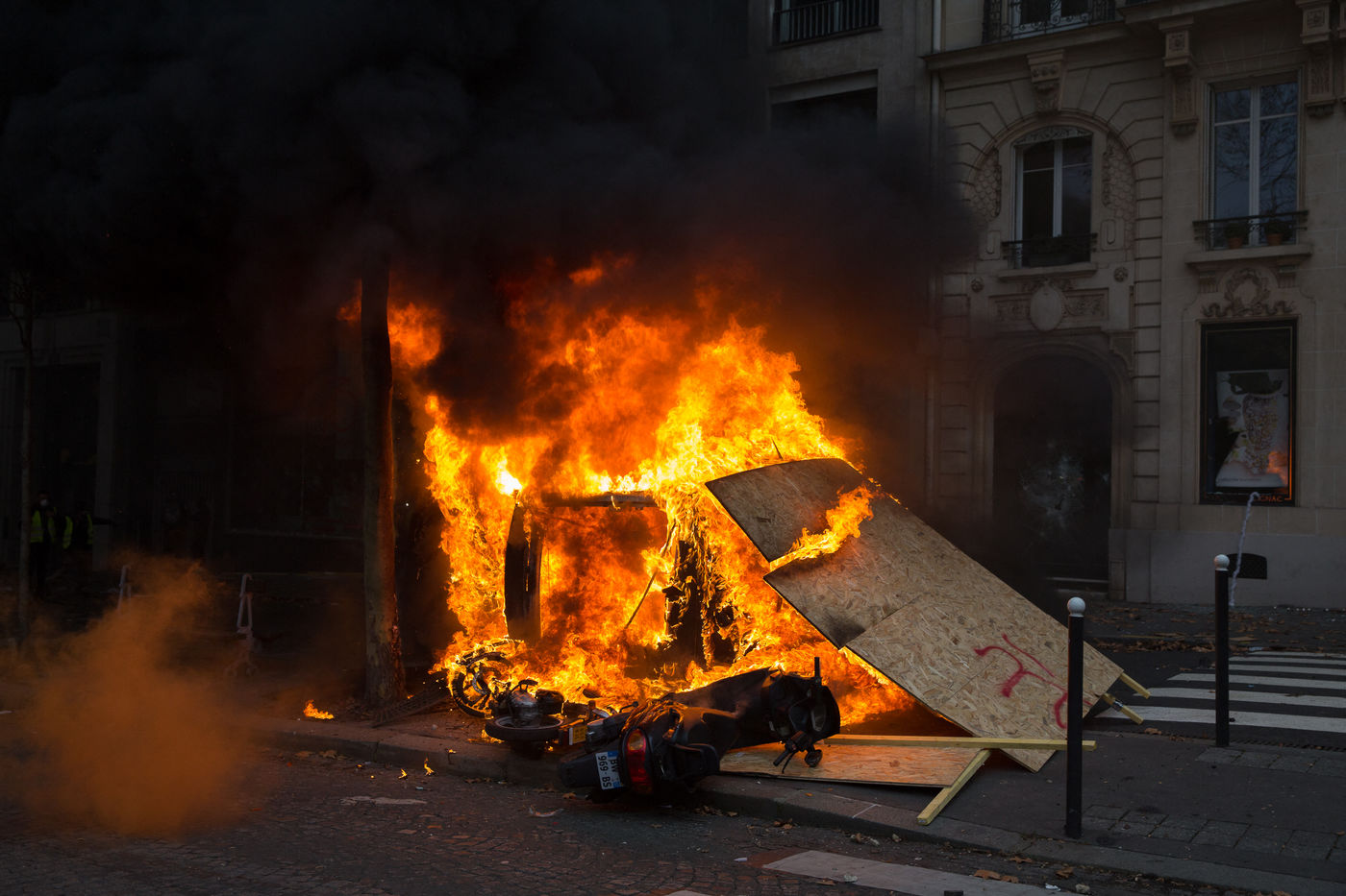 4eme journée de mobilisation de la contestation des Gilets Jaunes à Paris le Samedi 8 Décembre 2018. La journée a été marquée par de nombreuses violences dans differents endroits de la ville. Ces violences ont entraine un nombre important de blesses et d'arrestations