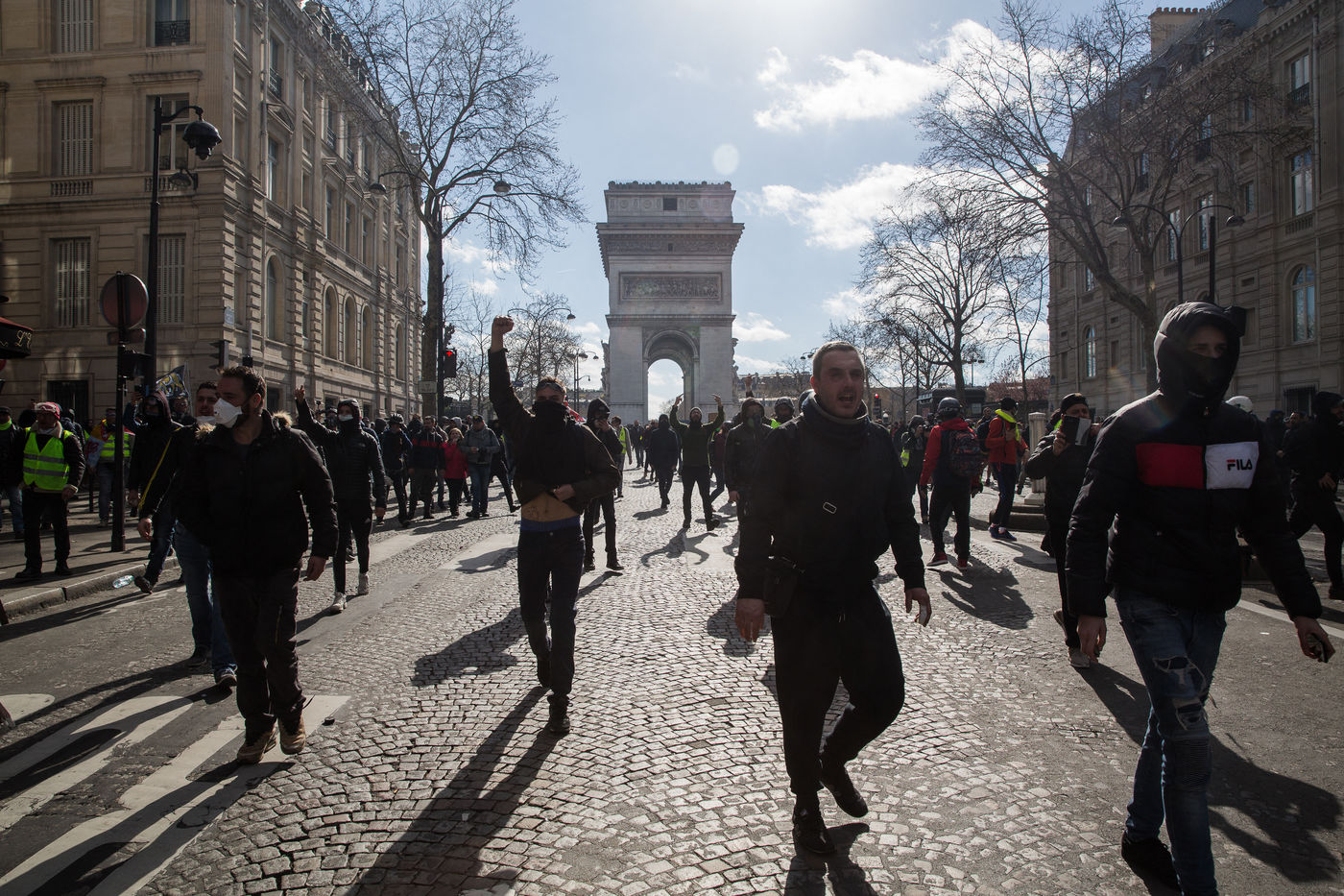 Violents affrontements en Gilets Jaunes, Black bloc et forces de police sur les Champs Elysées à Paris le samedi 16 Mars 2019. De nombreuses personnes se sont rassemblees pour le 18eme acte et premiere journee de mobilisation apres la fin du grand debat mis en place par le gouvernement.
