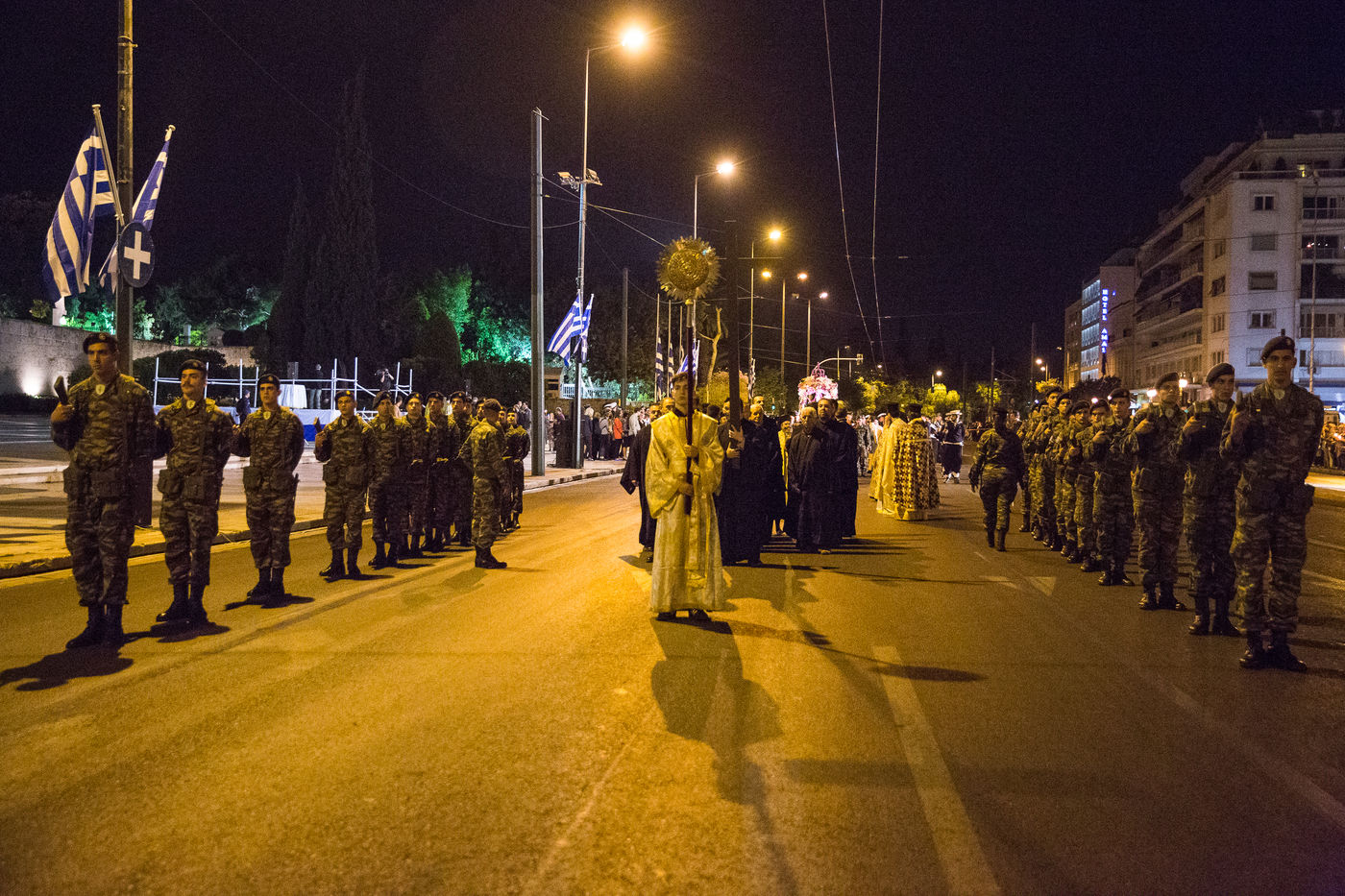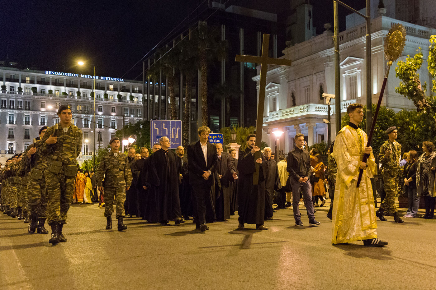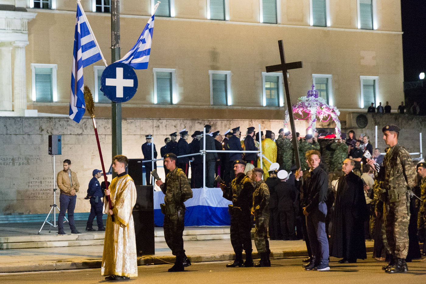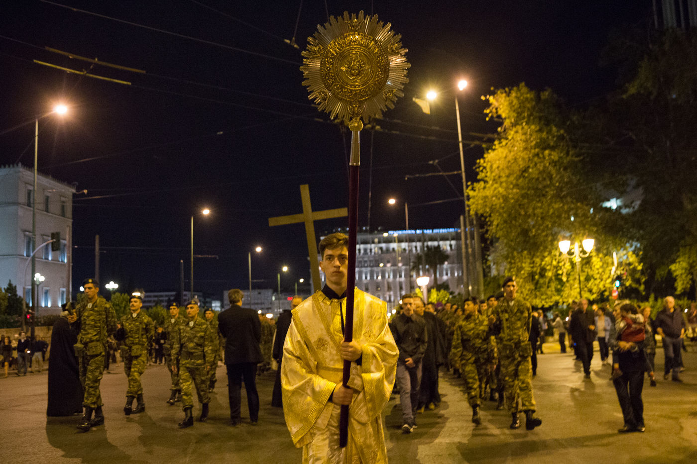Religieux, militaires et civils participent aux celebrations de Paques Orthodoxes dans les rue d'Athenes, en Grece, pour le vendredi Saint. Toutes les eglises de la ville sont ouvertes et accueillent les croyants tout au long de la nuit. La procession principale est celle de l'Epitaphe qui represente le cercueil de Jesus Christ qui part de la Place Syntagma.