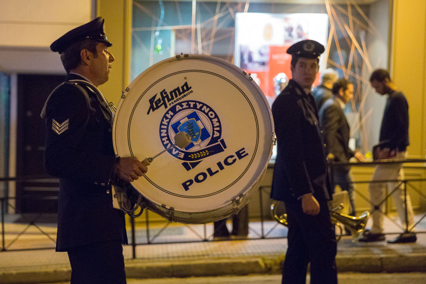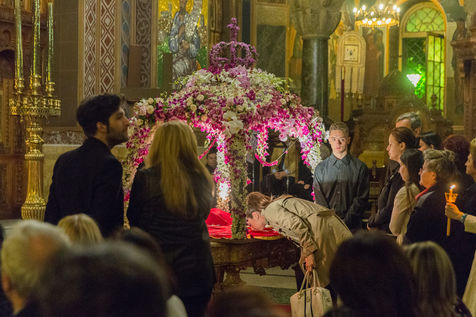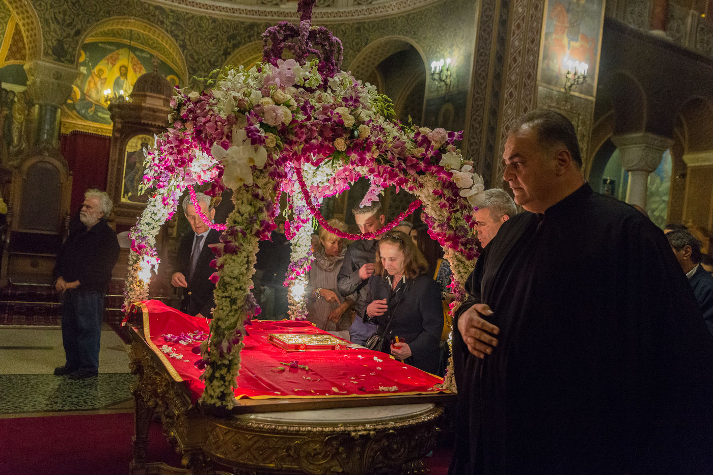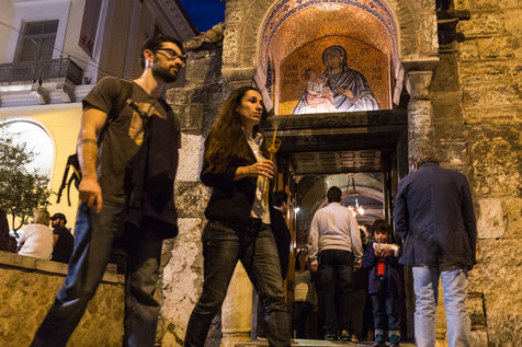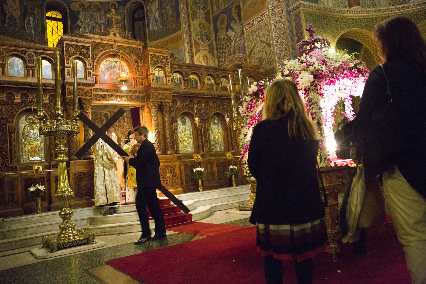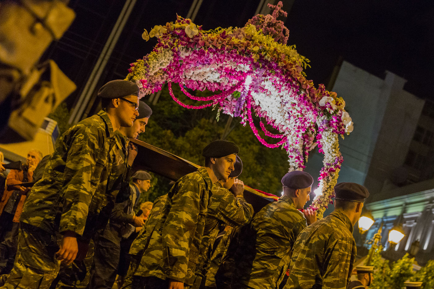 Religieux, militaires et civils participent aux celebrations de Paques Orthodoxes dans les rue d'Athenes, en Grece, pour le vendredi Saint. Toutes les eglises de la ville sont ouvertes et accueillent les croyants tout au long de la nuit. La procession principale est celle de l'Epitaphe qui represente le cercueil de Jesus Christ qui part de la Place Syntagma.