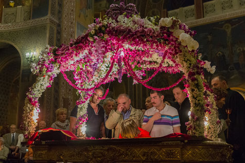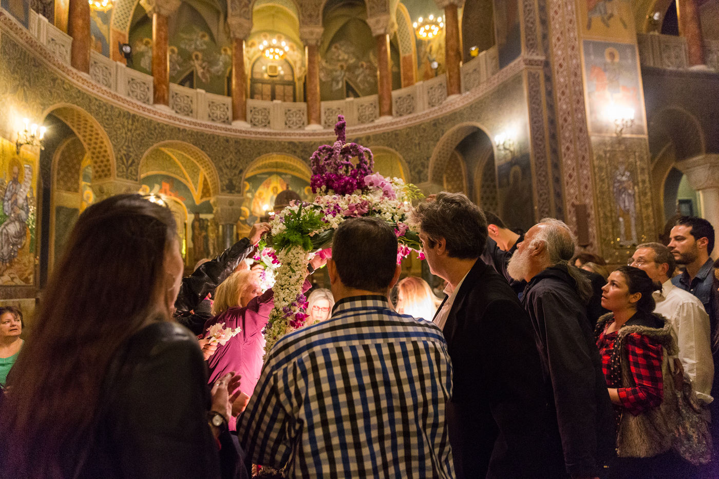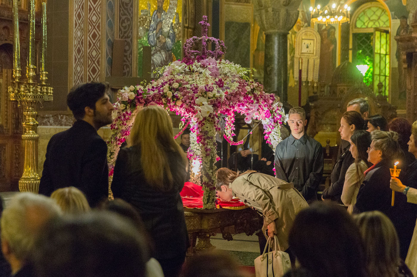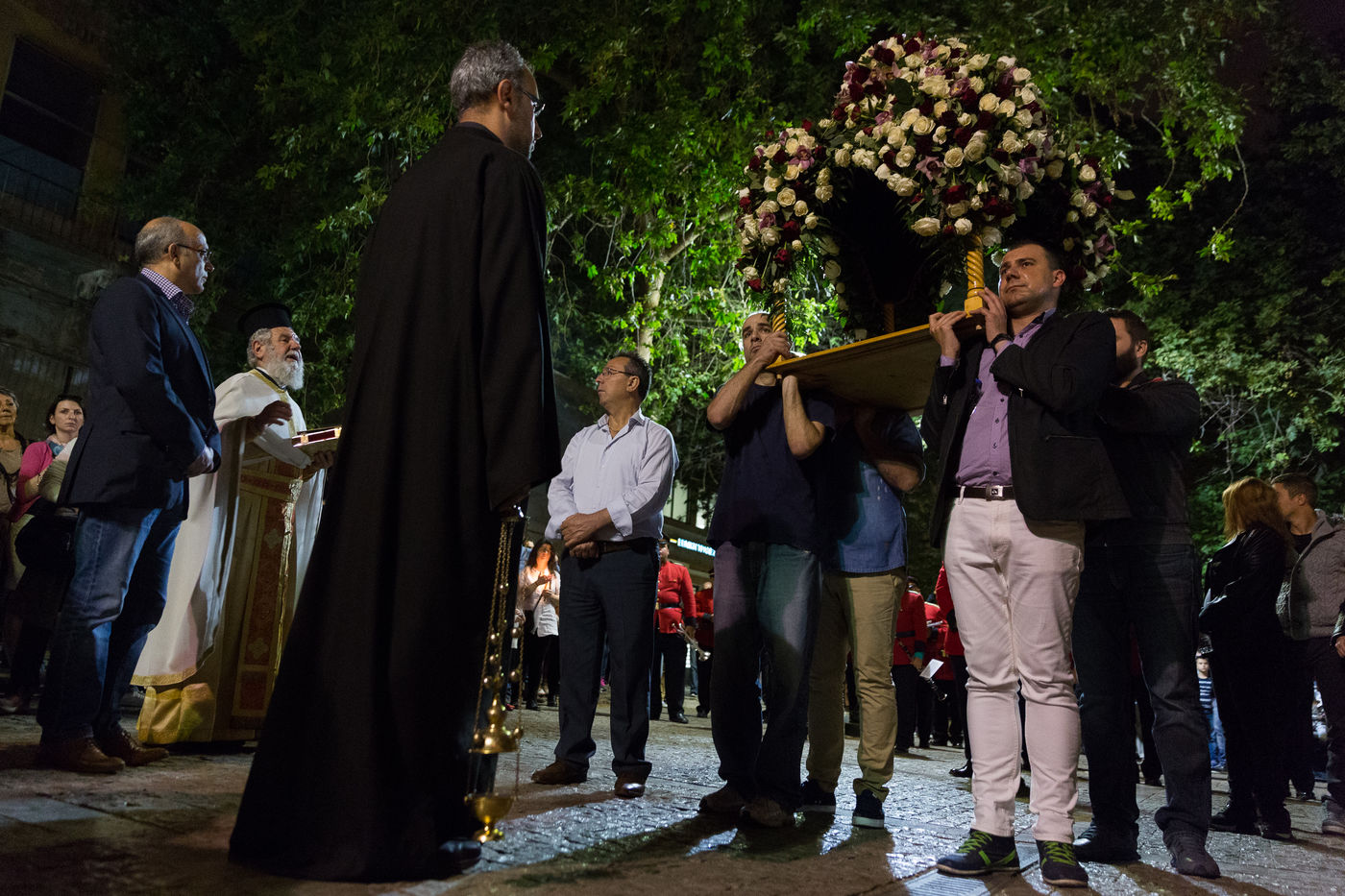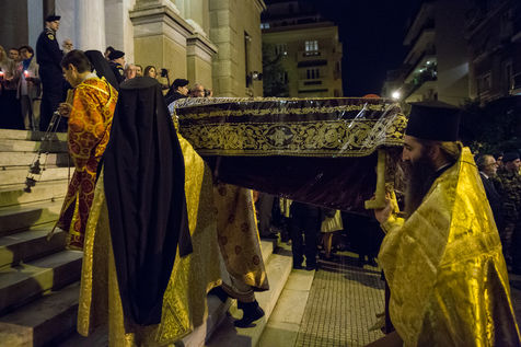 Priests and Orthodox Christians participate in the procession of the Epitaph in center of Athens, on Good Friday.