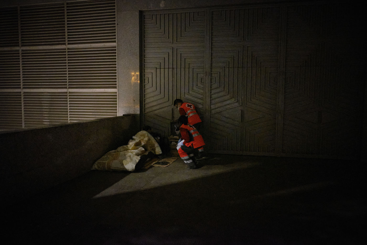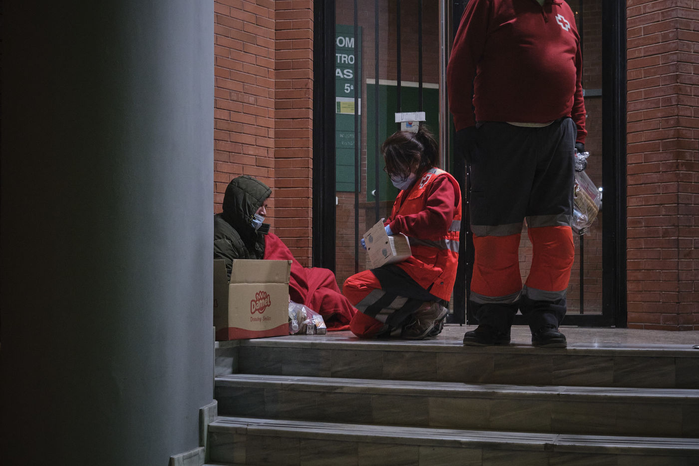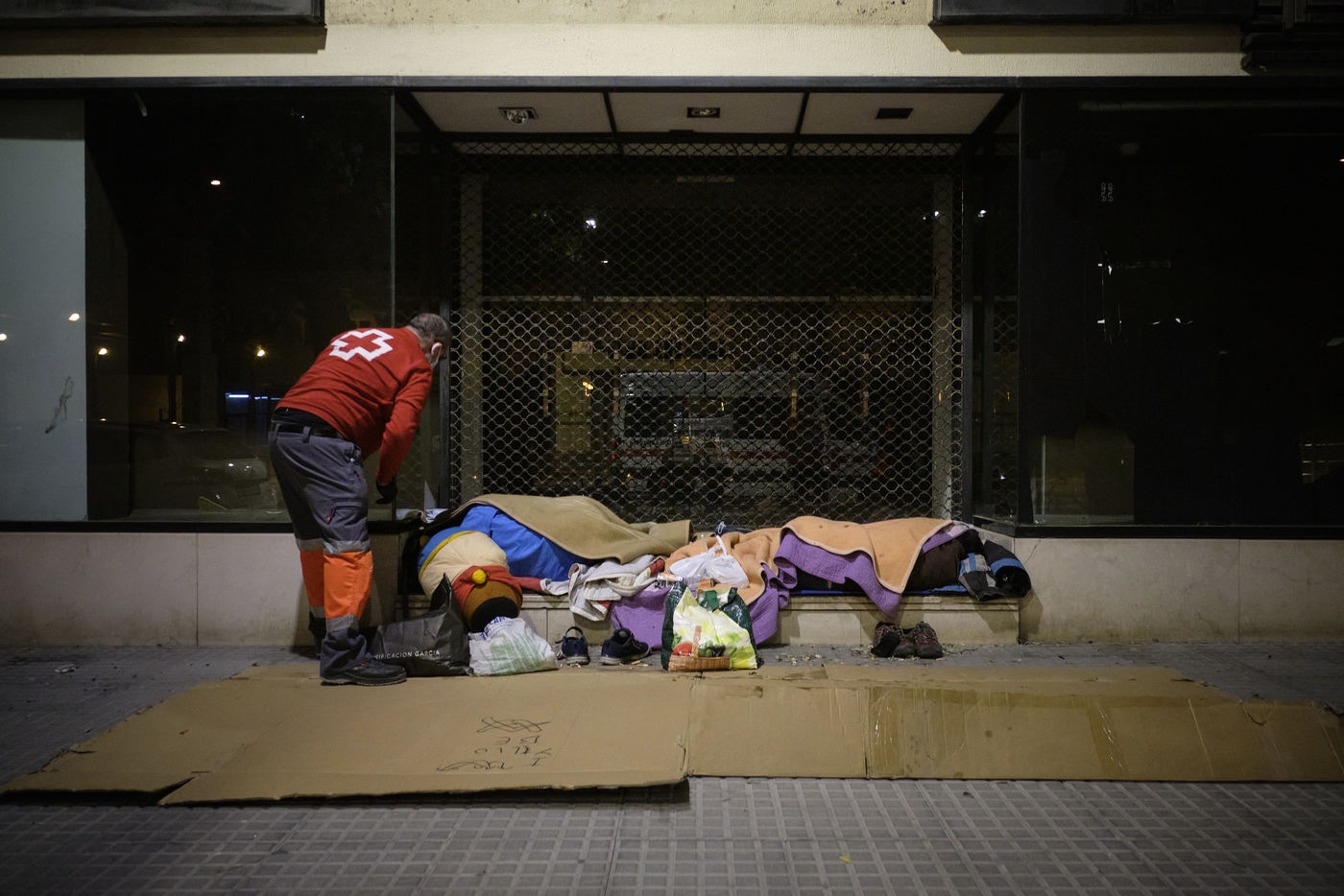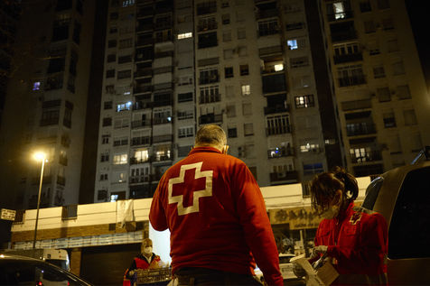 Depuis le début de la pandémie, le nombre de sans-abris dans la ville de Malaga a considérablement augmenté. Avec l'aide de bénévoles, la Croix Rouge organise quotidiennement des maraudes nocturnes sillonnant les rues à la recherche de personnes qui passeront la nuit dehors dans le froid. Durant leurs tournées, les volontaires distribuent de la nourriture, des vêtements chauds, des couvertures, des produits hygiéniques, des masques.
