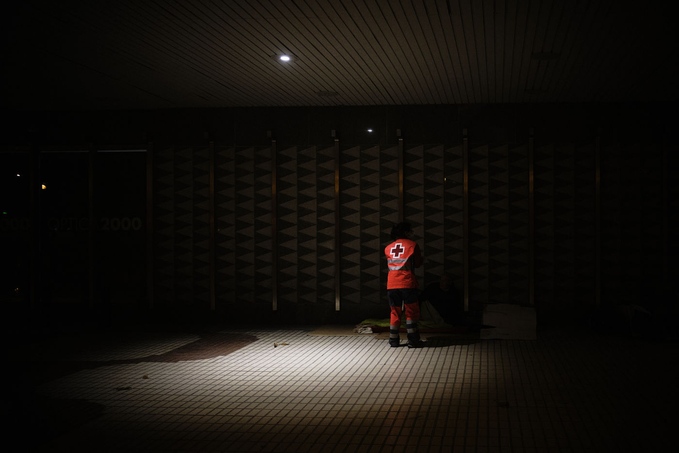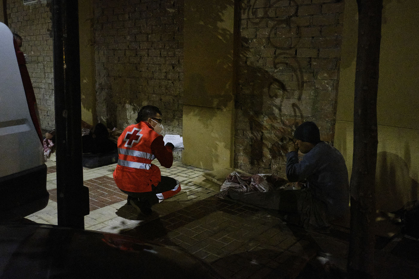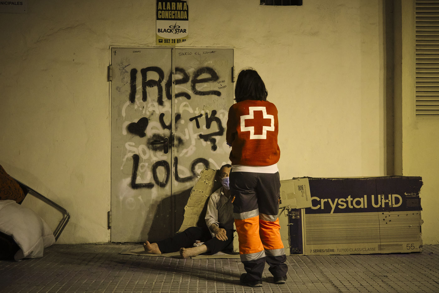 Depuis le début de la pandémie, le nombre de sans-abris dans la ville de Malaga a considérablement augmenté. Avec l'aide de bénévoles, la Croix Rouge organise quotidiennement des maraudes nocturnes sillonnant les rues à la recherche de personnes qui passeront la nuit dehors dans le froid. Durant leurs tournées, les volontaires distribuent de la nourriture, des vêtements chauds, des couvertures, des produits hygiéniques, des masques.