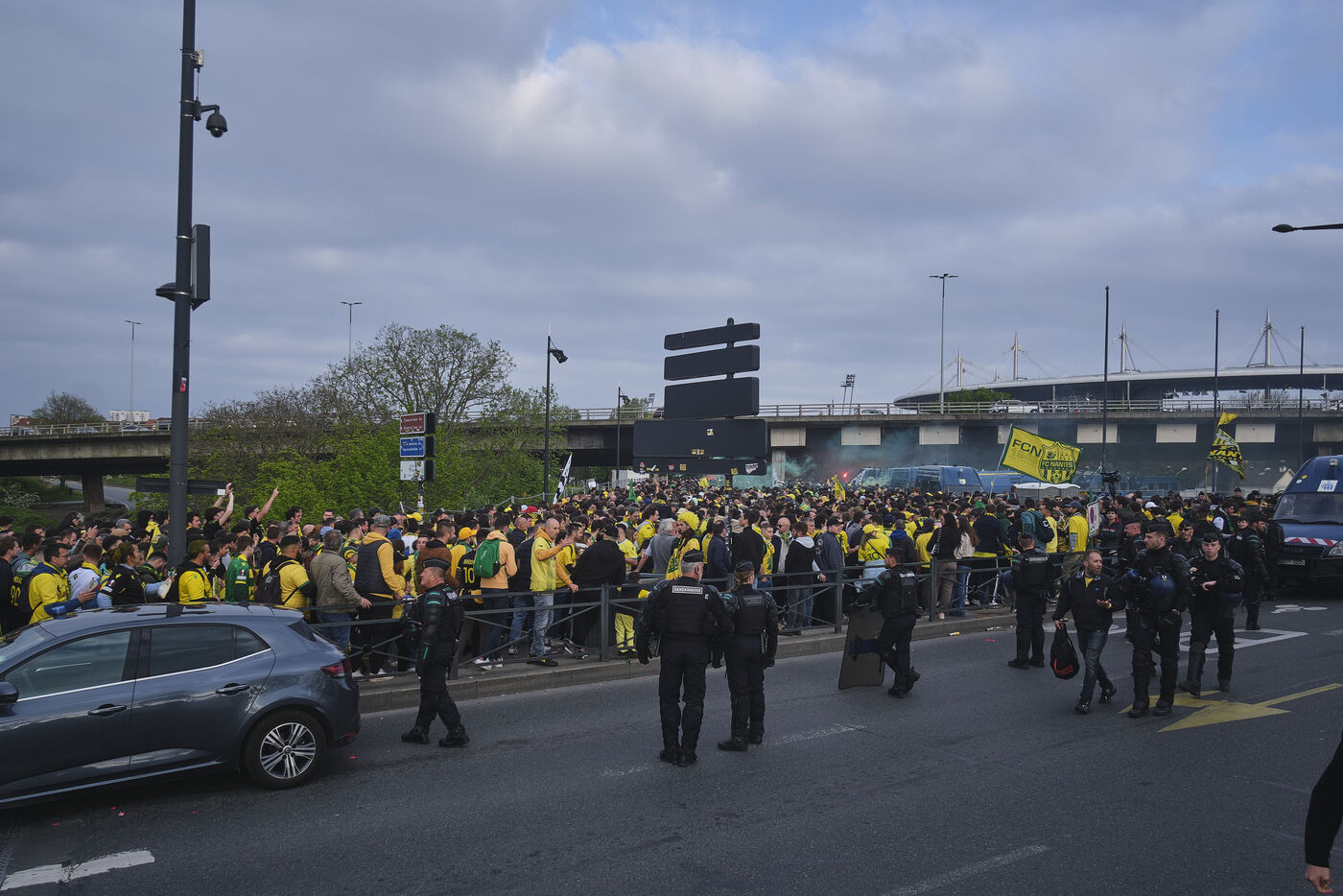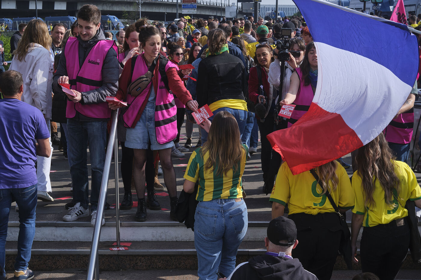 À l'occasion de la finale de la Coupe de France les syndicats se sont mobilisés pour afficher leur mécontentement contre le gouvernement d'Emmanuel Macron et de sa réforme contre les retraites à l'âge de 64 ans. Ils se sont positionnés aux alentours du Stade France afin de distribuer des cartons rouges et des sifflets aux supporters Nantais et Toulousains.