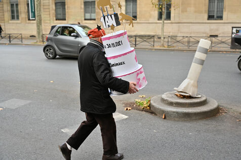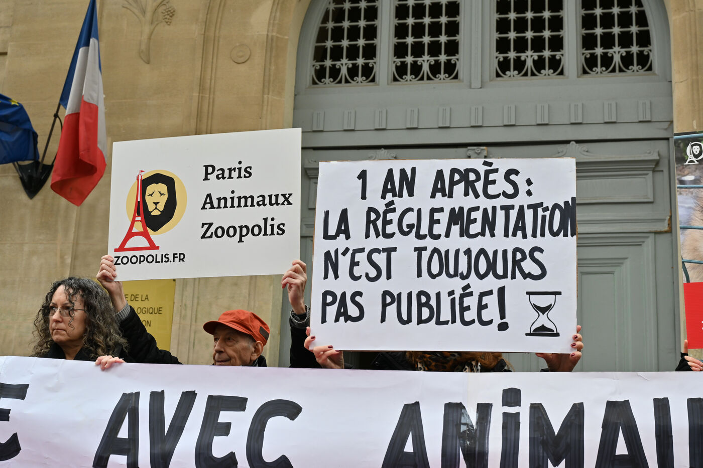 Des militant-es PAZ, manifestent pour l anniversaire de la loi du 30/11/2021 concernant l interdiction des animaux sauvages dans les cirques itinérants devant le ministère de l écologie.