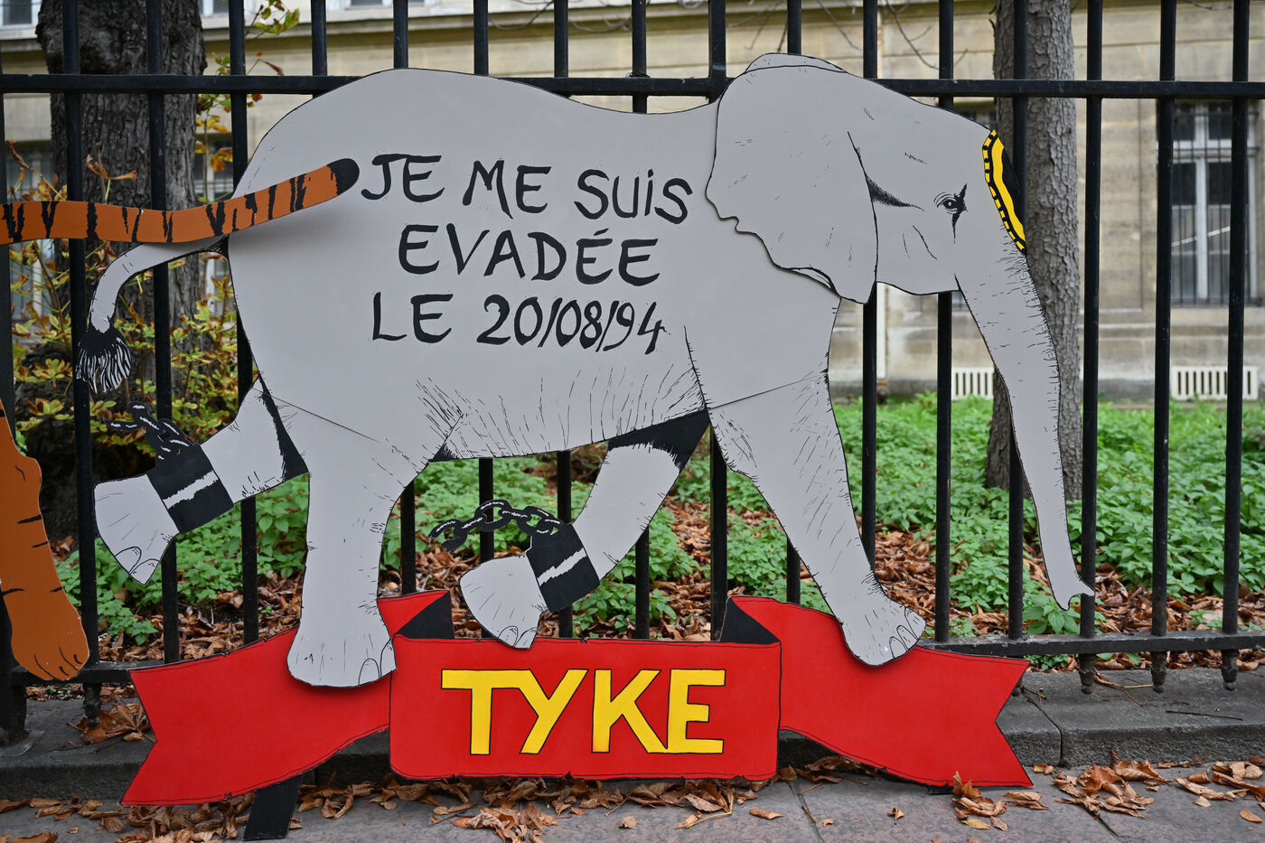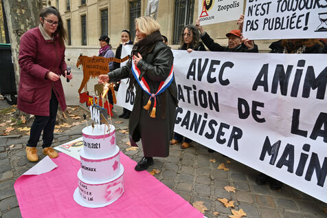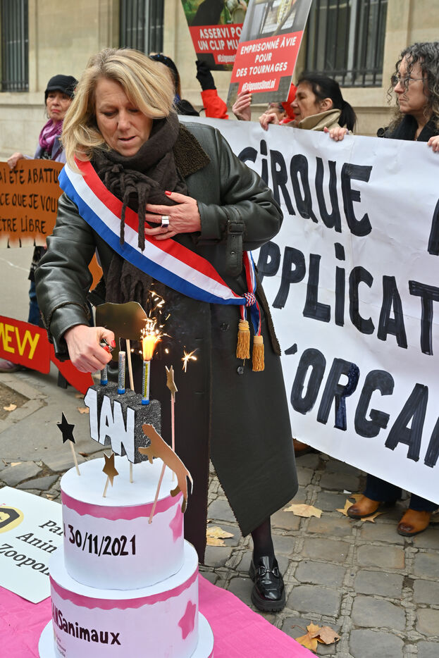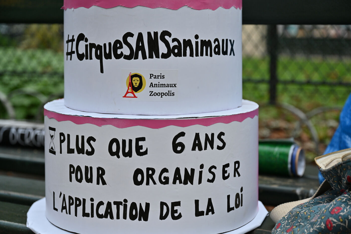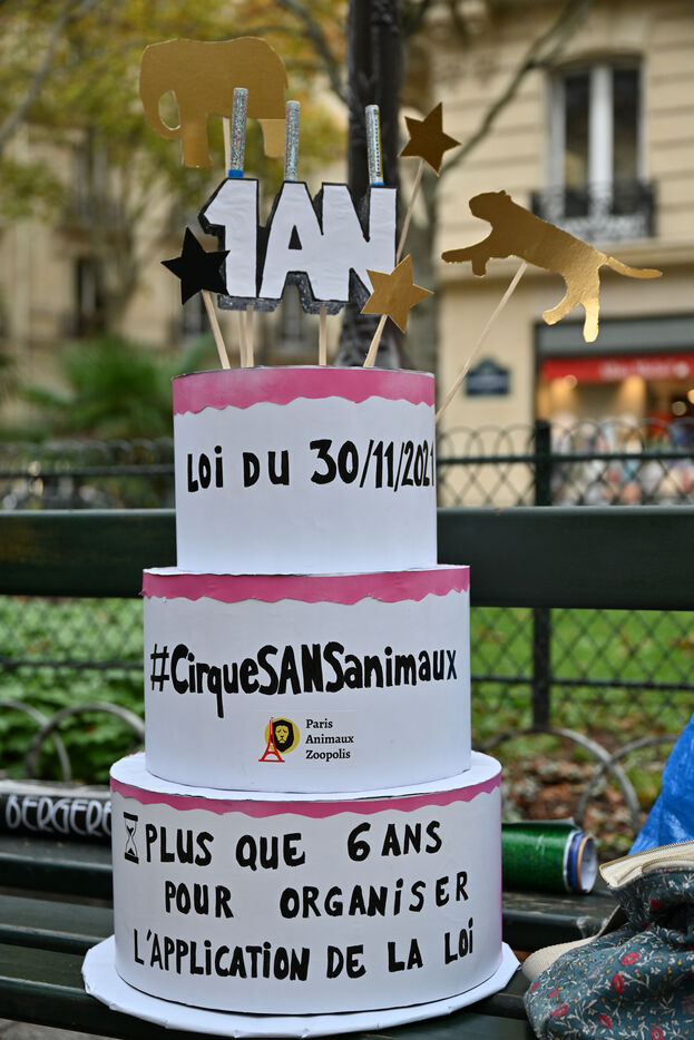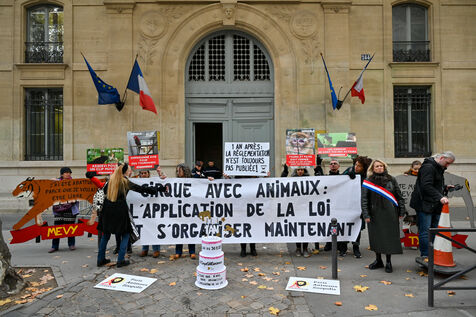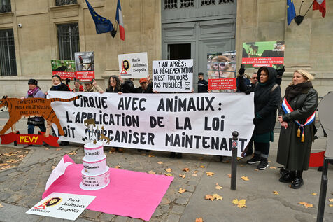 PAZ activists demonstrate for the anniversary of the law of 30/11/2021 concerning the ban on wild animals in travelling circuses in front of the Ministry of Ecology.