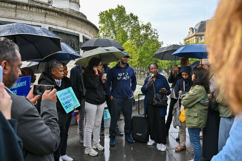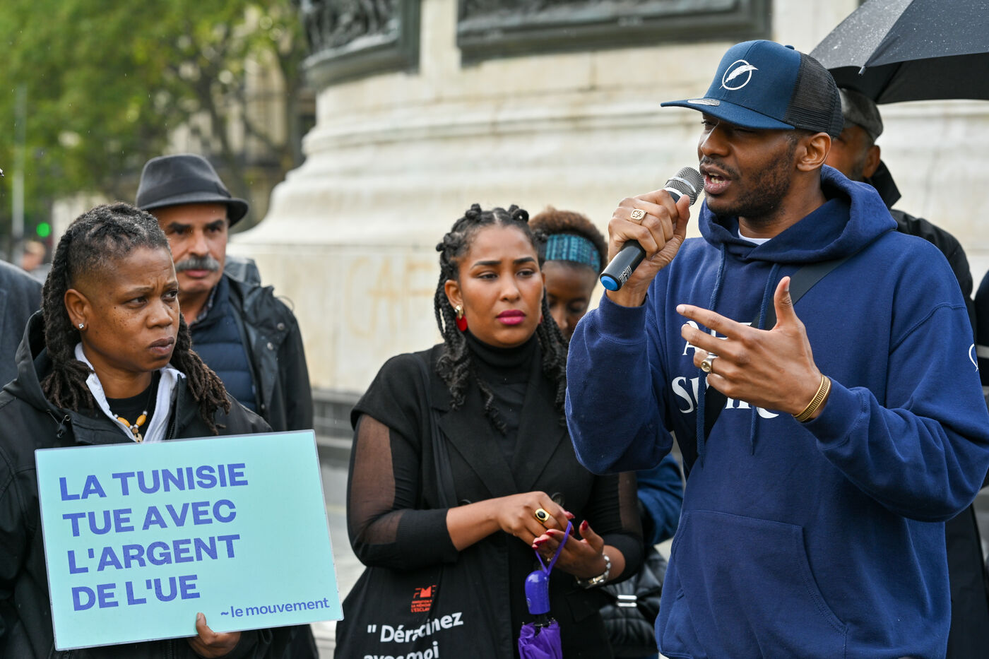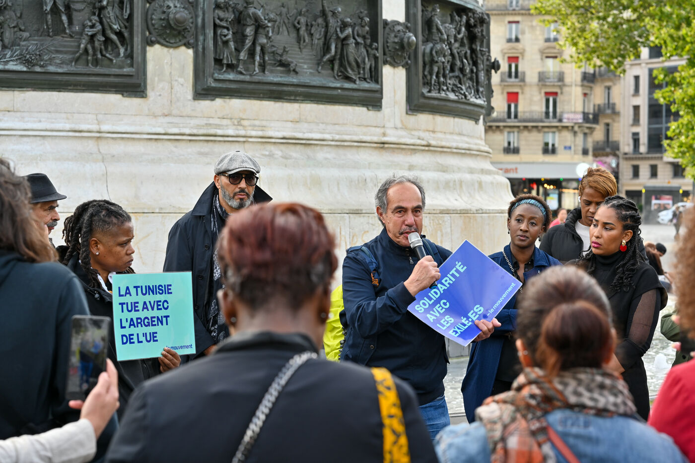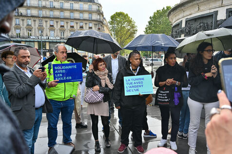 Rassemblement place de la République pour dénoncer le traitement inhumain du gouvernement Tunisien sur les personnes migrantes. Depuis plus d un mois, la situation migratoire en Tunisie est dénoncée par les ONG, comme Human Rights Watch et Amnesty International, qui parlent de « rafles » et « d expulsions racistes ».