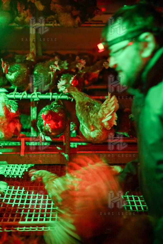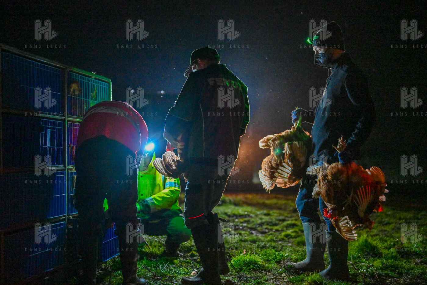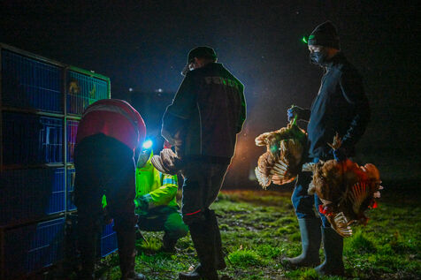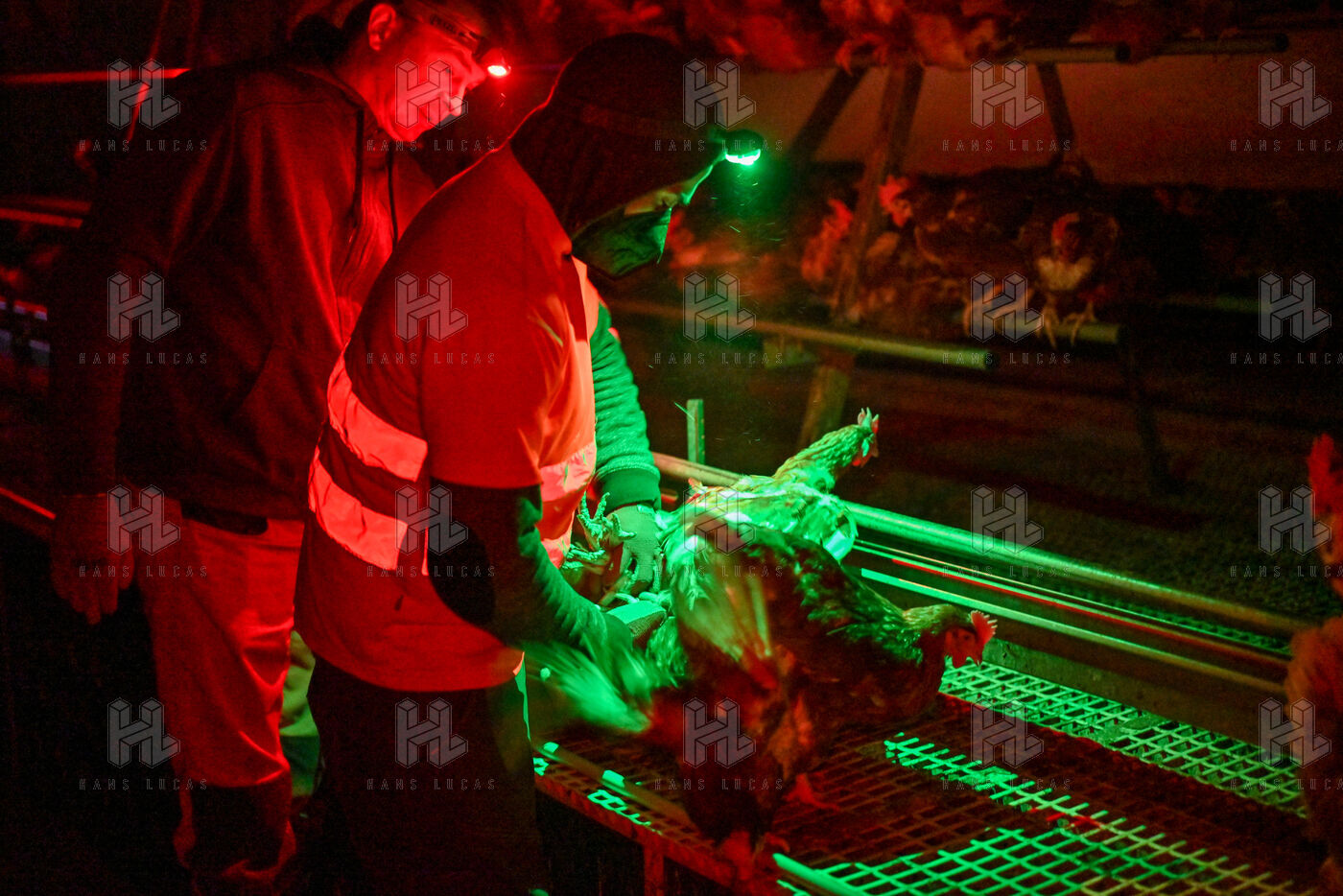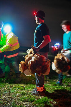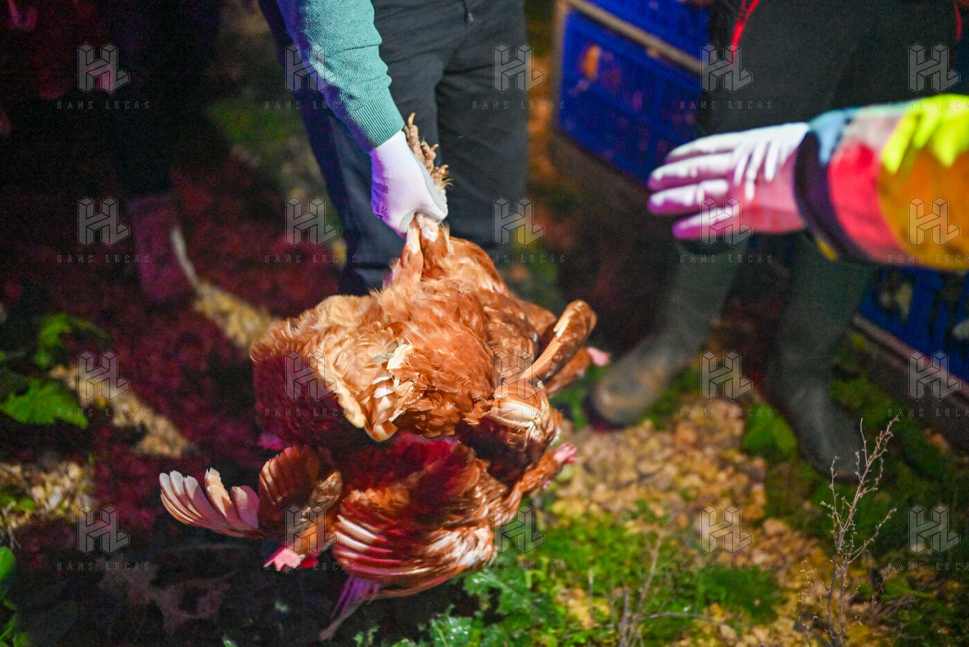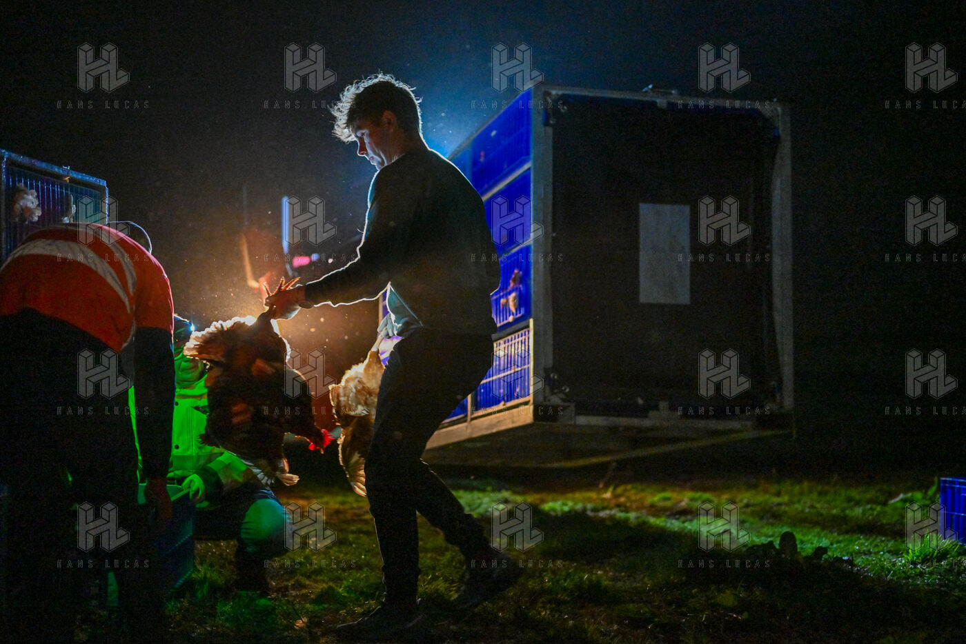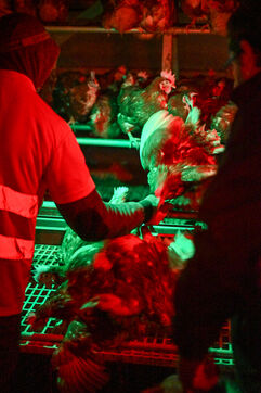 In the heart of the Beauce region, as night falls, this family-owned farm, specializing in the breeding of 9000 laying hens and the production of organic farm products, prepares for a busy evening. Under the red glow of headlamps, poultry gatherers enter the building to begin their collection. The collection team, consisting of 3 seasoned professionals and several friends of the farmer, gets to work. Within two hours, nearly 8000 hens are placed into crates and loaded onto a truck that will head to the slaughterhouse.