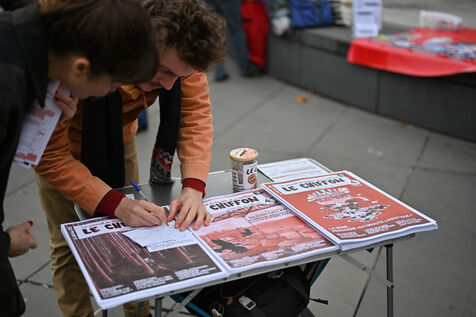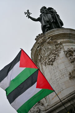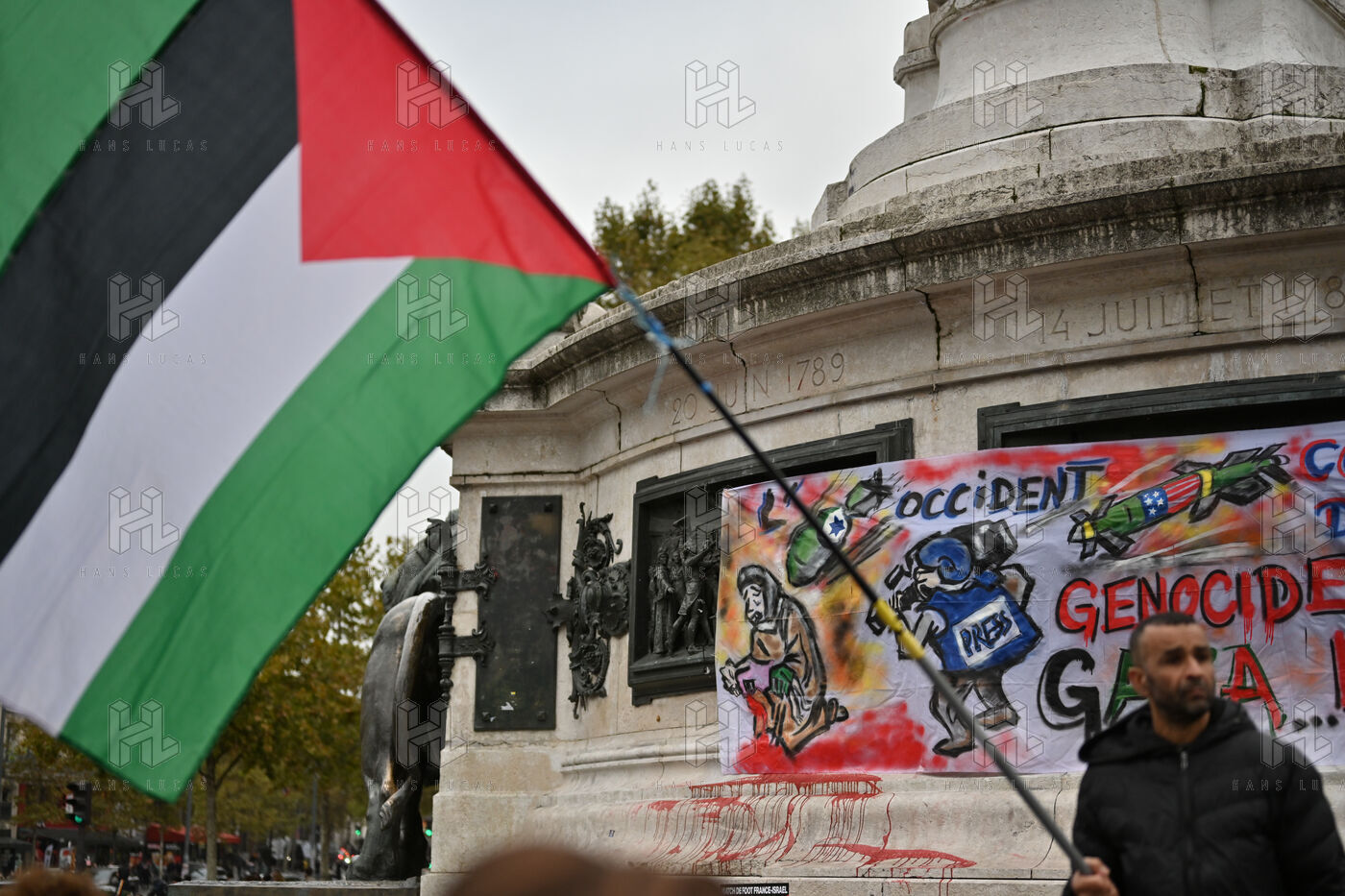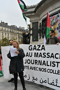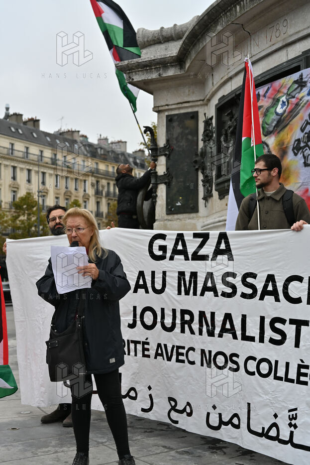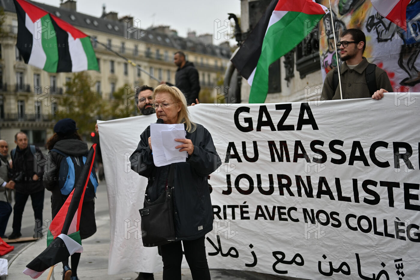 Des centaines de personnes se sont rassemblées cet après-midi sur la place de la République à Paris pour manifester en soutien aux journalistes exerçant leur métier dans des zones de conflit, particulièrement en Palestine et au Liban.