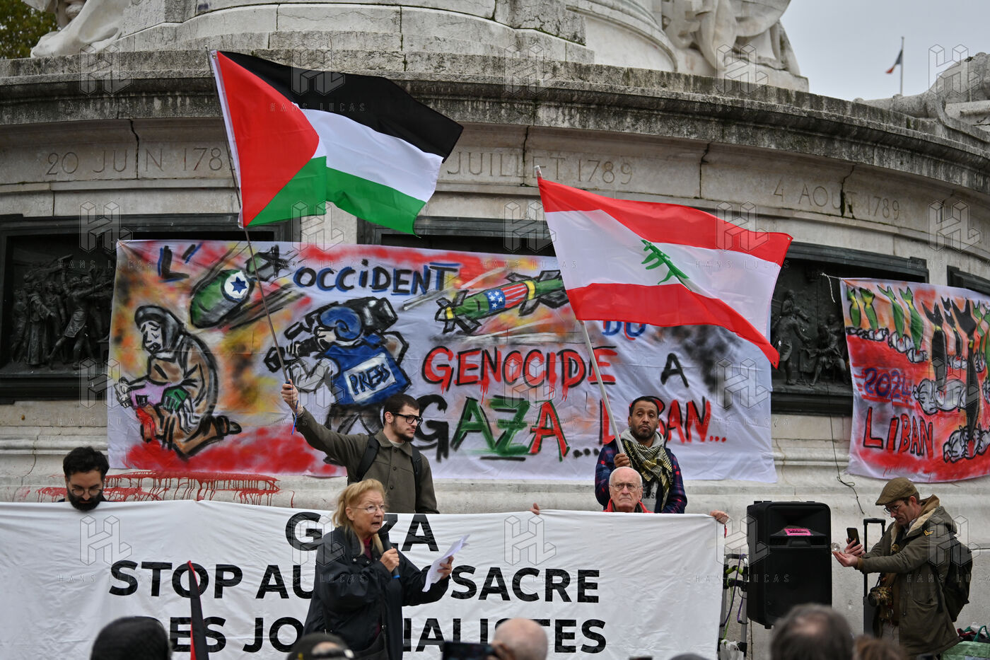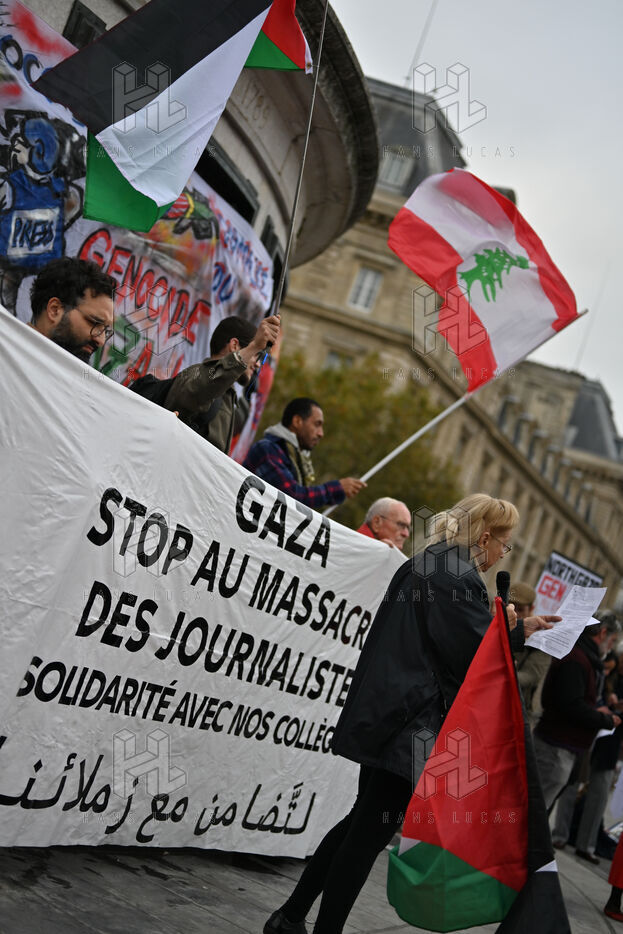 Hundreds of people gathered this afternoon at Place de la République in Paris to protest in support of journalists working in conflict zones, particularly in Palestine and Lebanon.