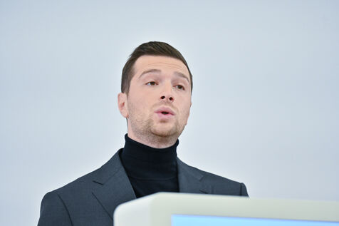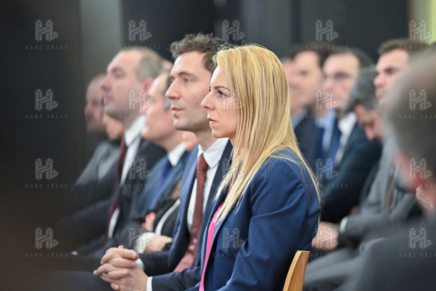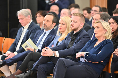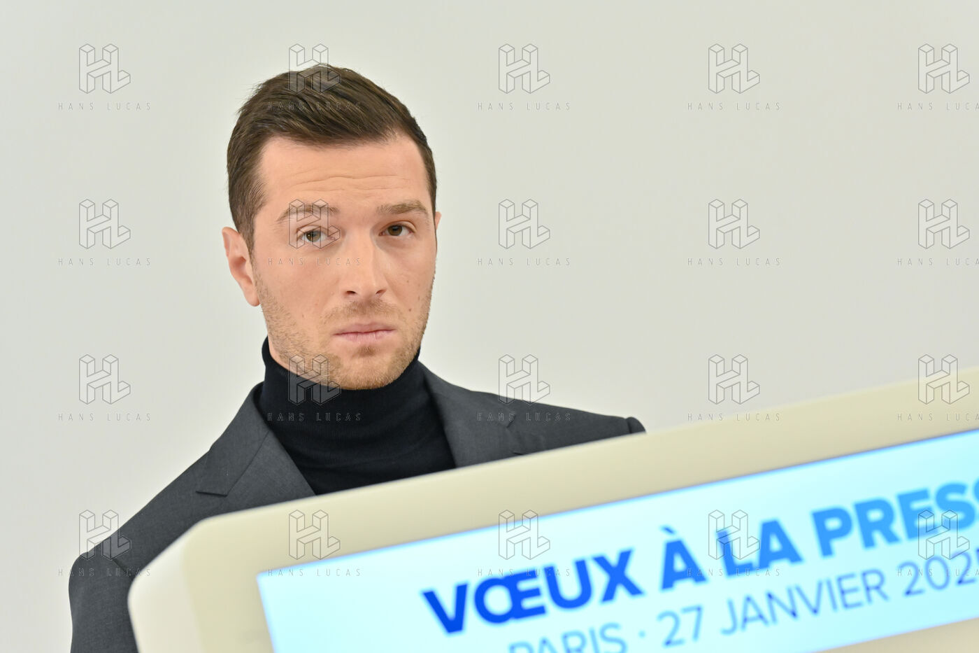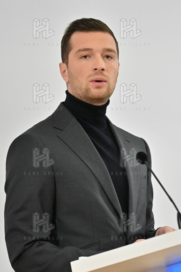 Ceremony of New Year's wishes to the press by RN's Jordan Bardella in the presence of Marine Le Pen at the Maison de la Chimie in Paris.