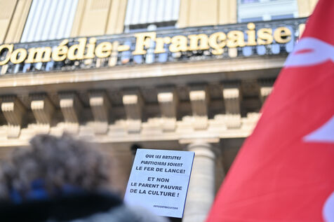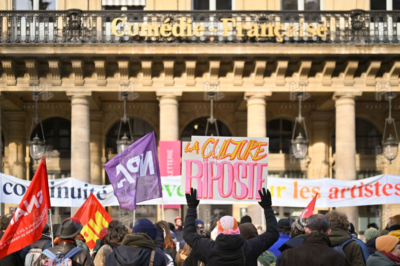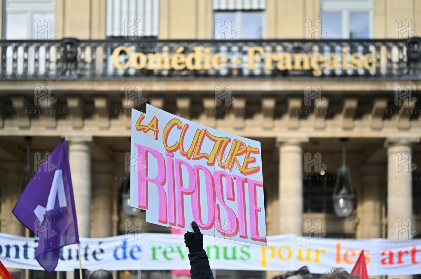 Face aux coupes budgétaires, au désengagement des acteurs publics, a la précarisation des métiers et a l affaiblissement des droits, les travailleur.ses de l art et de la culture se rassemblent place Colette, devant la Comédie Francaise.