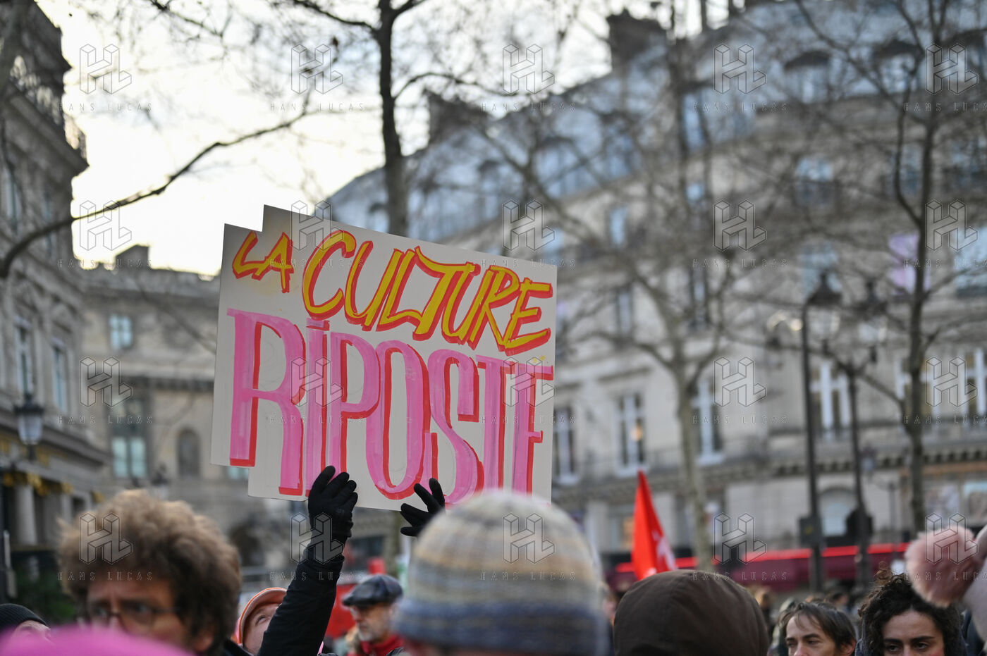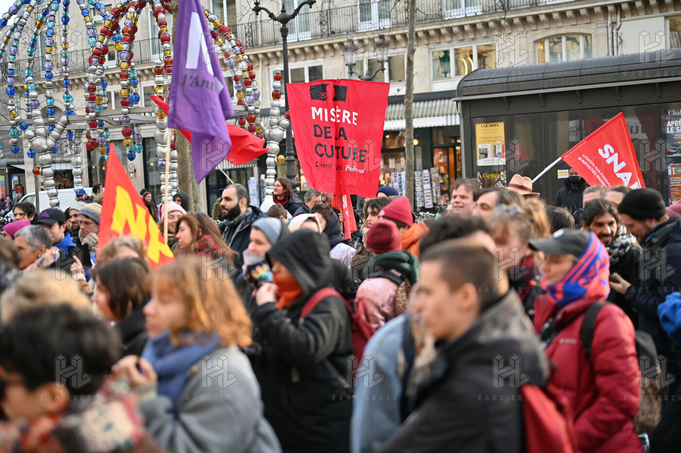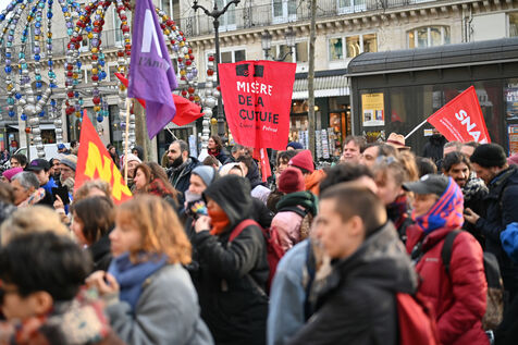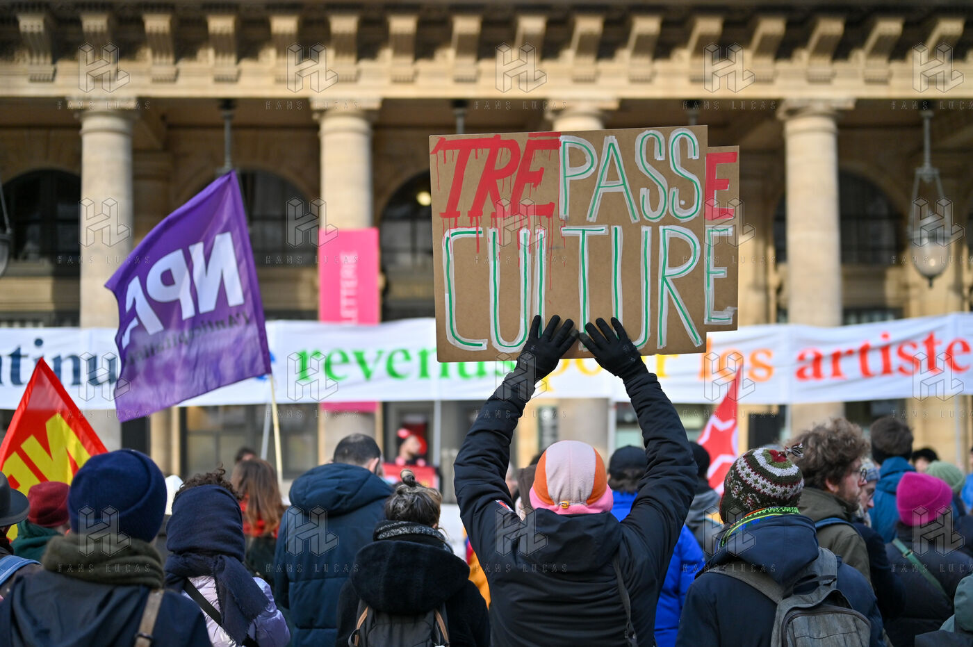 Face aux coupes budgétaires, au désengagement des acteurs publics, a la précarisation des métiers et a l affaiblissement des droits, les travailleur.ses de l art et de la culture se rassemblent place Colette, devant la Comédie Francaise.
