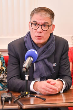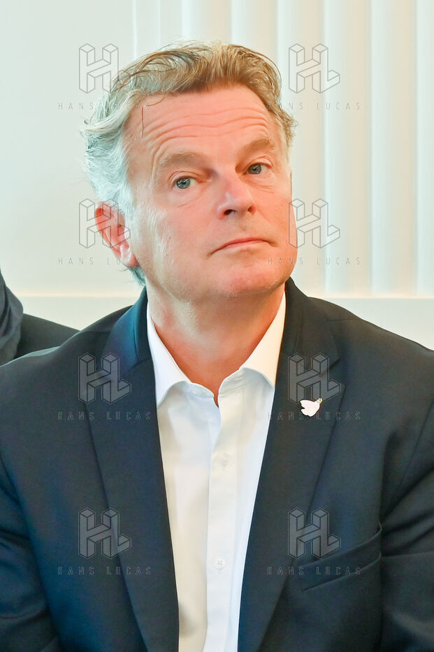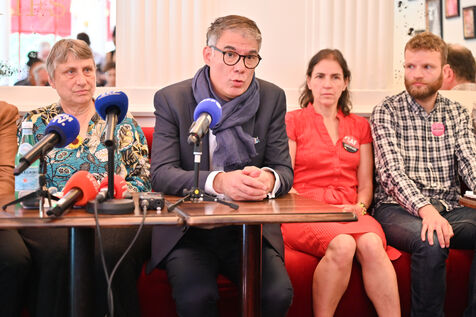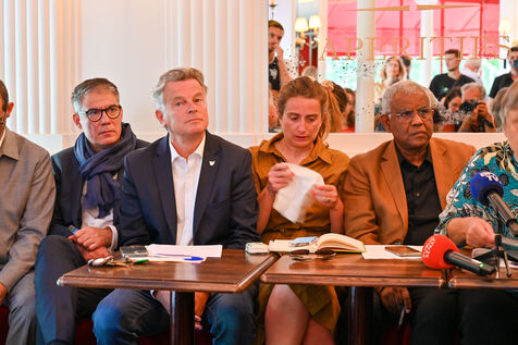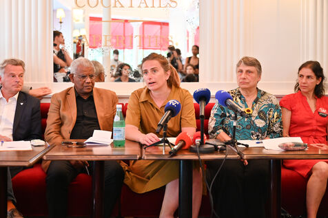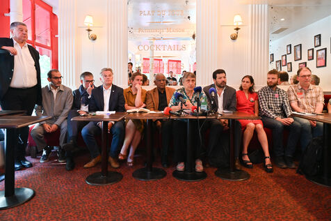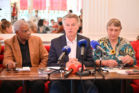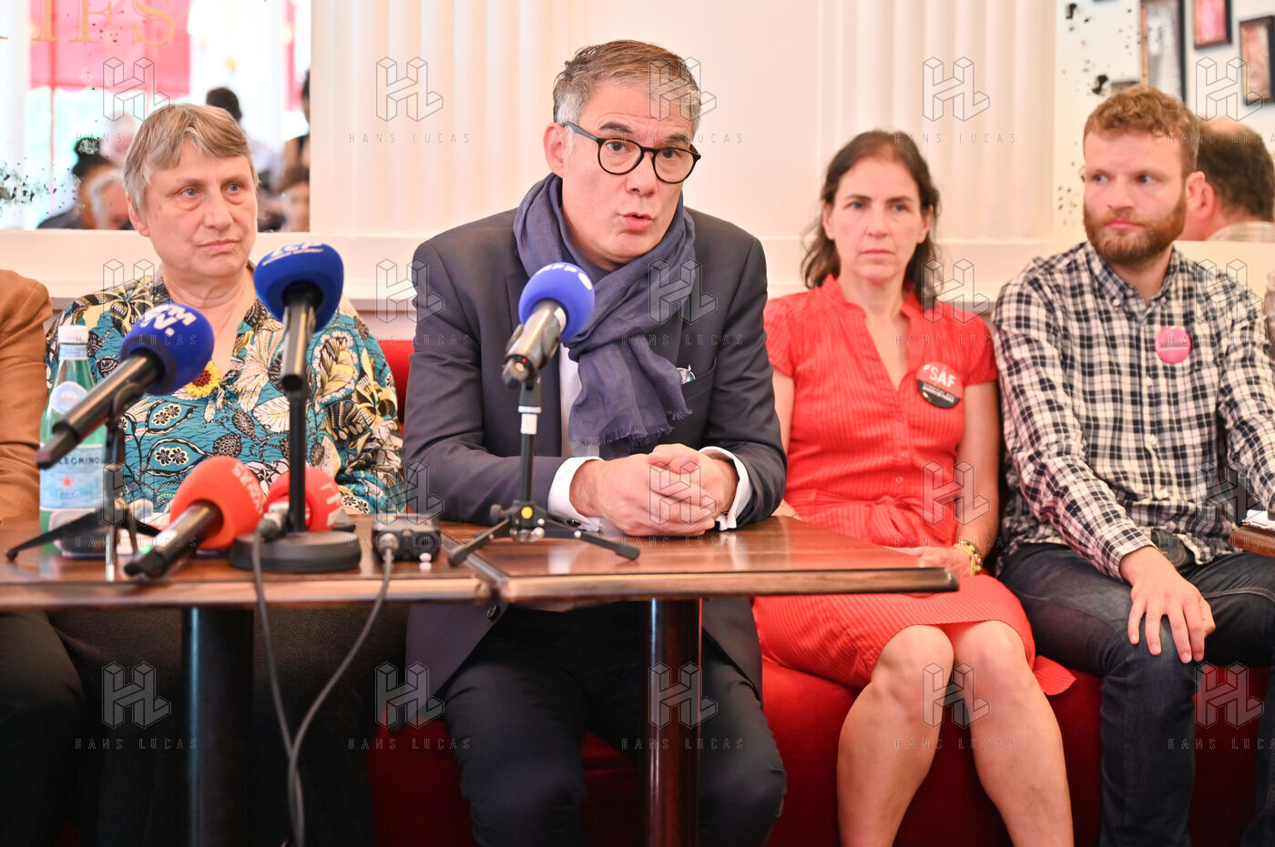 Conférence de presse pour la reconnaissance de l’Etat de Palestine au café Concorde en présence notamment de Marine Tondelier, Olivier Faure et Fabien Roussel.