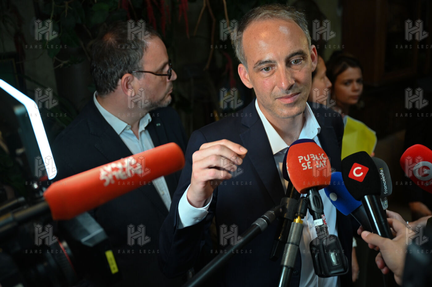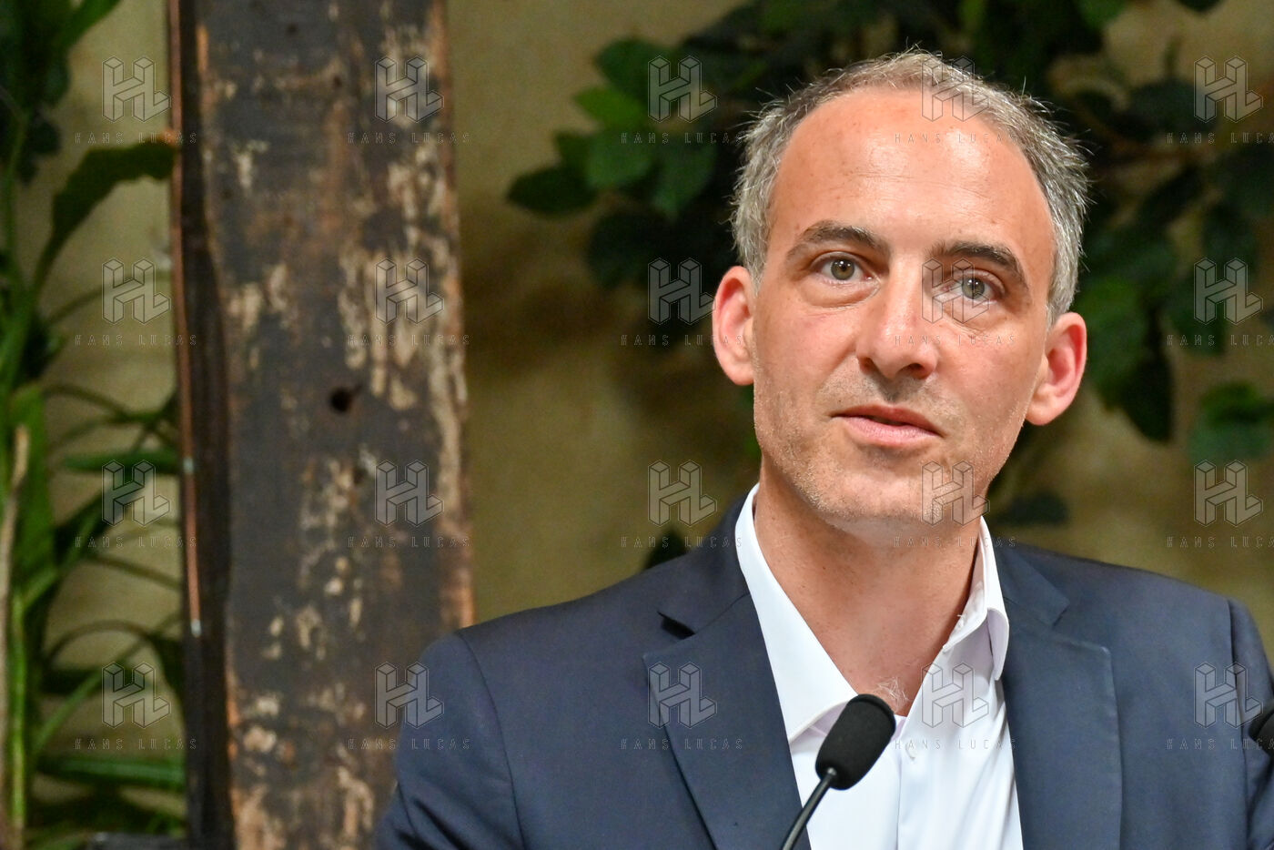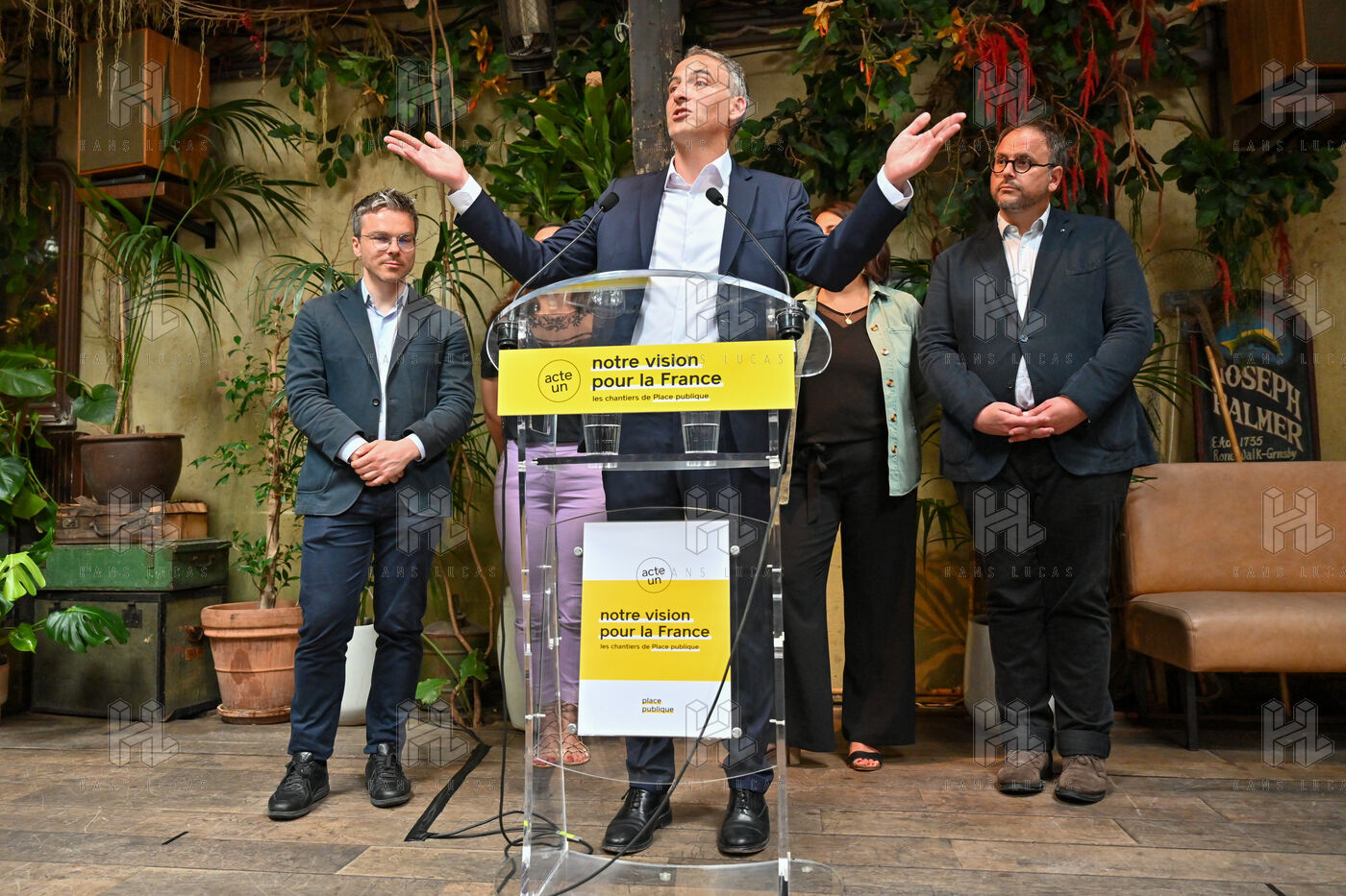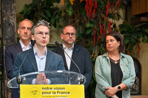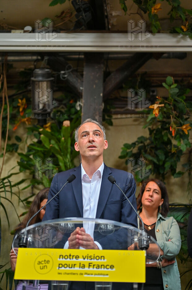 Raphael Glucksmann présente le programme de son parti Place publique lors d'une conférence de presse organisée au Comptoir general.