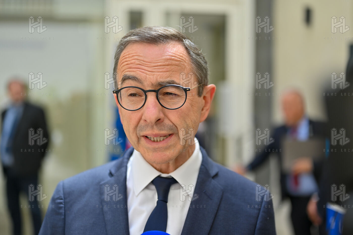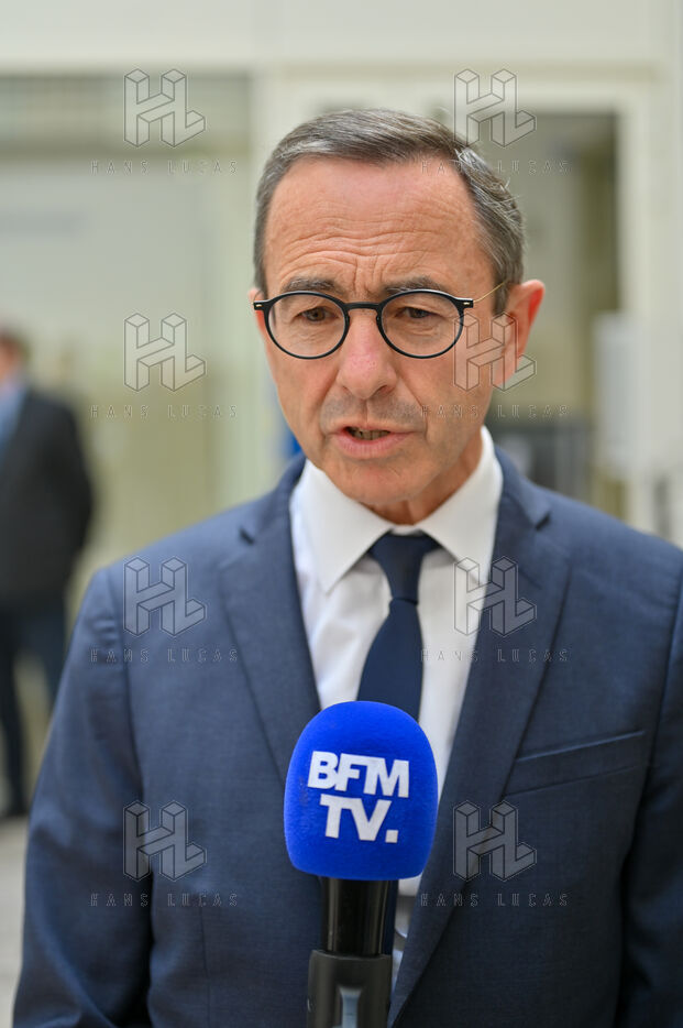 Bruno Retailleau et des membres des Républicains rendent hommage à Olivier Marleix au siege du parti LR.