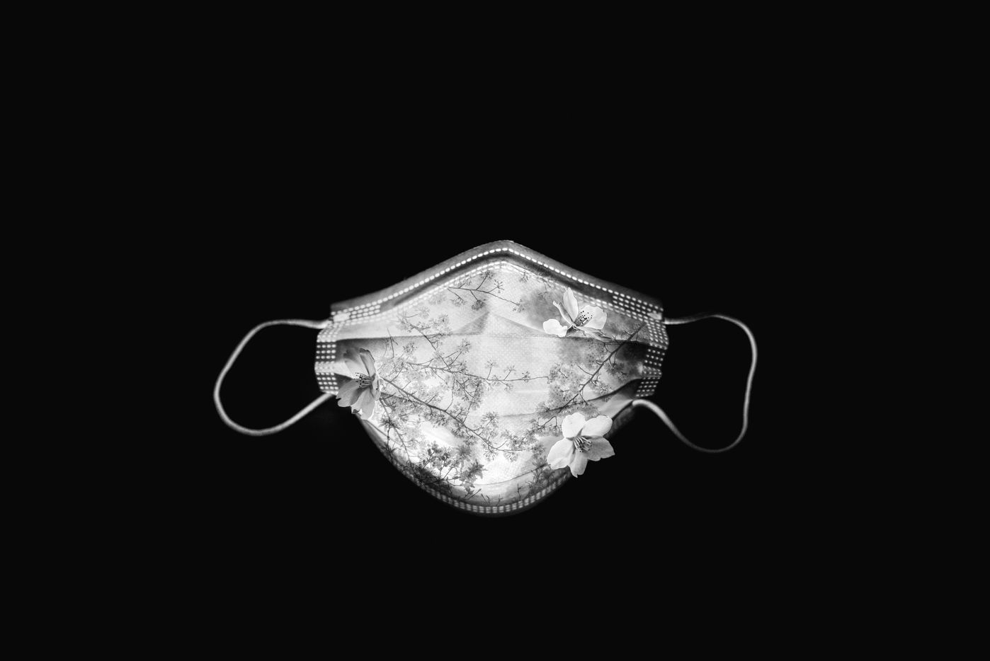 Illustration of a medical mask type IIR in photomontage with cherry blossoms. Metaphor of a spring under covid and re-containment following the new containment measures announced by jean Castex to try to curb the coronavirus epidemic in 16 departments. Paris, France, 2021/03/19.