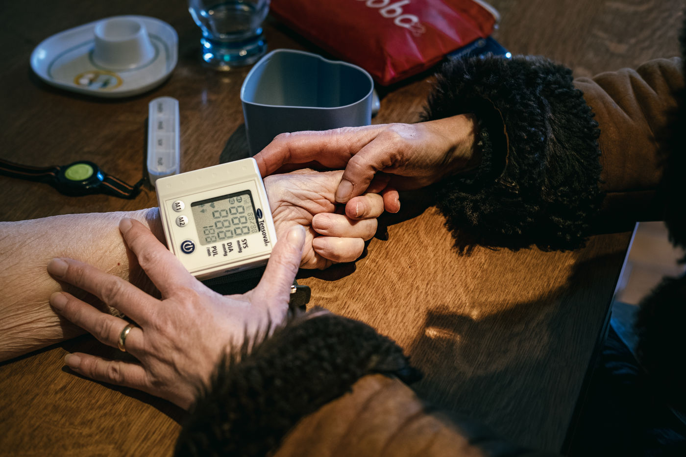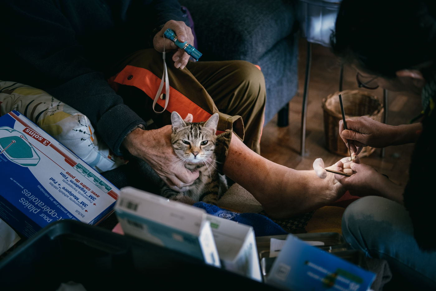 Il est 7h40, Sophie commence sa tournee chez un couple age de 75 ans environ, le mari est diabetique et elle doit donc verifier son taux de glycemie et la bonne prise des medicaments. Chez certains patients, la visite dure seulement deux minutes, pour d autres, selon les pathologies et les soins a effectuer il faut plus de temps. D autres encore ont besoin d etre reconfortes ou de parler tout simplement. Sophie prend alors le temps necessaire, ecoute, rassure, tient une main, serre dans ses bras une patiente... Vers 14h sa tournee du matin s acheve, elle passe alors a son cabinet. Des patients s arretent prendre un rdv. Elle grignote un sandwich prepare par son mari tout en gerant l administratif.