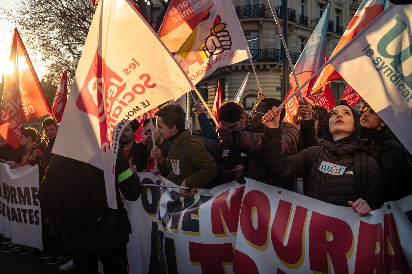 2023, 07, February, Paris (75), FRANCE. Day of mobilisation, strikes and demonstrations to challenge the pension reform planned by Prime Minister Elisa-beth Borne.