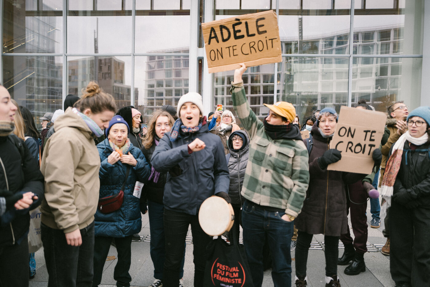 2024 12 09, PARIS (75), France. Around fifty people gathered outside the Paris court on Monday for the opening of the trial of director Christophe Ruggia, accused of sexually assaulting actress Adele Haenel when she was a minor Adele on te croit’ signs.