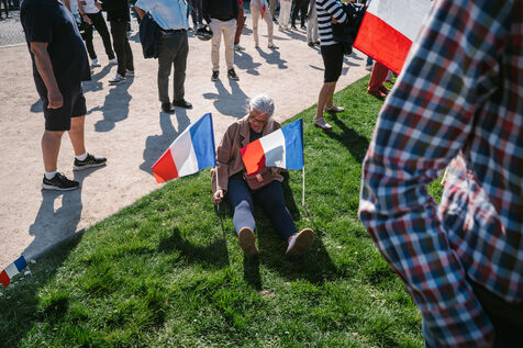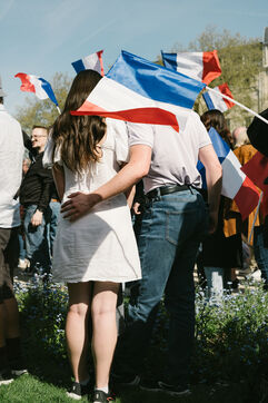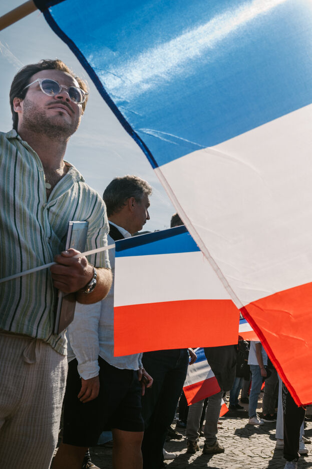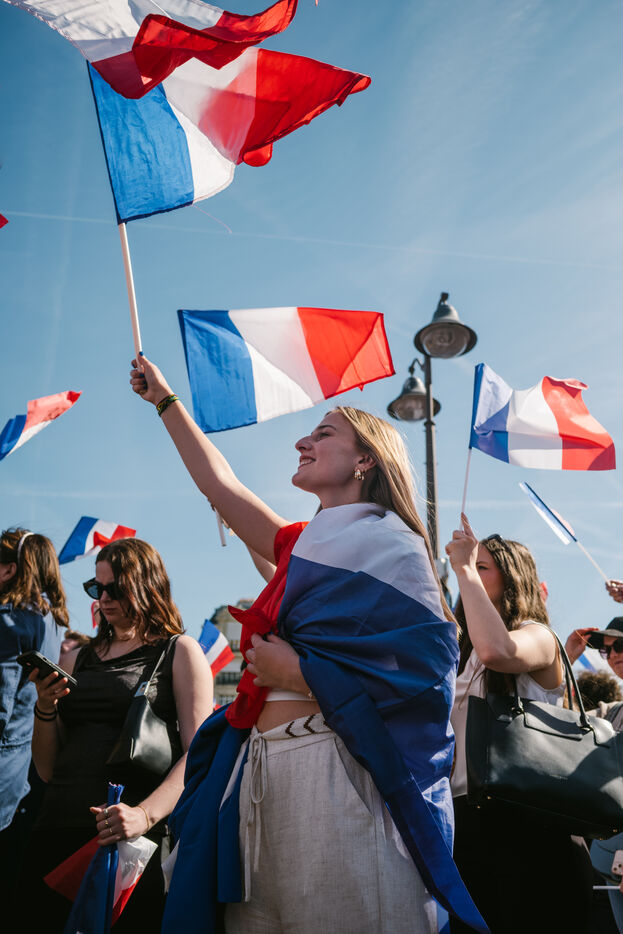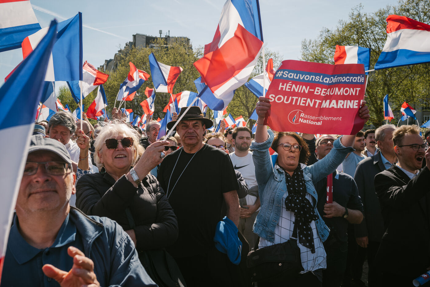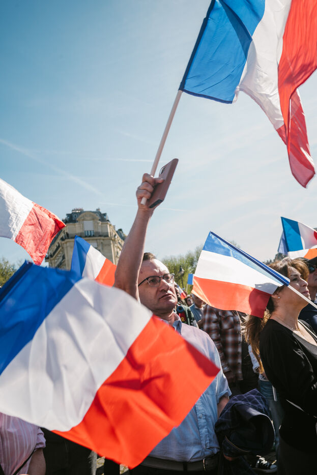 2025 04 06, PARIS (75), France. A rally in Place Vauban in support of Marine Le Pen, after she was sentenced to five years ineligibility, denounced by her supporters as a ‘political decision’. On Monday 31 March, she was found guilty of misappropriating public funds in the case of the Front National's parliamentary assistants at the European Parliament.
