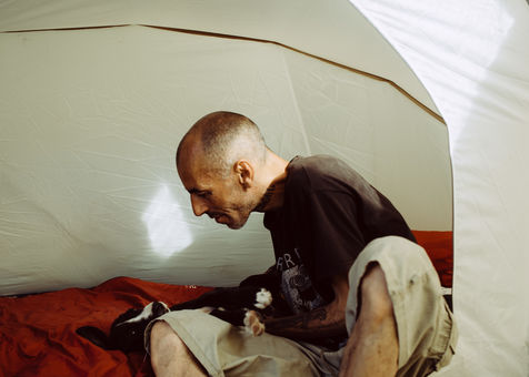 On the other side of the metro line, an imaginary frontier, a few hard drug users had found refuge in a shed that caught fire in troubled circumstances. A new shelter was set up for them to keep them away from the main camp, which is not always easy. It is also on this side that some come to maintain small gardens, to relax, to walk the dogs, or to find themselves on the belvedere which dominates Lille and offers a breathtaking view of the Pasteur Institute. Some are regulars, sometimes activists, others discover the place because of the closing of the parks due to the pandemic.