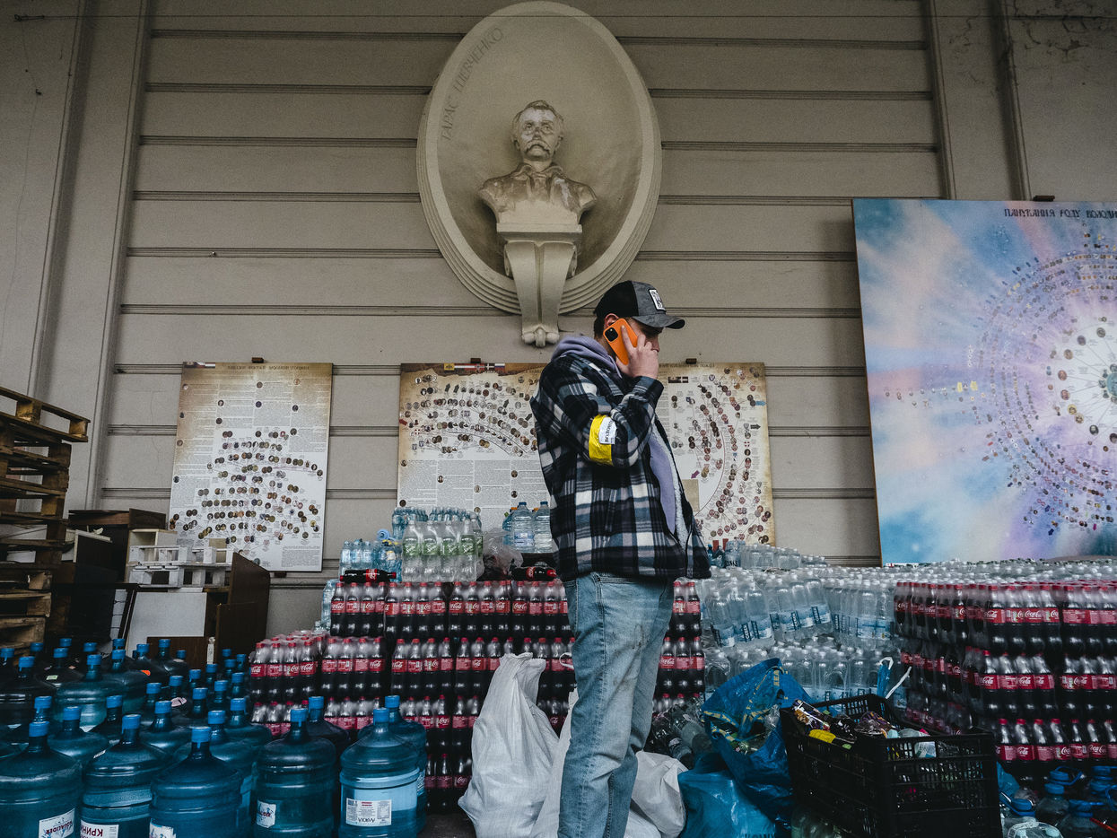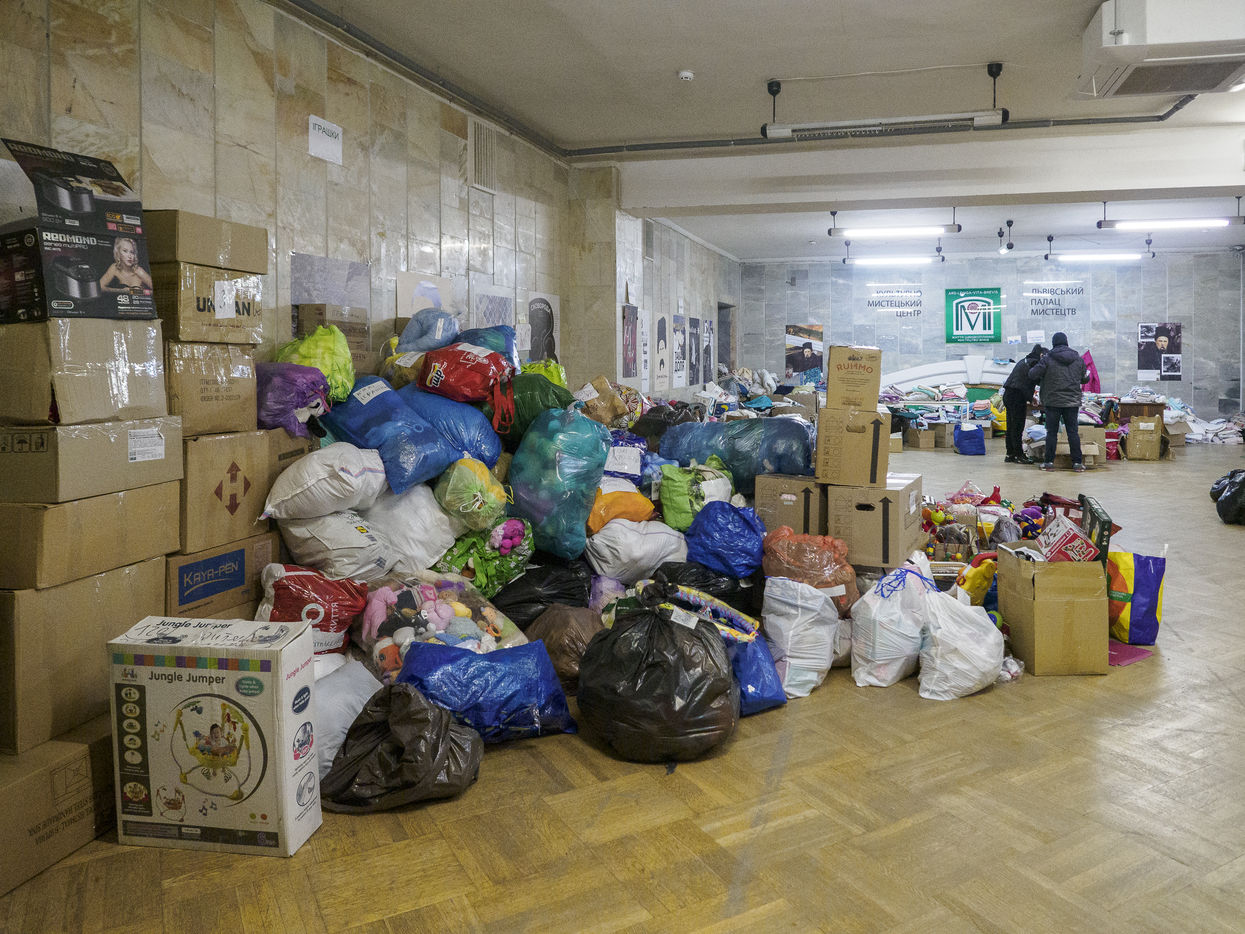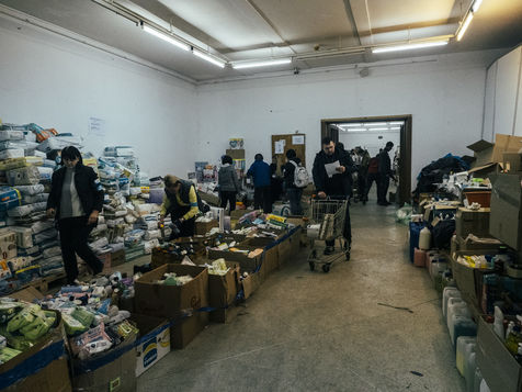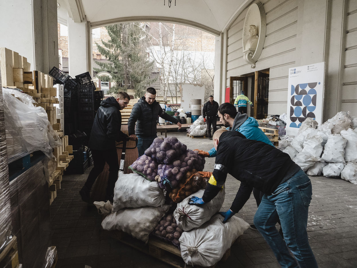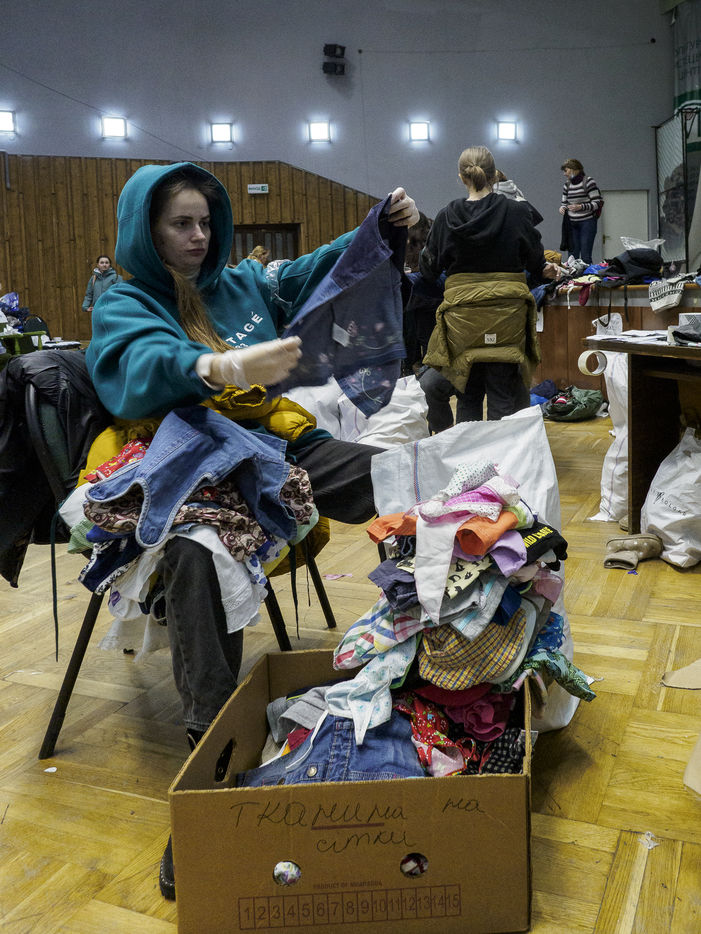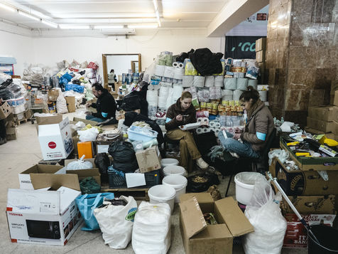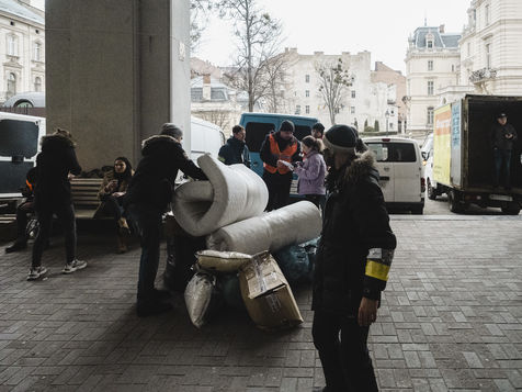 Lviv, Ukraine March 2022. The largest city in Western Ukraine is preparing for war, the whole city is in a state of emergency. The inhabitants begin to hear the sirens of the city to warn of a possible bombardment, even if, for the moment, no bomb has yet pierced the sky of this city of art. In the center, in the old town, the art center was requisitioned by the city to organize a vast humanitarian center run by volunteers. A veritable anthill is active 24 hours a day, every day. : women, men, young people, old people... They started by receiving donations in order to dispatch them to nearby regions, then gradually grew thanks to the influx of European aid to supply the whole country.