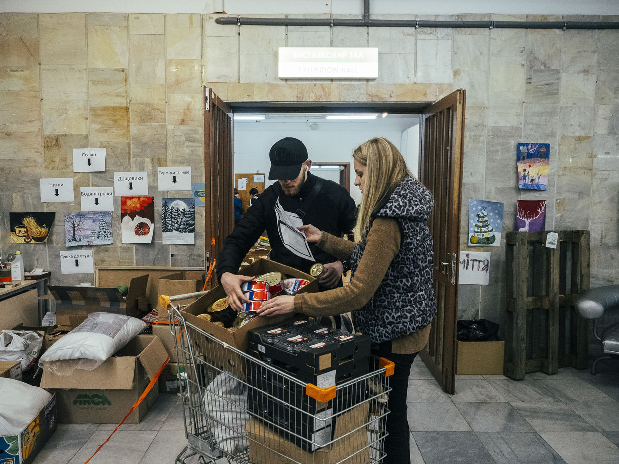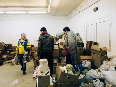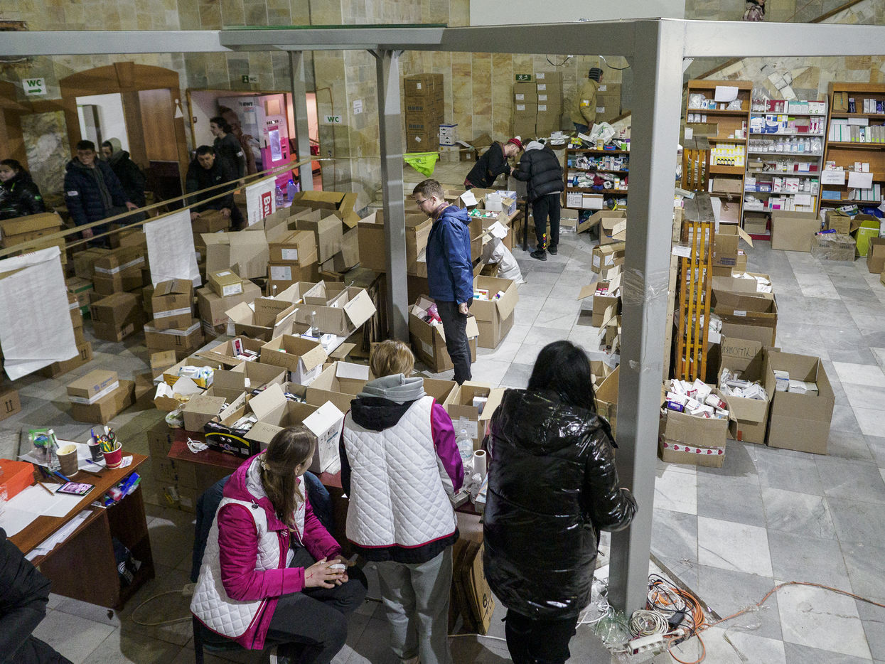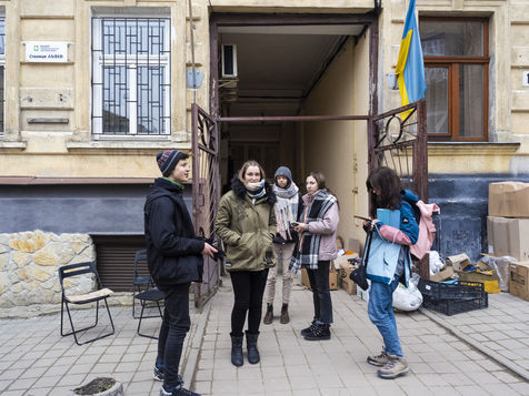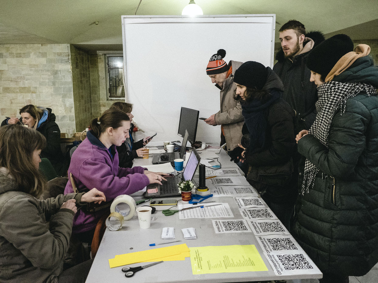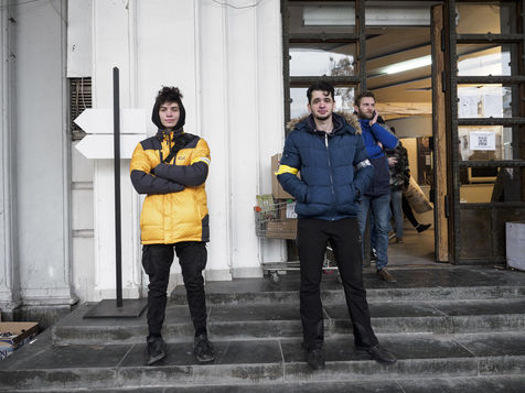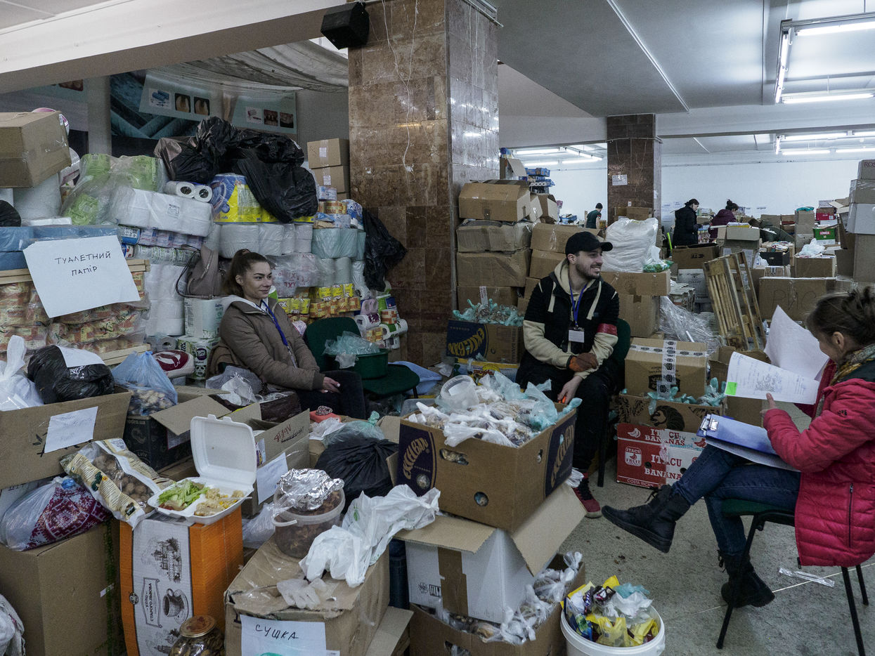 Lviv, Ukraine March 2022. The largest city in Western Ukraine is preparing for war, the whole city is in a state of emergency. The inhabitants begin to hear the sirens of the city to warn of a possible bombardment, even if, for the moment, no bomb has yet pierced the sky of this city of art. In the center, in the old town, the art center was requisitioned by the city to organize a vast humanitarian center run by volunteers. A veritable anthill is active 24 hours a day, every day. : women, men, young people, old people... They started by receiving donations in order to dispatch them to nearby regions, then gradually grew thanks to the influx of European aid to supply the whole country.