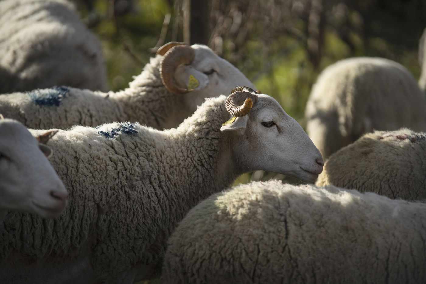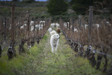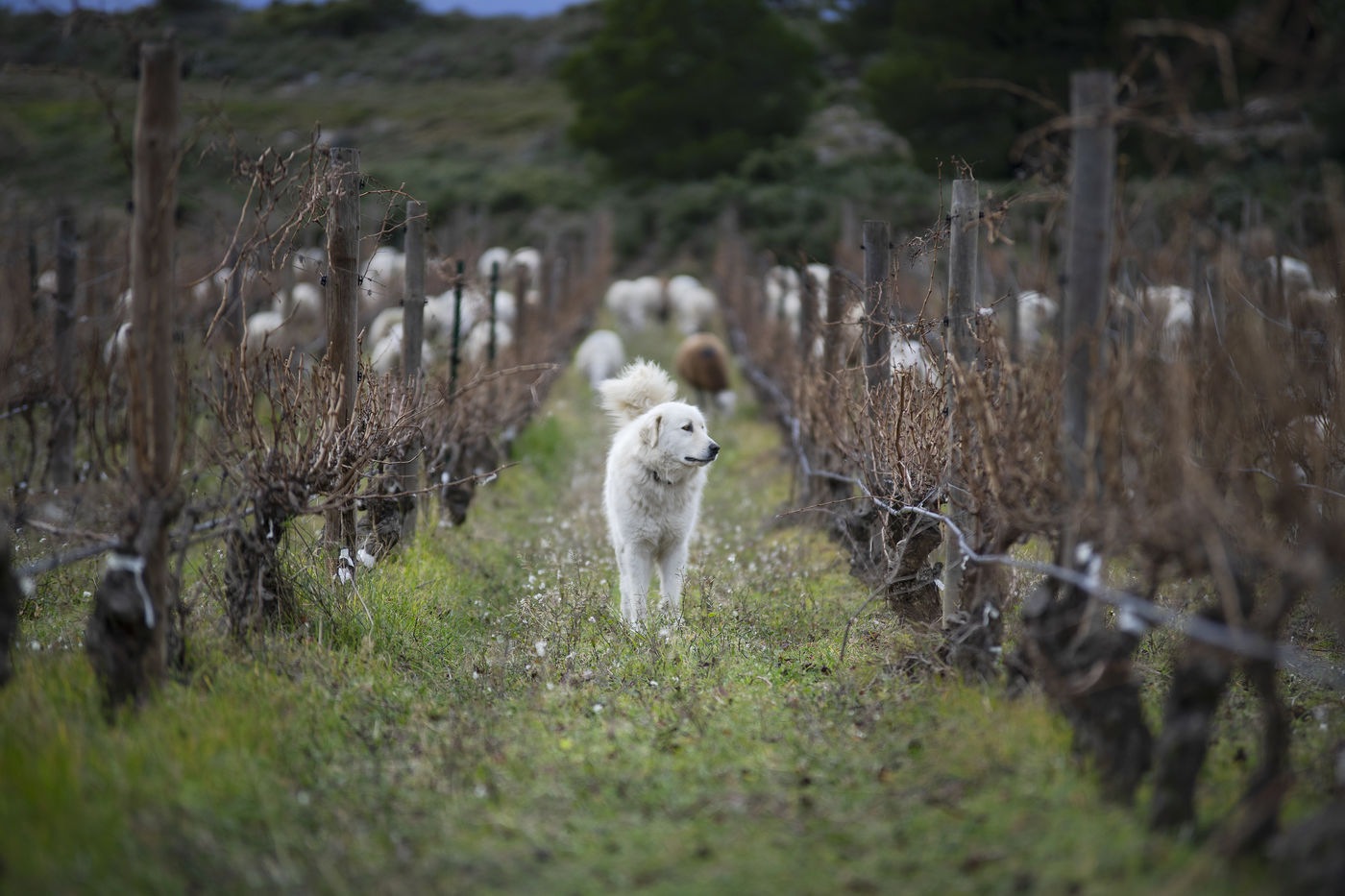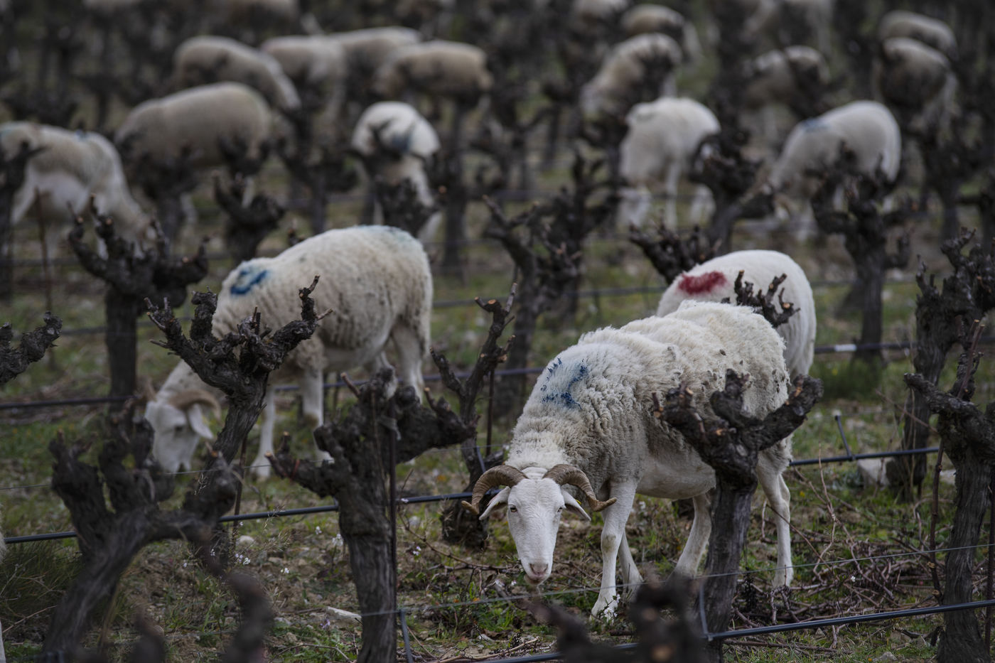 Des moutons paturent dans les rangées de vignes dans la Clape (11) le 21 Janvier 2019.