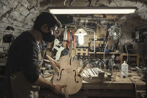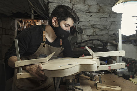 Aurelien Bontemps is an artisan luthier. He designs and manufactures guitars in his workshop in Grabels in Herault. 09 February 2021.