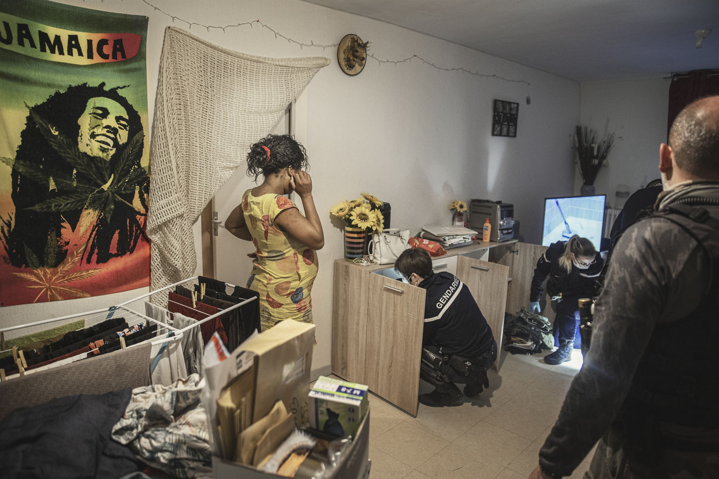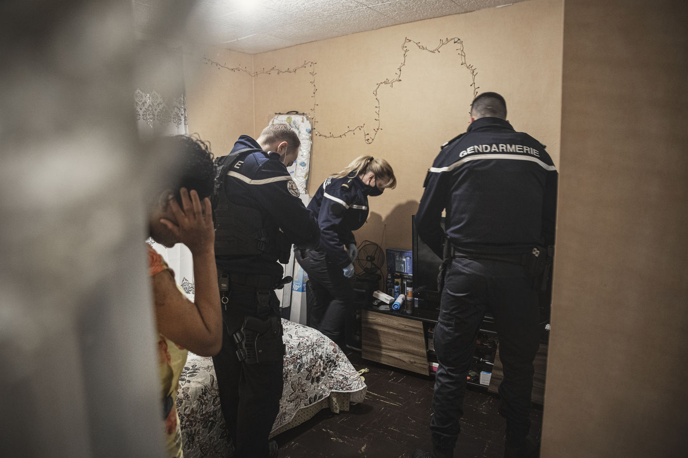Gendarmes invest different halls of buildings in an HLM city of the city of Trèbes in Aude in search of drugs in an investigation for drug trafficking.