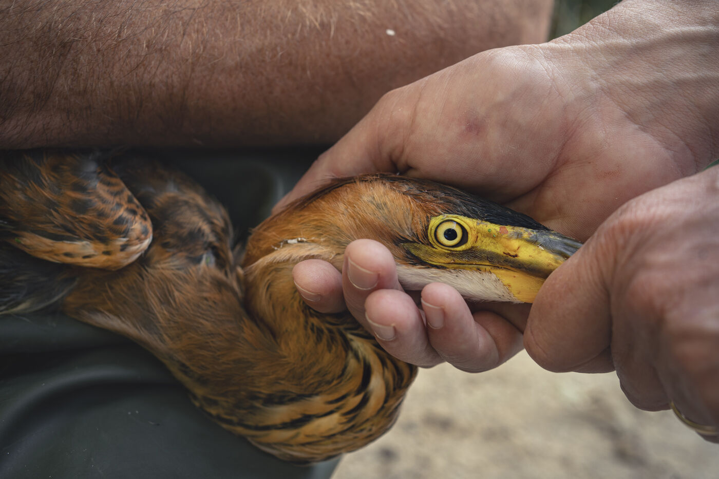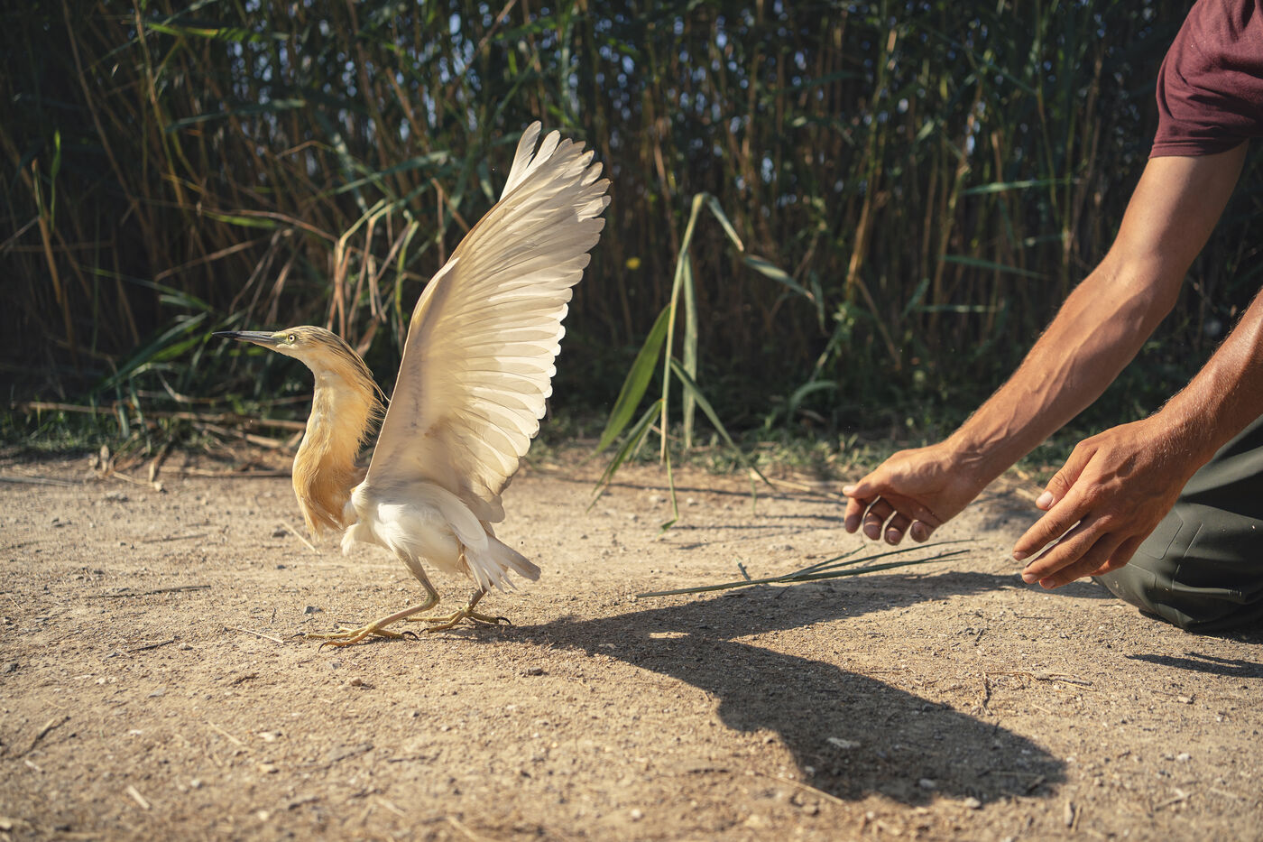 Reportage avec des ornithologues lors de la pose de balises GPS sur des oiseaux proteges dans la réserve naturelle du Scamandre dans le Gard, dans le cadre du projet Migralion qui permet de mesurer le flux migratoire de la faune volante au dessus de la mer méditerannée et l'impact dans le développement de projets éoliens offshore.