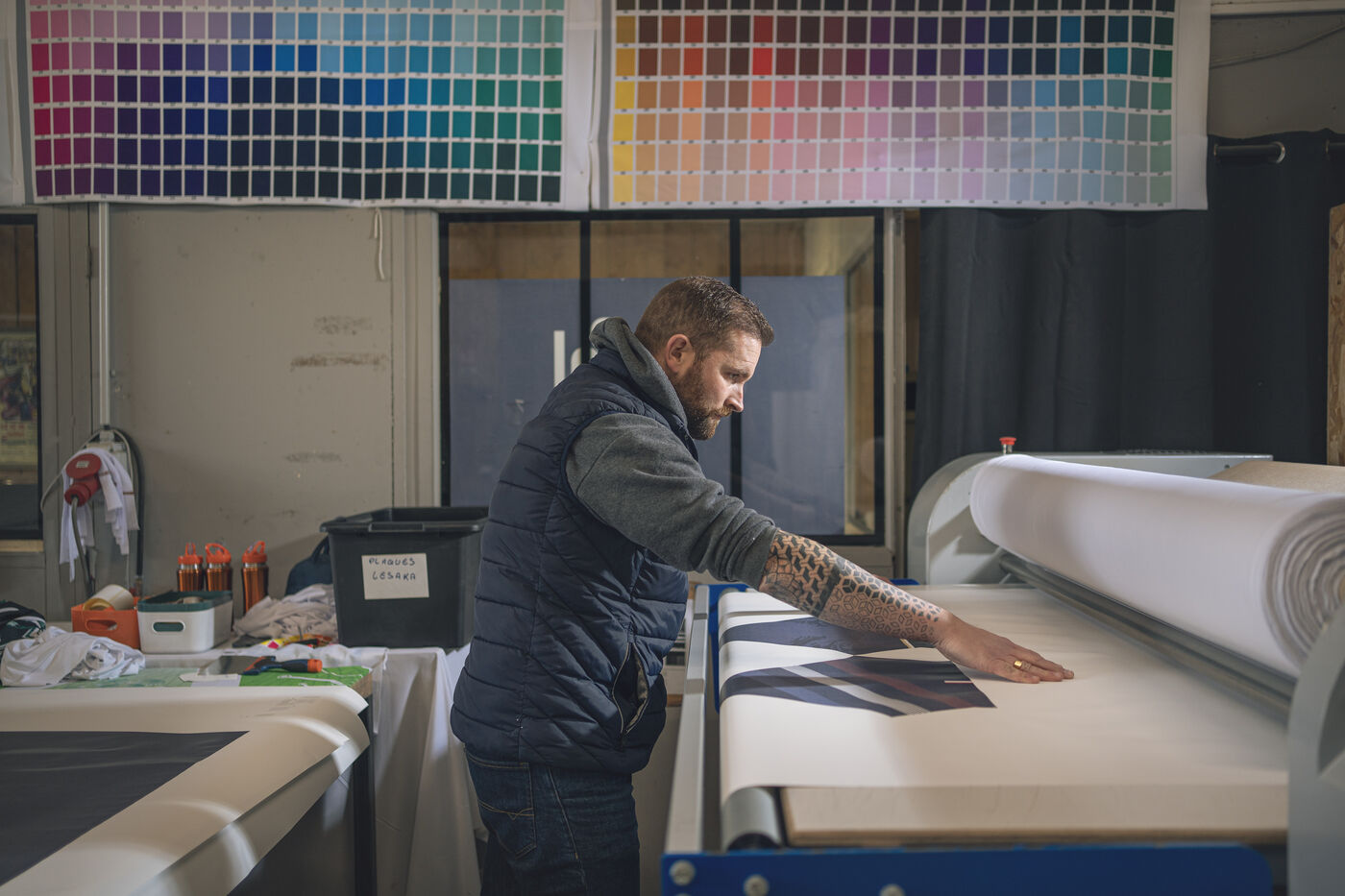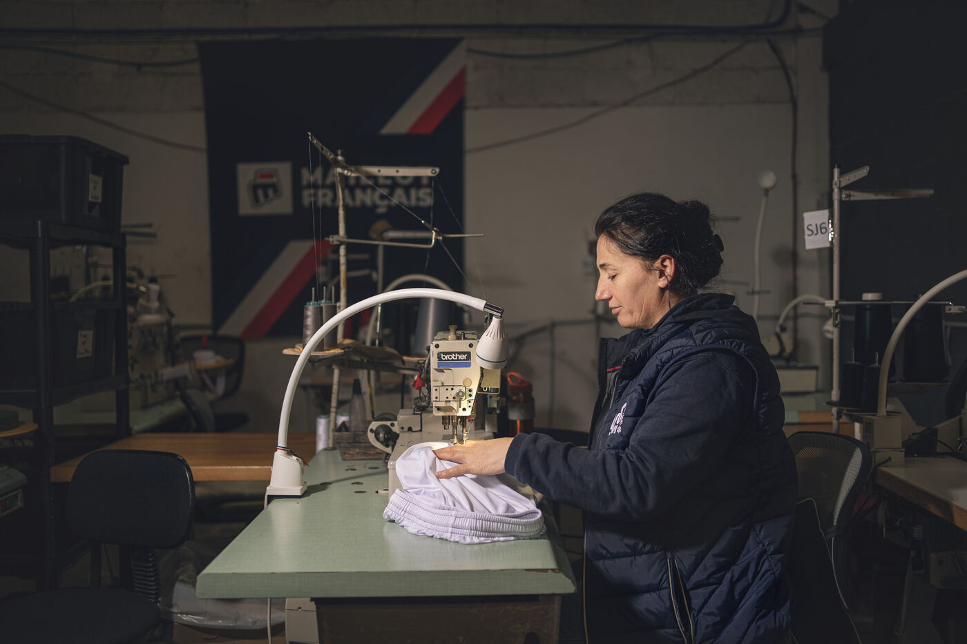 Dans les locaux de l'entreprise de textile LCS (La Crémerie Sérigraphie) fabriquant de la marque de vêtement le Maillot Francais labellisé "Origine France Garantie".