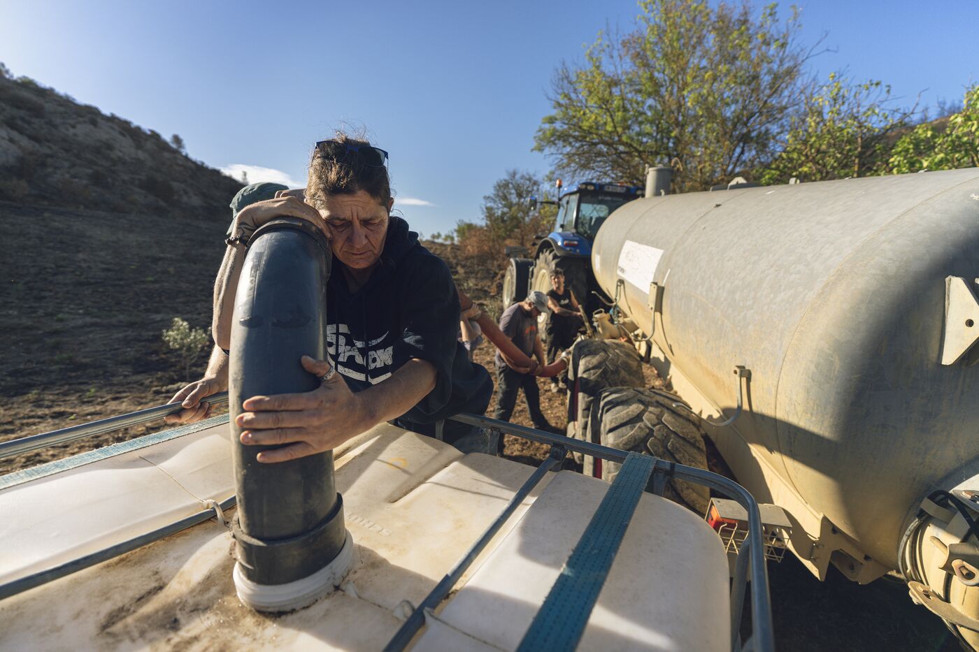 While 2,500 partygoers stirred the ashes to staccato rhythms, on the other side of the hill, volunteers came to the aid of a farmer by watering the olive trees burned during the Corbières fire, which ravaged everything in its path across 17,000 hectares. The Beauregard Peasant Third Place has taken on the mission of helping farmers affected by the most significant fire in over 50 years. It receives, plans, and organizes projects throughout the region. On this project, it was necessary to find water on land where droughts accumulate over time. Then, it had to be transported to the village of Fontjoncouse, in an attempt to save the olive trees in this devastated valley.