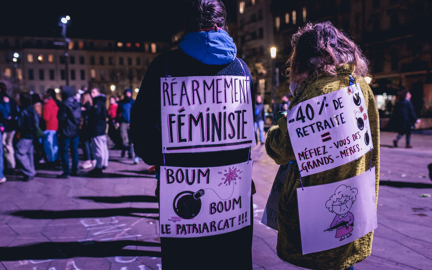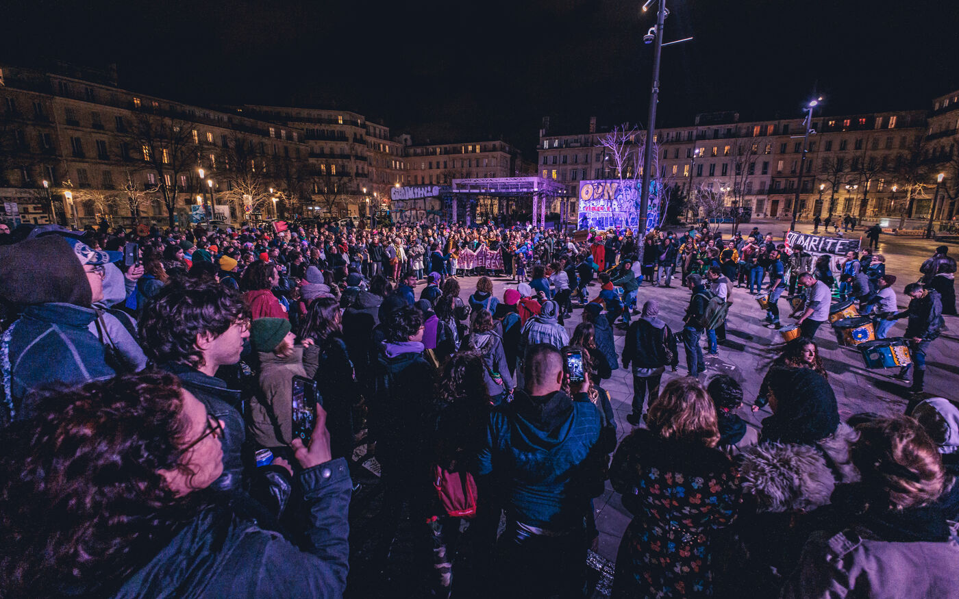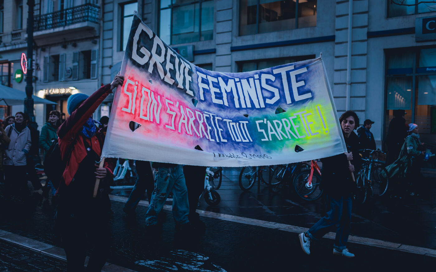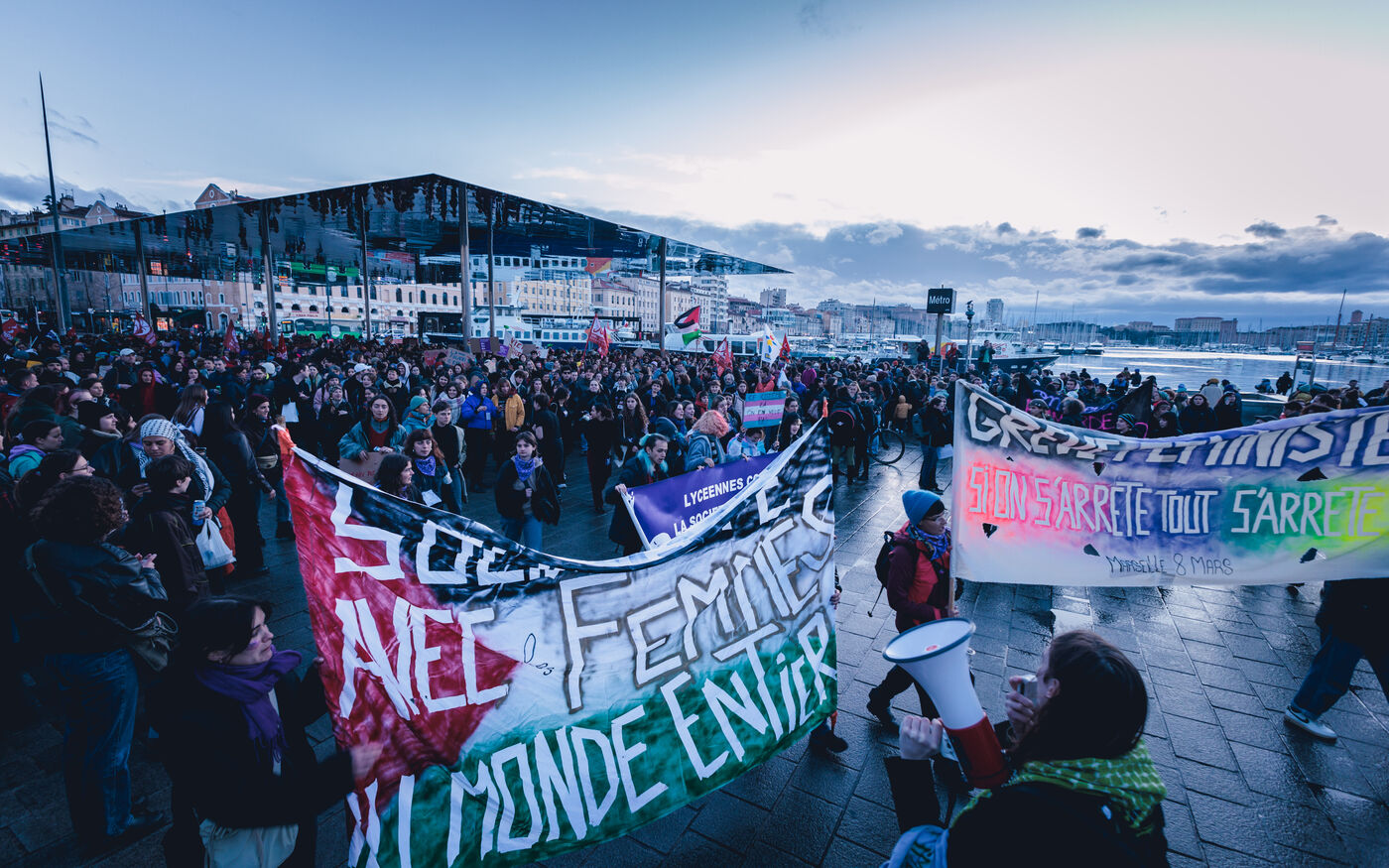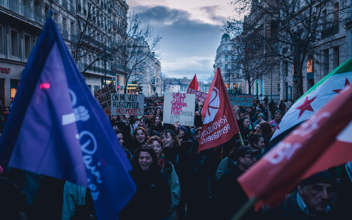 La manifestation met en lumiere les luttes pour l’egalite des genres et les droits des femmes et repond a un appel national a la greve feministe pour denoncer les violences sexistes et les inegalites salariales.