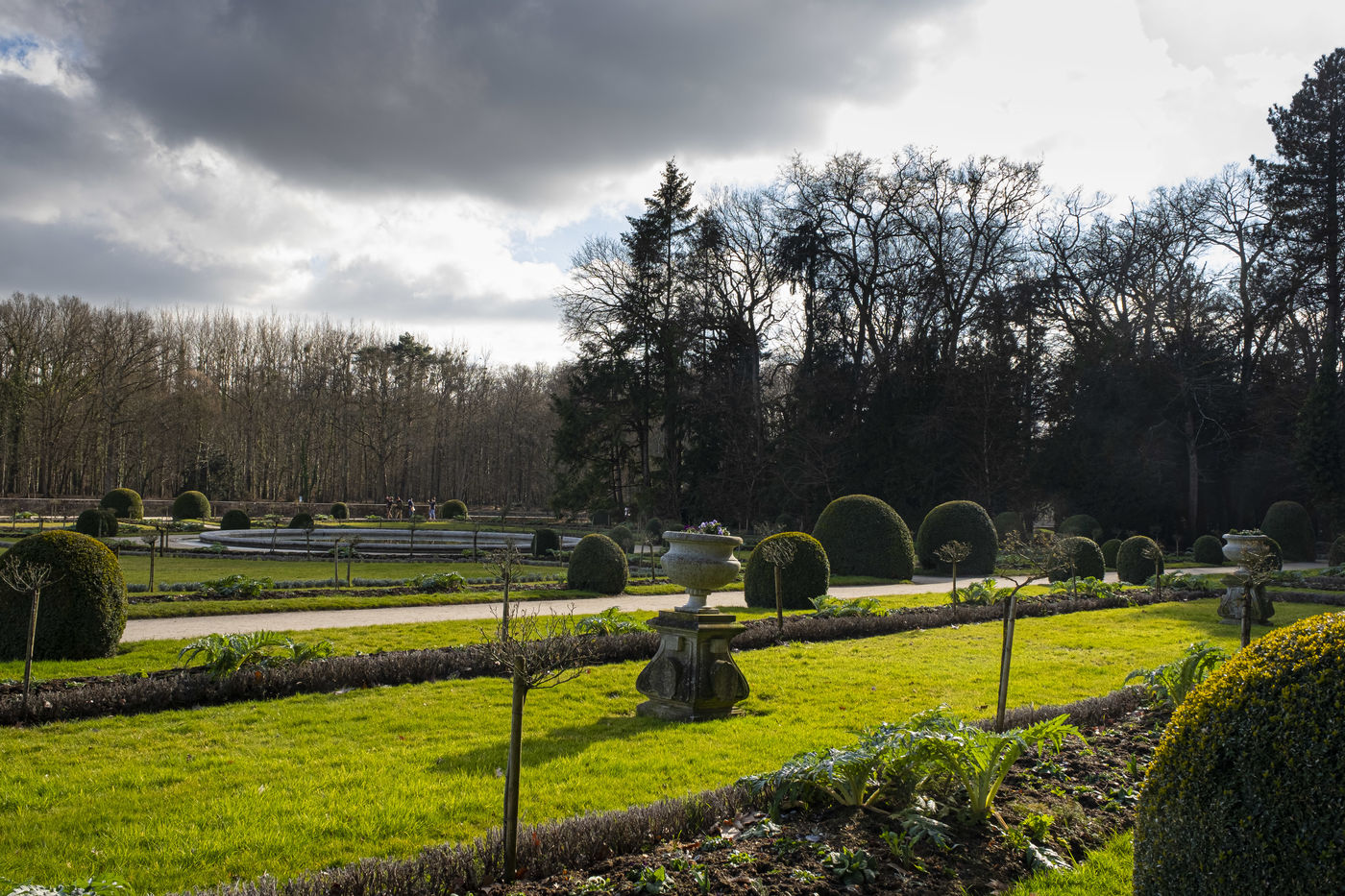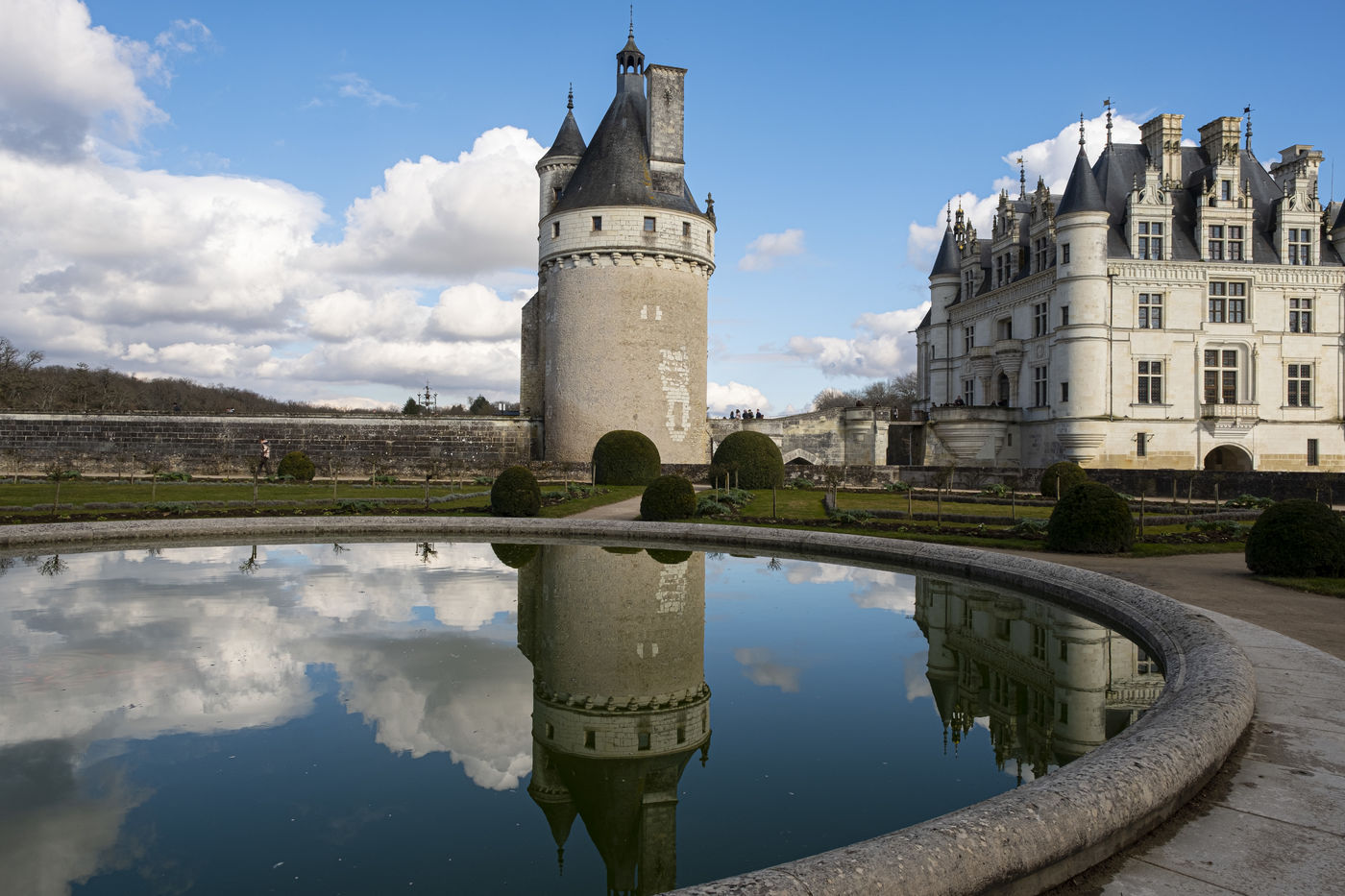 Vues du Château de Chenonceau, château de la Loire sur le Cher , de son jardin et de son parc en hiver .